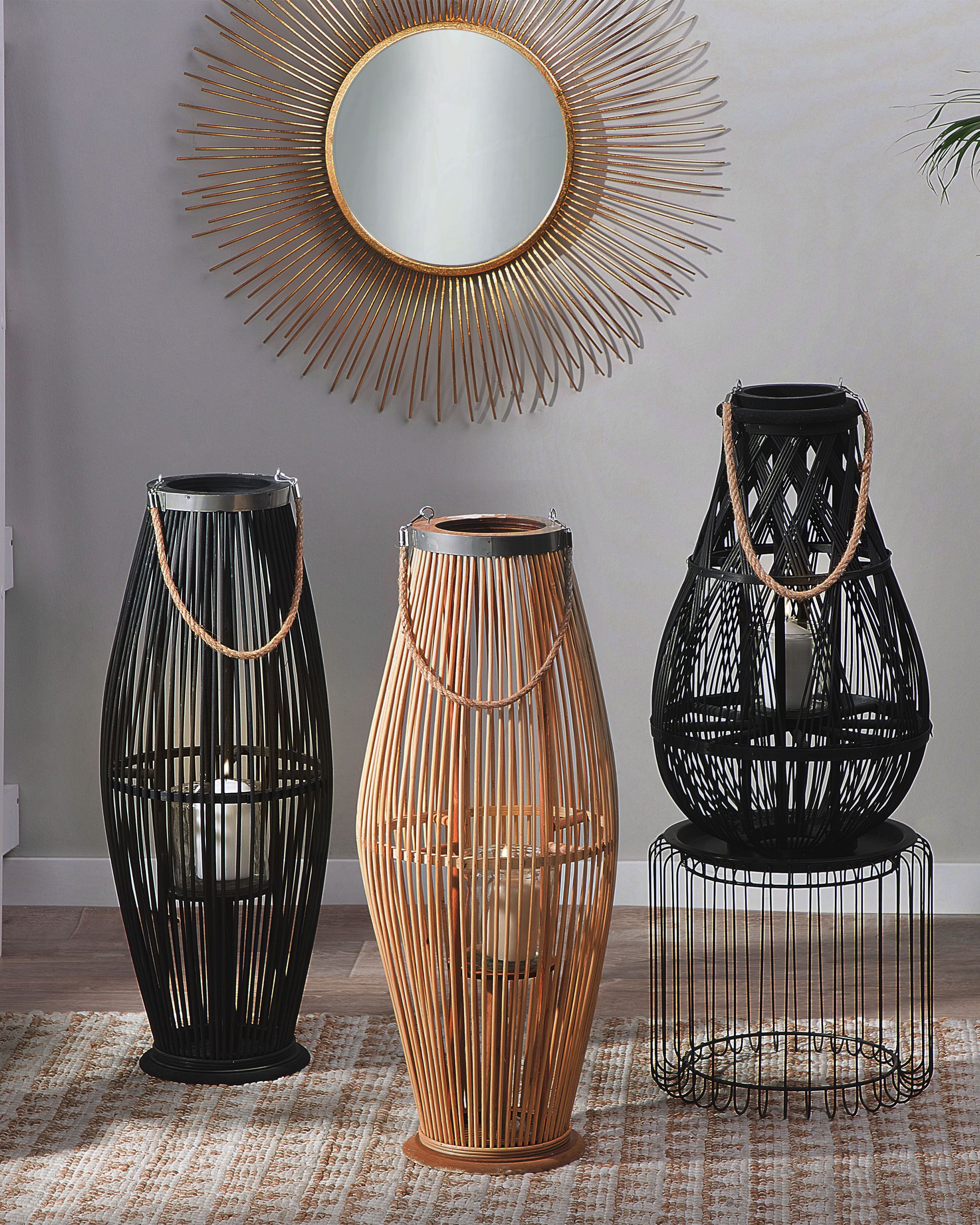 Boho-tyylinen koristelyhty. Tämä korkea, tyylikäs lyhty on täydellinen lisävaruste kesäisen tunnelman tuomiseen mihin tahansa sisä- tai ulkotilaan. Se on valmistettu punotusta pajupuusta häkkimäiseksi rakenteeksi ja se sopii hyvin yhteen minkä tahansa luonnollisen koristeen tai puusta valmistetun kalusteen kanssa. Ihanteellinen täydentämään boho-tyylistä huonetta tai eteistä.