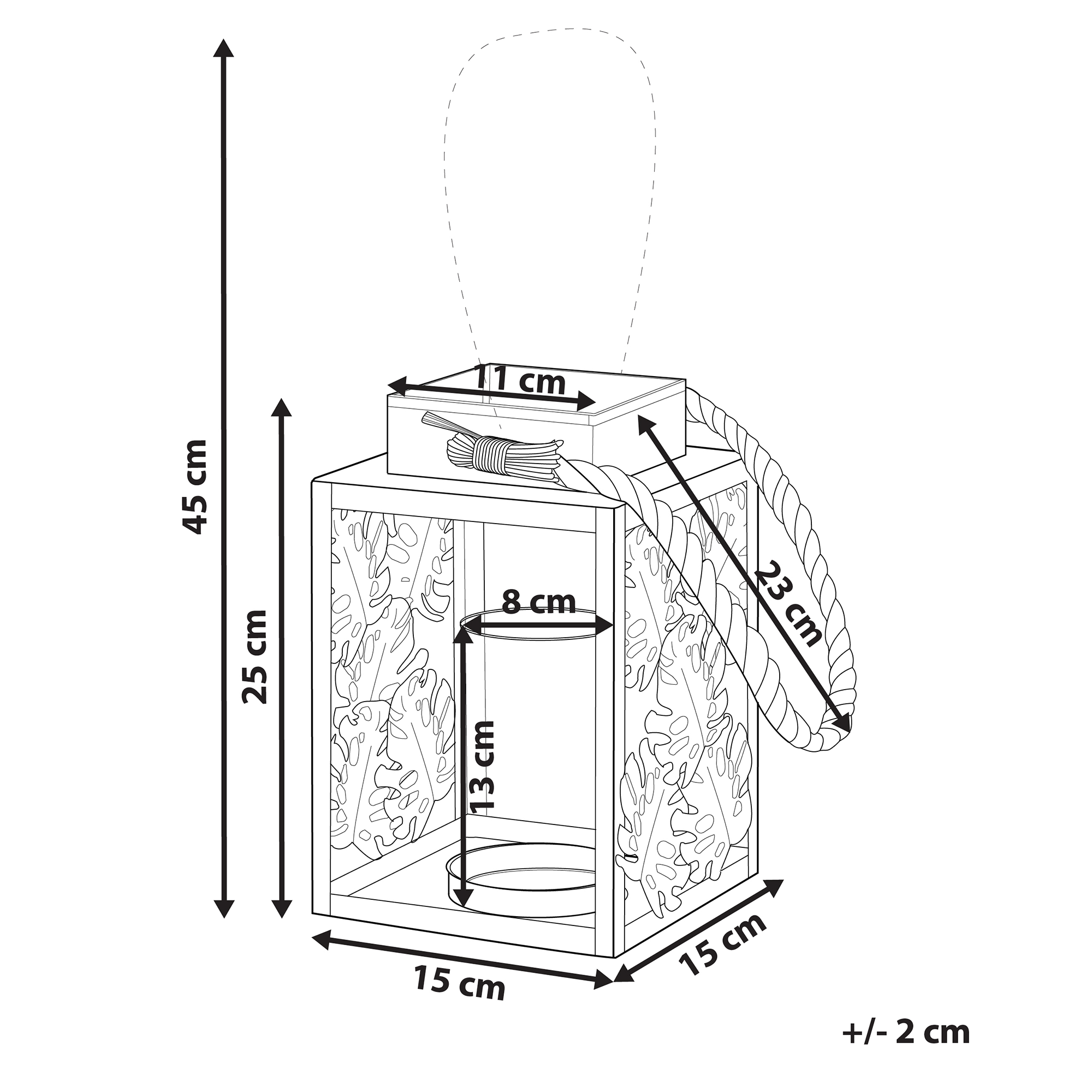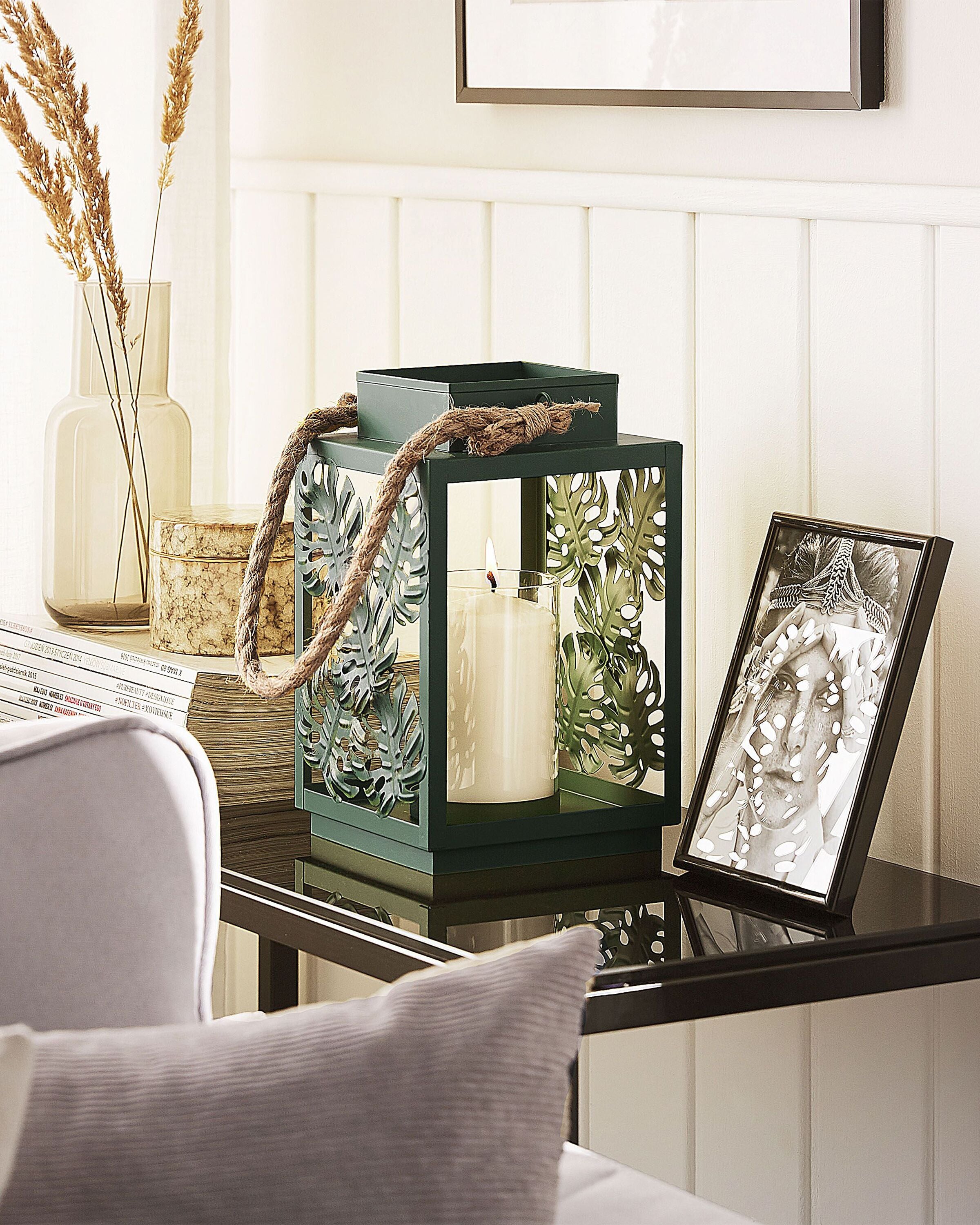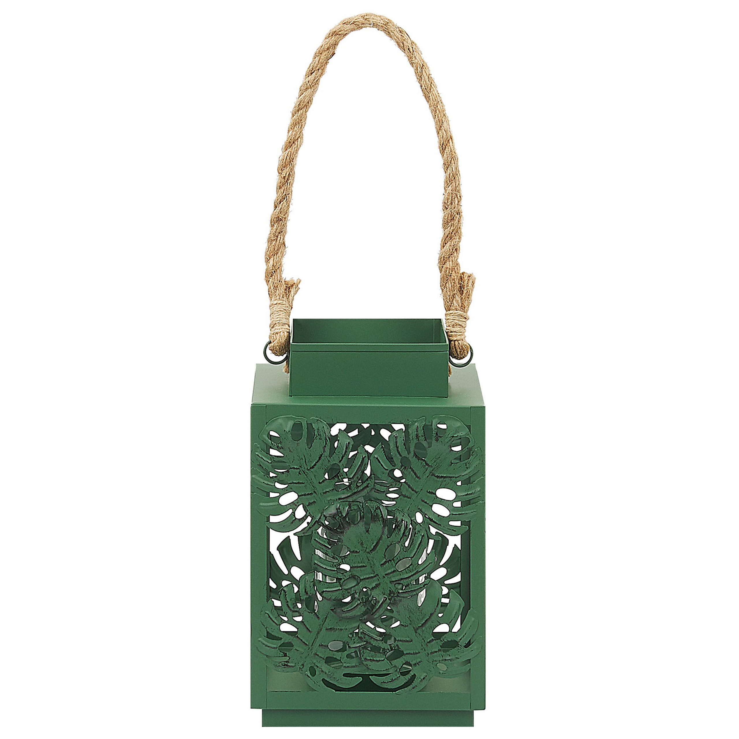 Koristeellinen kynttilälyhty. Luo kotiisi kotoisaa tunnelmaa tällä kauniilla lyhdyllä. Vihreä väri ja lehtikuviot tekevät lyhdystä kauniin koristeen erityisesti boho-tyylisiin sisustuksiin. Lyhdyn sisällä on lasinen kippo, jonne voit asettaa kynttilän, jolloin lempeä valo muodostaa kauniita varjoja ympäröivään tilaan.