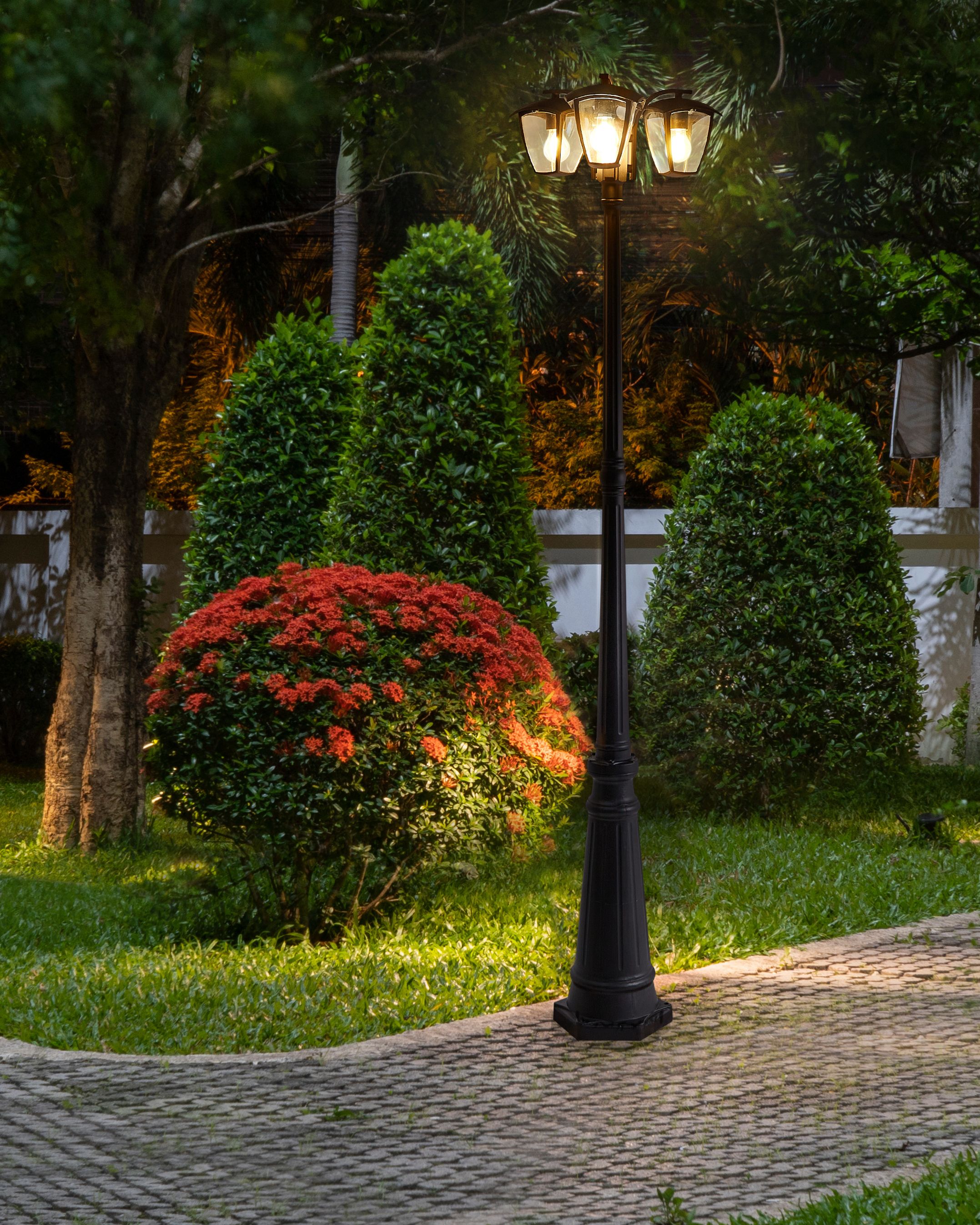 Puutarhavalaisin kolmella valolla. Valaise ulkotilaasi tällä lyhtypylväällä, joka on valmistettu kestävästä alumiinista sekä korkealaatuisesta synteettisestä materiaalista, taaten pitkäaikaisen toimivuuden. Vesitiiviin rakenteensa ansiosta se sopii erinomaisesti puutarhaan tai terassille ja tarjoaa luotettavaa valaistusta myös ankarassa säässä. Tämä moderni lyhtypylväs valaisee vaivattomasti ulkotiloja, kiitos sen tyylikkään mutta vankan rakenteen.