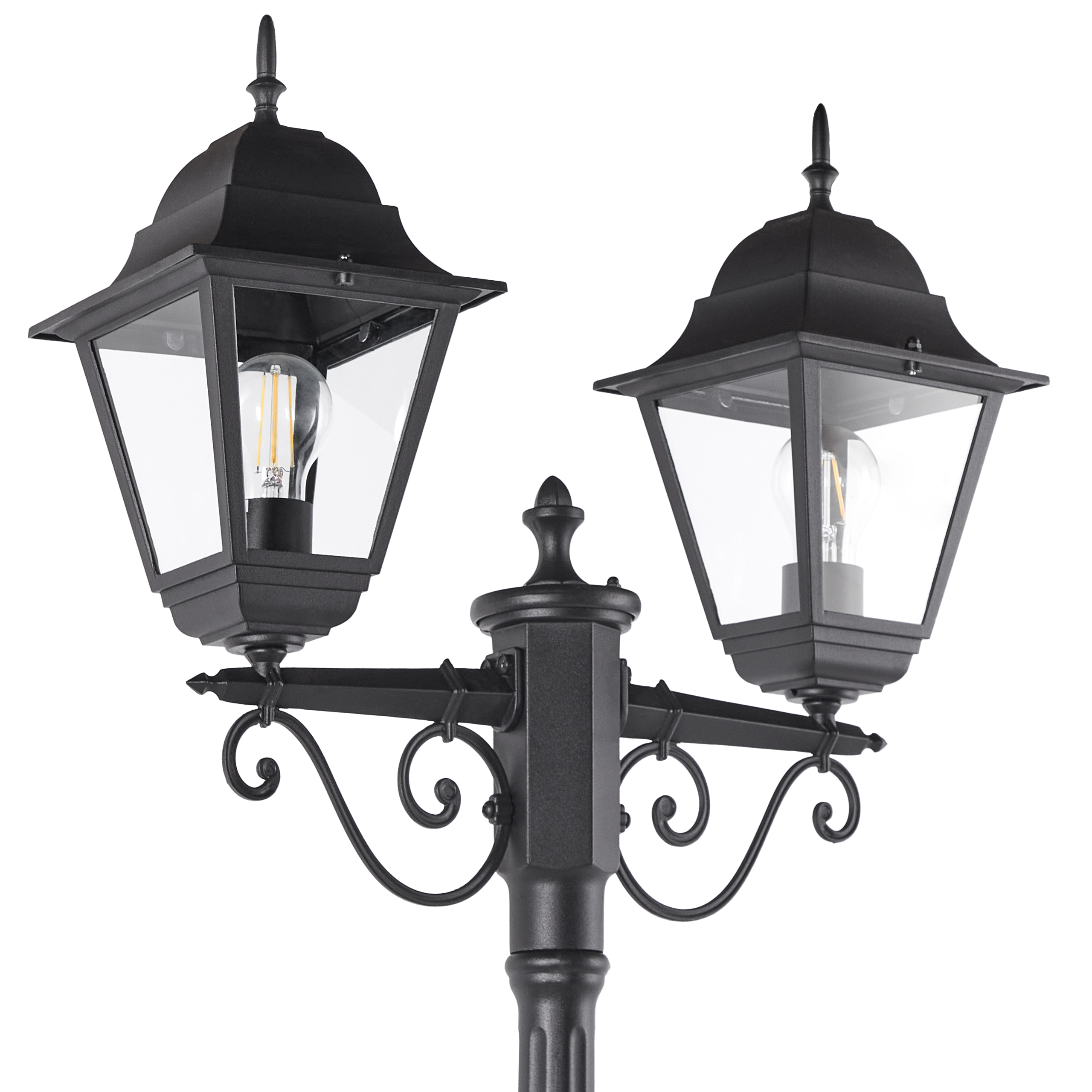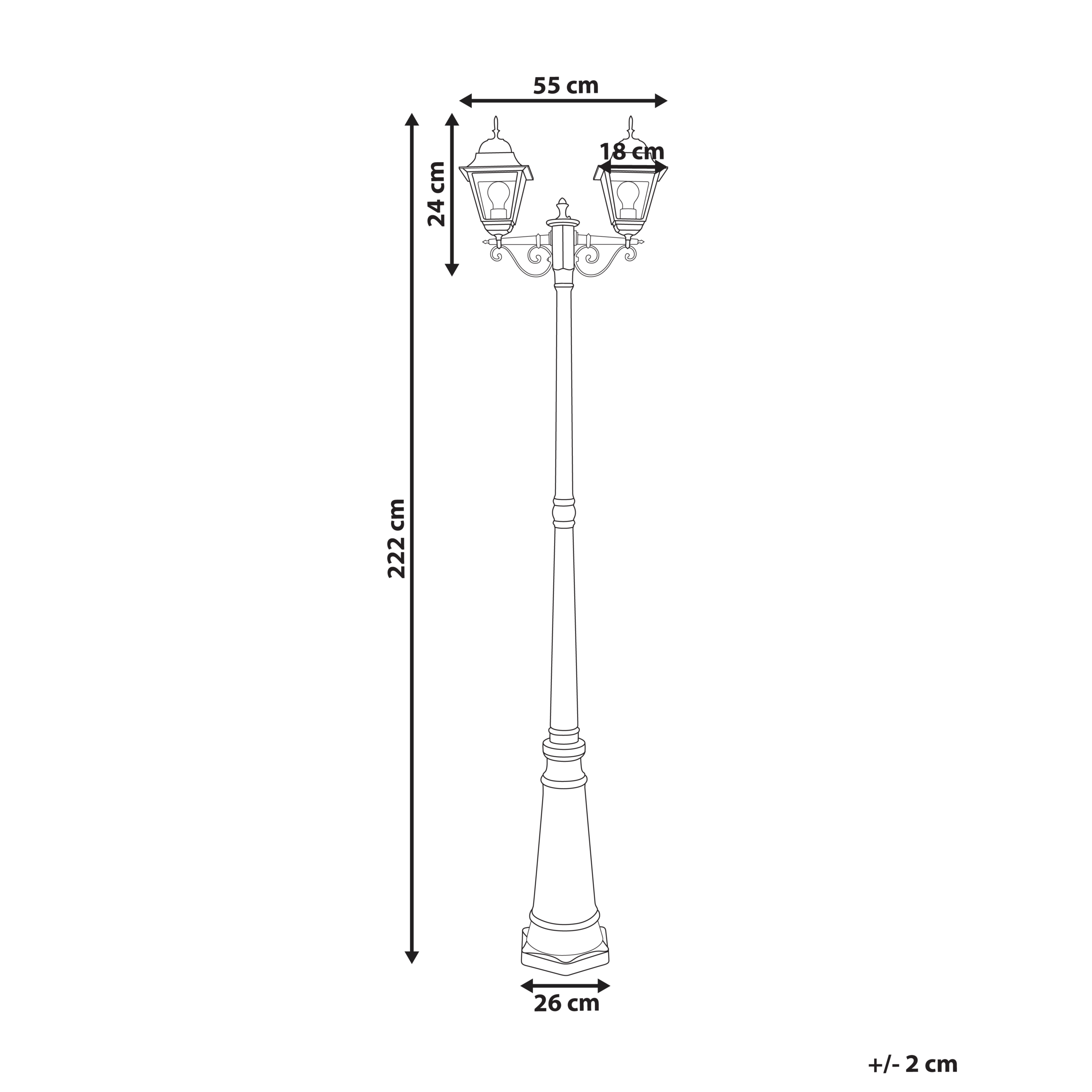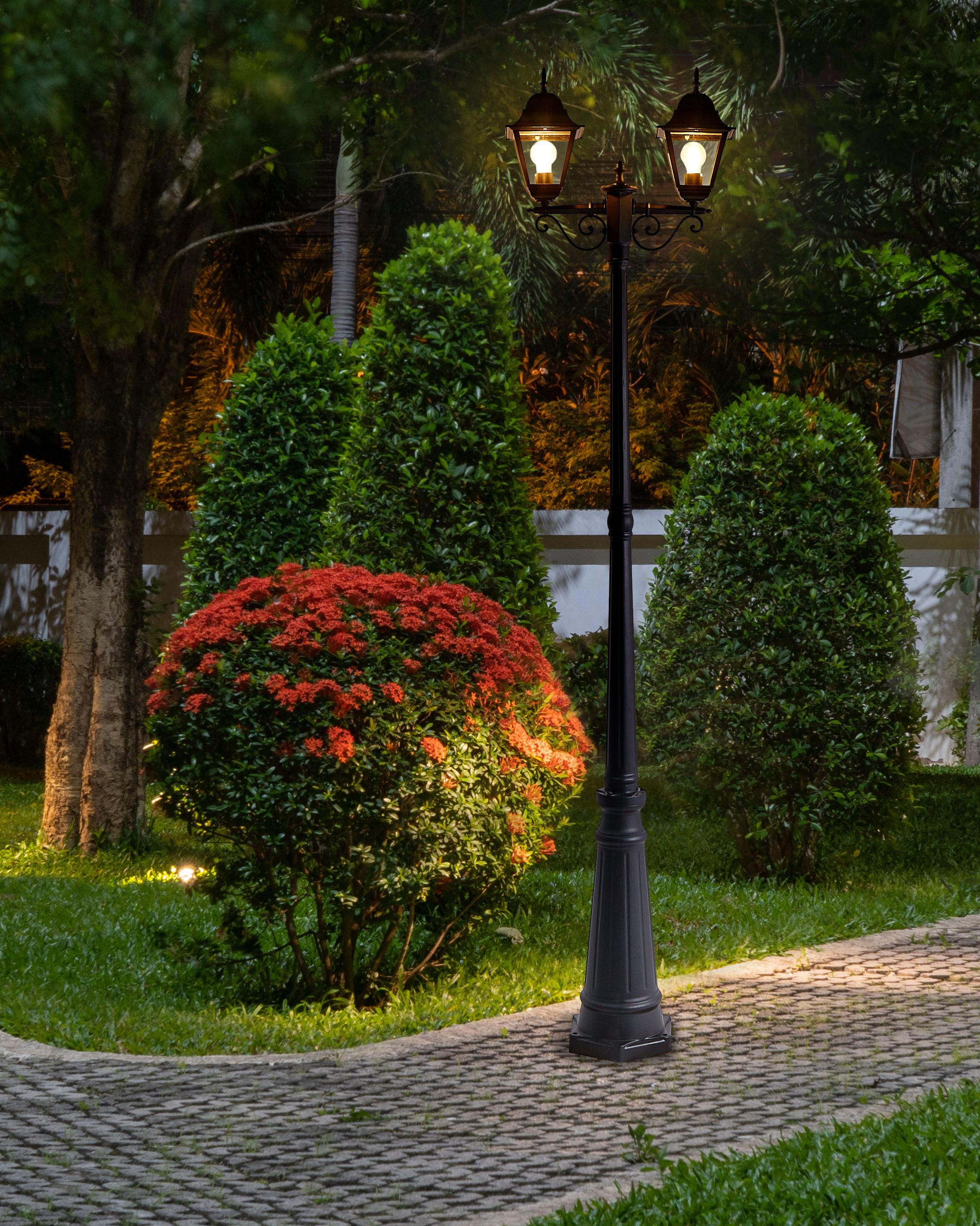 Retrotyylinen lyhtypylväs kahdella valolla. Päivitä ulkotilaasi tällä tyylikkäällä 2-valoisella lyhtypylväällä, viehättävällä vintage-muotoilulla, joka tuo ripauksen ajatonta hienostuneisuutta. Kestävästä alumiinista ja lasista valmistettu valaisin yhdistää klassisen estetiikan sekä modernin kestävyyden. Sen vedenpitävä rakenne takaa luotettavan valaistuksen erilaisissa sääolosuhteissa, joten se sopii erinomaisesti puutarhaan, terassille ja kulkuväylille. Siron siluettinsa ja lämpimän valaistuksensa ansiosta tämä lyhtypylväs ei ole pelkkä valonlähde vaan upea koristeellinen elementti mihin tahansa ulkotilaan.
