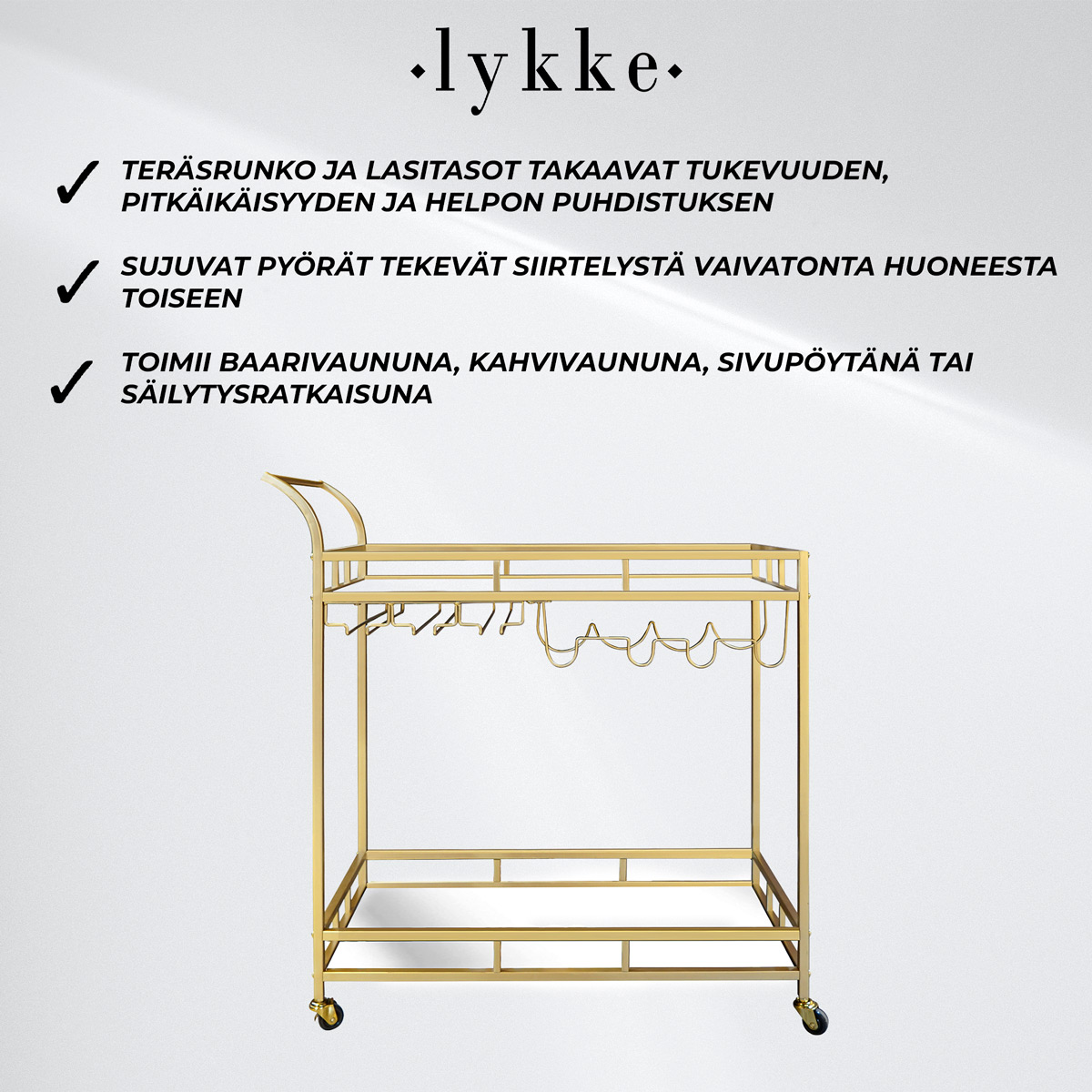 <p>Tyylikkäästi suunniteltu Lykke Baarikärry yhdistää modernin eleganssin ja käytännöllisyyden luoden täydellisen lisän mihin tahansa tilaan. Rakennettu kestävistä materiaaleista ja viimeistelty kultaisella pintakäsittelyllä, tämä baarikärry ei ainoastaan näytä upealta, vaan se on myös erittäin toiminnallinen. Helposti liikuteltava ja monipuolinen, Lykke Baarikärry soveltuu niin juhlien emännöintiin kuin illanviettoihin kotona. Tyylikkyyttä, joka kääntää katseet ja tekee tarjoiluhetkistä ainutlaatuisia.</p>