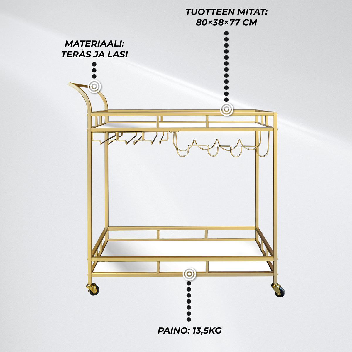 <li><strong>Elegantti kultainen viimeistely:</strong> Kirkas kulta viimeistely tekee tästä baarikärrystä näyttävän keskipisteen missä tahansa huoneessa.</li>