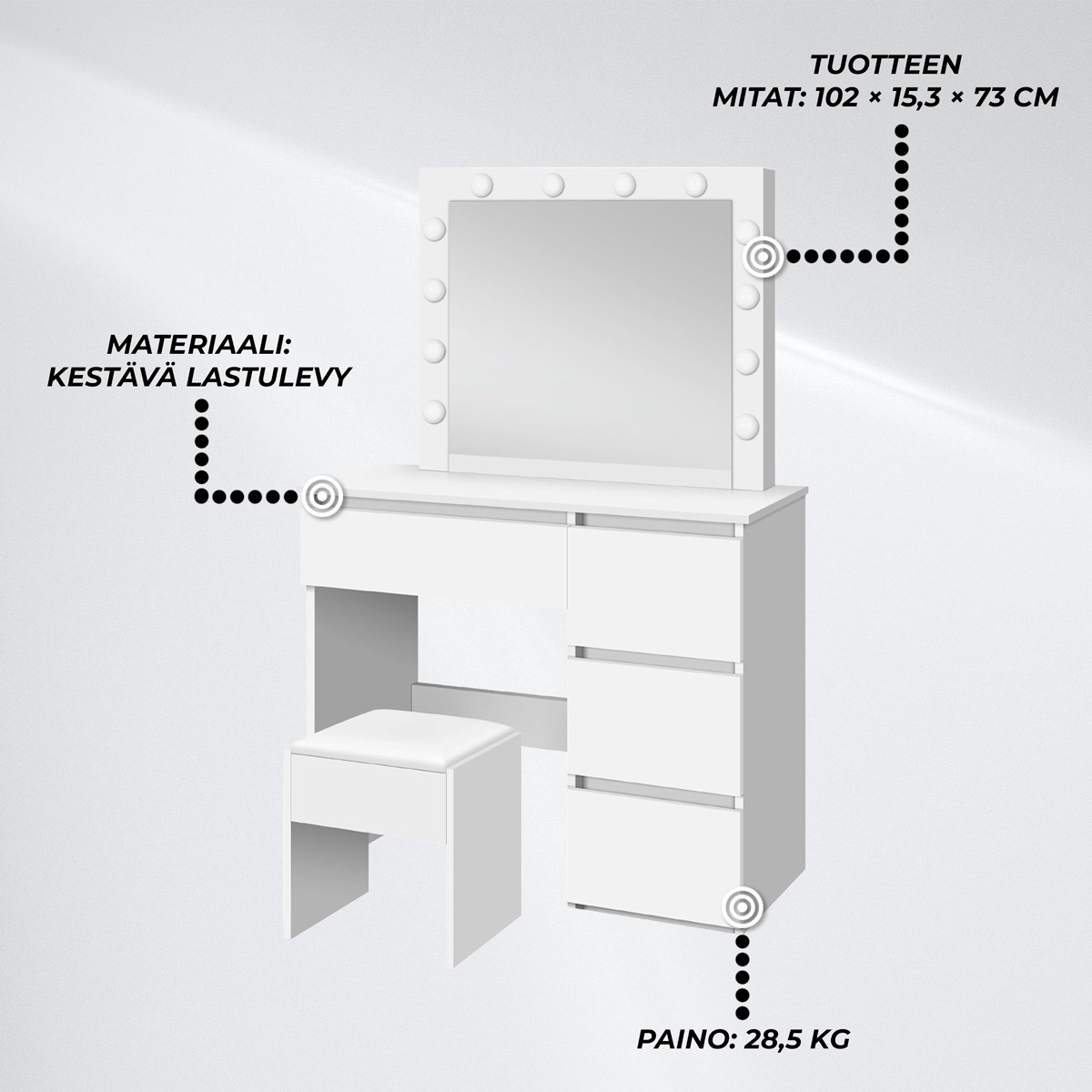 Monikäyttöisyys – Toimii meikkipöytänä, kampauspöytänä ja peilipöytänä samassa paketissa. Täydellinen valaistus – Kolme LED-sävyä tarjoavat ammattitason valaistuksen meikkaamiseen. Käytännöllinen säilytys – Neljä laatikkoa pitävät kaikki kosmetiikat ja tarvikkeet järjestyksessä. Valmis kokonaisuus – Toimitukseen sisältyy meikkijakkara, joka täydentää tyylikkään kokonaisuuden. Kestävä ja kevyt – Tukeva lastulevyrakenne on pitkäikäinen ja helposti liikuteltava. Tyylikäs ulkonäkö – Moderni valkoinen väri sopii täydellisesti kaikkiin sisustuksiin ja lisää tilan valoisuutta. Korkea käyttömukavuus – Käytännöllinen korkeus ja valaistus tekevät jokaisesta meikkaushetkestä nautinnollisen.