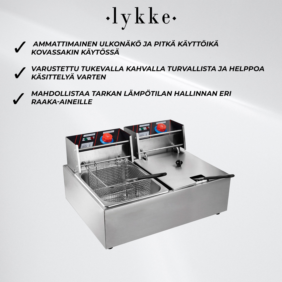 <p>Lykke Rasvakeitin 6+6 l, 5 kW on oikea valinta, kun tarvitset kapasiteettia ja hallintaa ilman kompromisseja. Kaksoissäiliö mahdollistaa kahden eri ruokalajin valmistuksen rinnakkain tai suuremman tuotantomäärän yhdellä kertaa. Ruostumattomasta teräksestä valmistettu runko ja 304-teräksiset korit tukevat hygieenistä työskentelyä ja pitkää käyttöikää.</p>