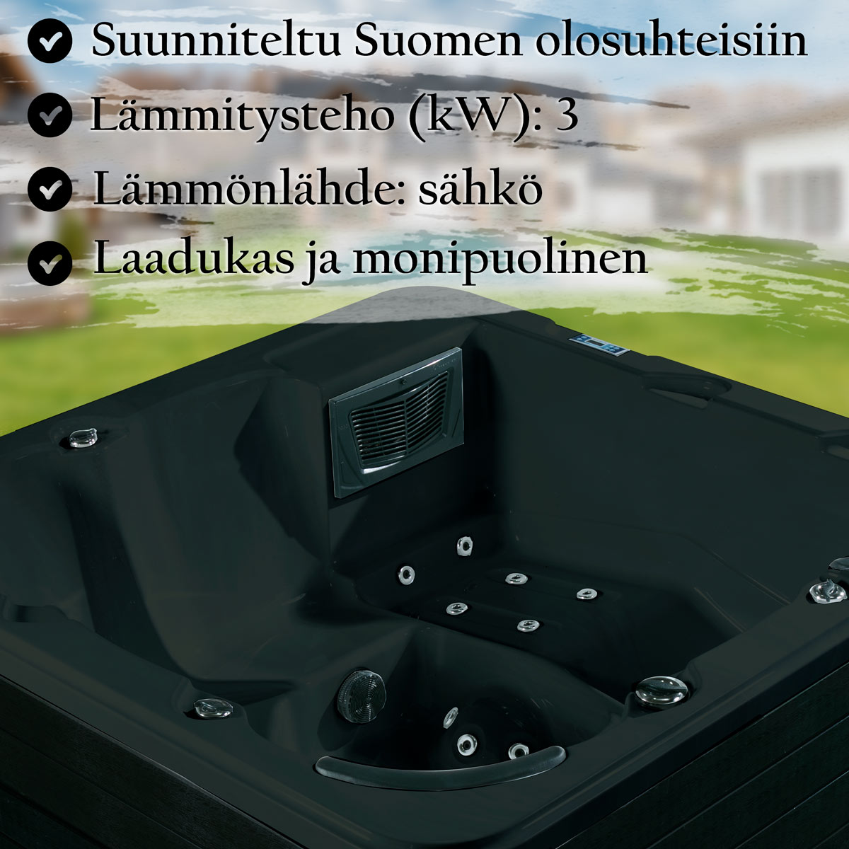Lykke ulkoporeallas Polar on varustettu 3kW lämmittimellä, mikä takaa, ettei lämmittimestä lopu teho kesken Suomen kylmissäkään olosuhteissa. Lisäksi vakiona tuleva jäätymissuoja varmistaa, ettei altaan vesi pääse jäätymään hyisessäkään säässä sillä altaan pumppu ja puhallin aktivoituvat automaattisesti, kun lämpötila laskee riittävän matalaksi. Laatuallas, joka on suunniteltu nimenomaan ympärivuotiseen käyttöön Suomessa!