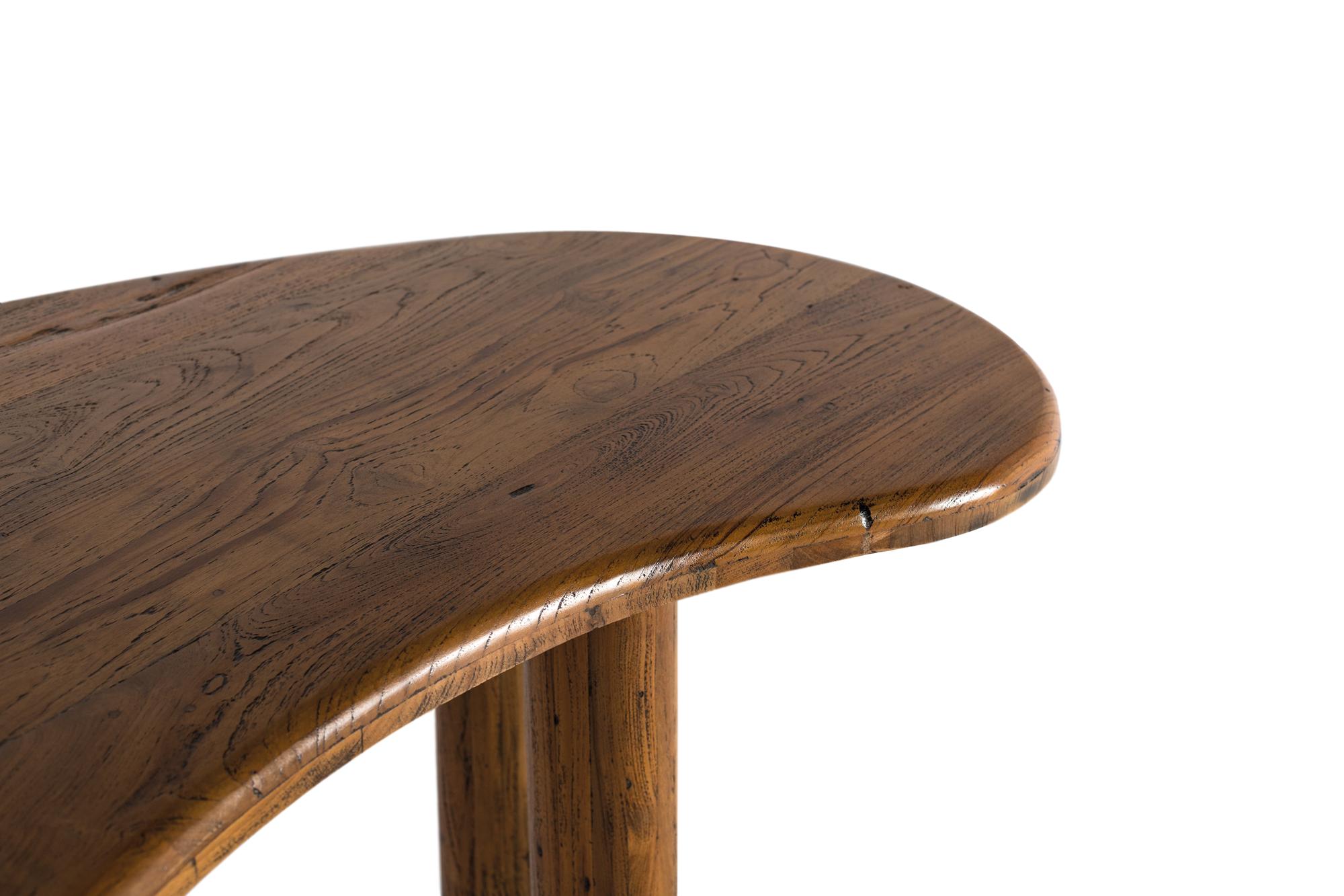 Elegantti maalaistyylinen työpöytä, joka on valmistettu tiikkipuusta ja viimeistelty pähkinäpuulla. Tilavassa pöytälevyssä on koristeellinen lista. Pöydän epäsymmetrinen muotoilu antaa sille luonnetta. Toista sivua koristavat pilasterit, kun taas toinen puoli on sileä ja tukeva, säilyttäen tukevuutensa ja tarjoten harmonisen kontrastin. Tämä työpöytä ei ole vain käytännöllinen kappale, vaan myös koriste-elementti, joka lisää luonnetta ja erottuvuutta mihin tahansa tilaan, ihanteellinen niille, jotka etsivät tasapainoa maalaismaisen kauneuden ja käsintehdyn tukevuuden välillä. Jalan korkeus: 72 cm. Pöydän paksuus: 4 cm.