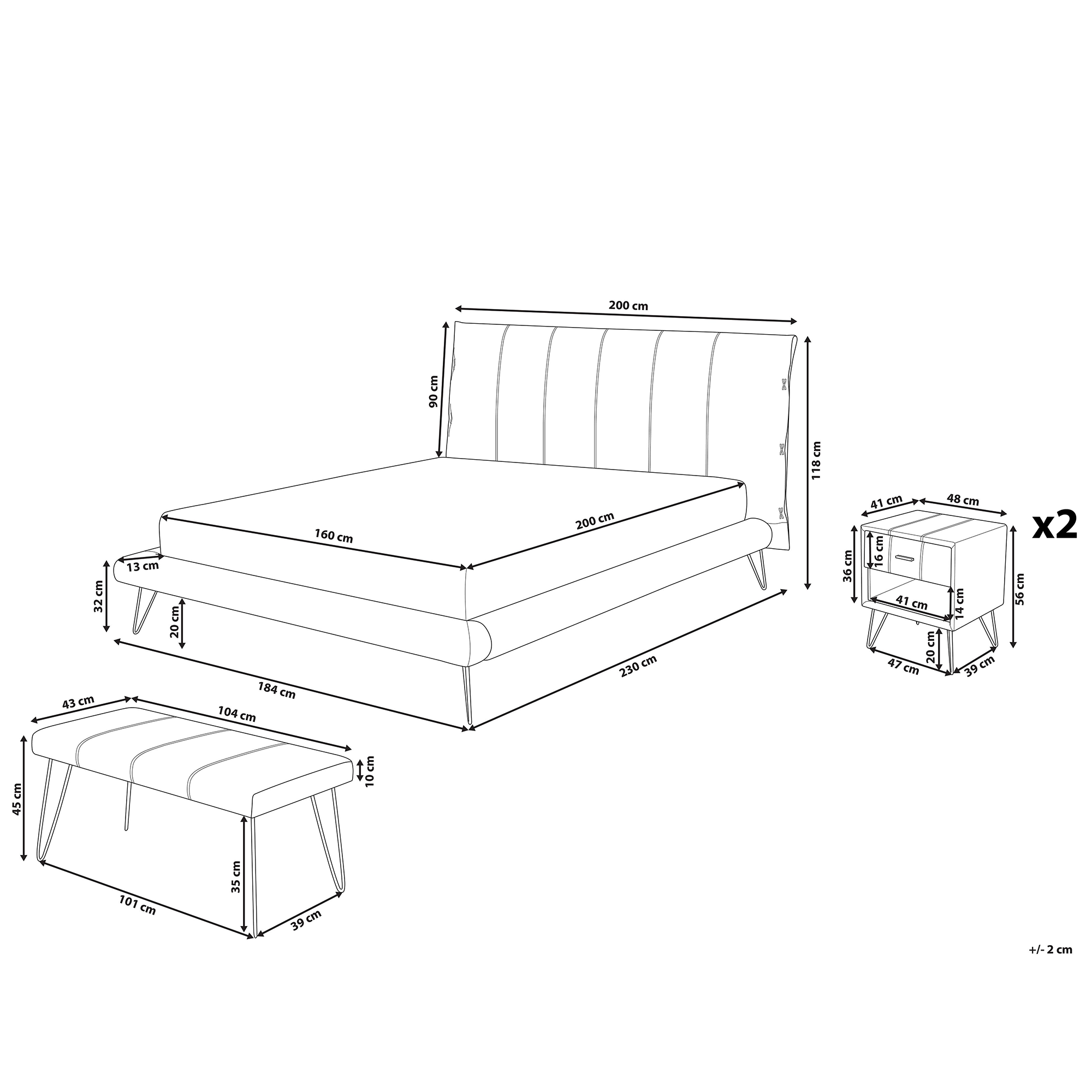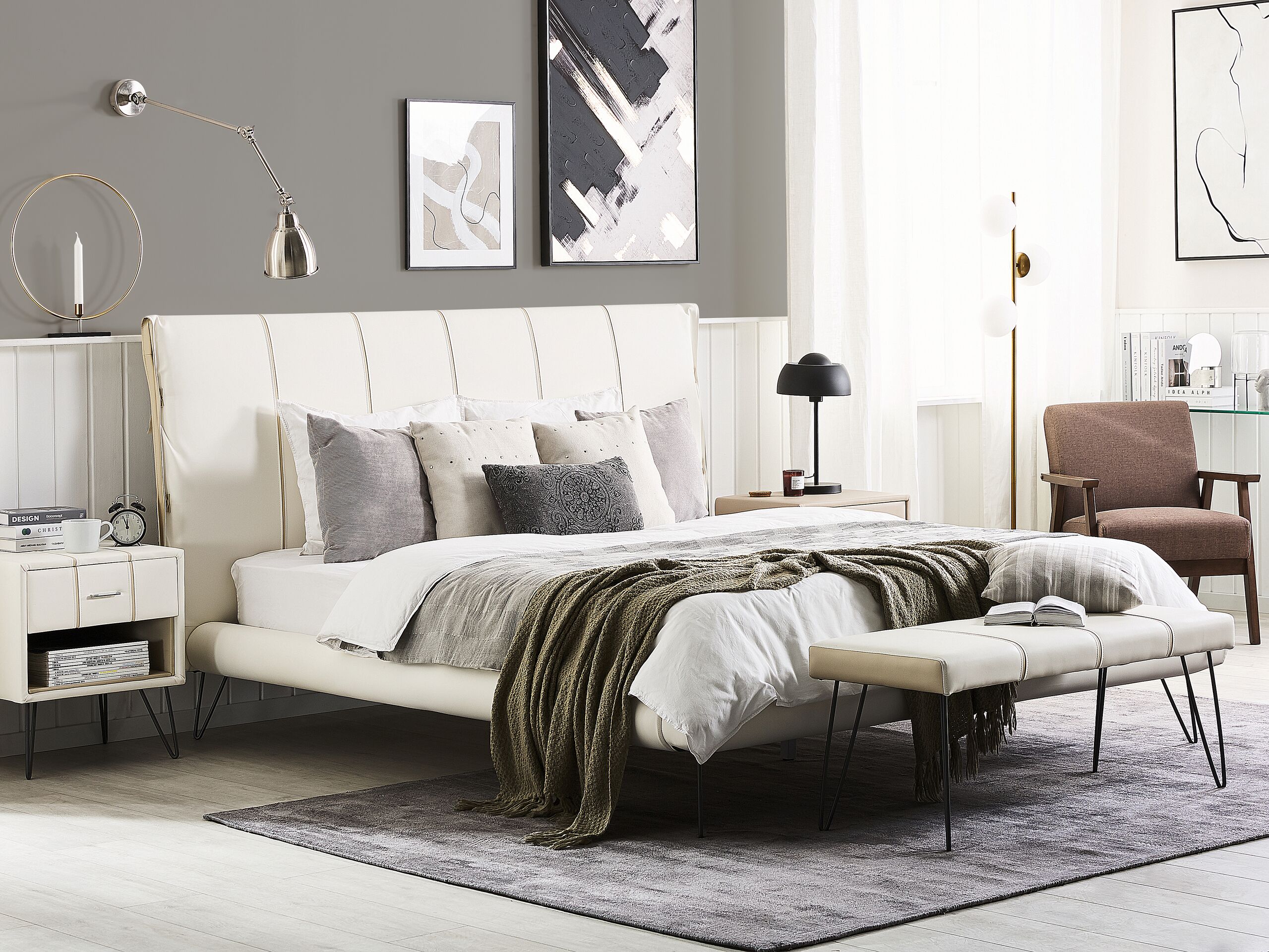 Skandinaavinen makuuhuoneen kalustesetti. Tämä nykyaikainen makuuhuonesetti on täydellinen valinta niille, jotka haluavat yhtenäisen ilmeen makuuhuoneeseen. Parisängystä, penkistä ja kahdesta yöpöydästä koostuva setti sopii täydellisesti etenkin moderneihin ja minimalistisiin sisustuksiin. Kalusteet on verhoiltu laadukkaalla, klassisen vaaleanbeigellä keinonahalla, jota koristavat pystysuuntaiset tikkaukset. Industriaalisen tyylin inspiroimat metalliset pinnijalat tuovat setin ulkonäköön lisää luonnetta.