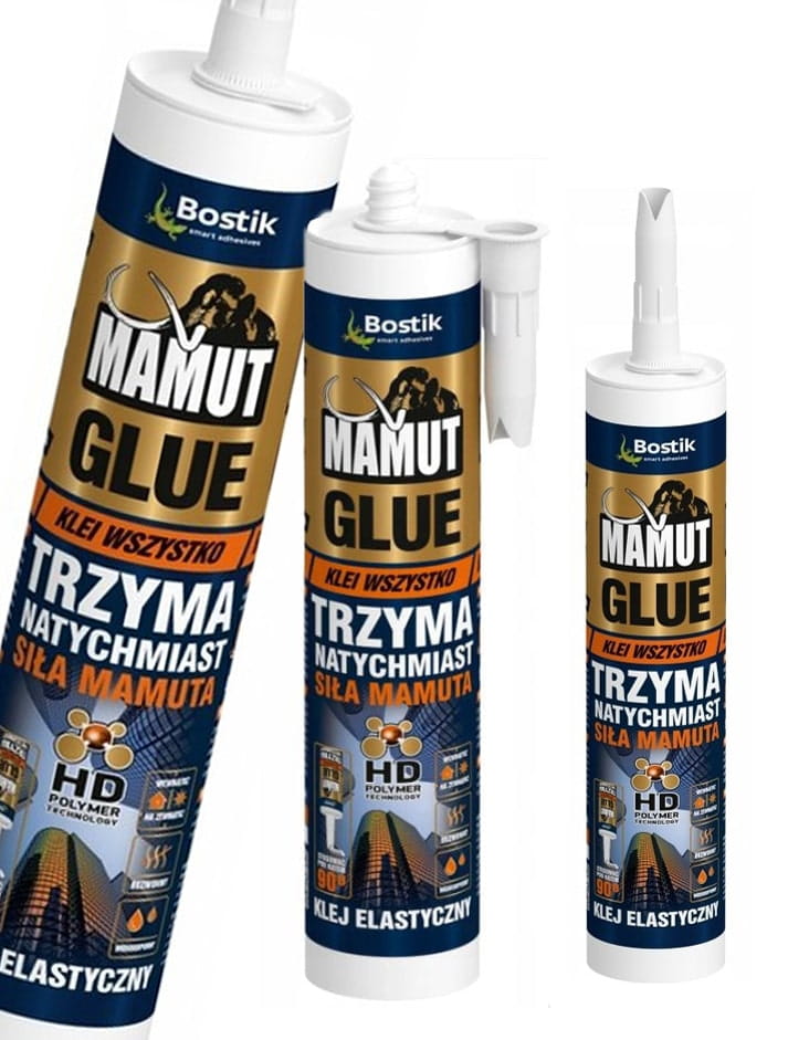 Universaali kiinnitysliimaBostik on suunniteltu sekä sisä- että ulkokäyttöön. Se on vesi- ja liuotinvapaa. Mammut-liimalle on ominaista välitön tarttuvuus ilman tarvetta tukea liimattua elementtiä ja erityisen lyhyt kuivumisaika. Kun se on parantunut, se on pysyvästielastinen ja kestävä.