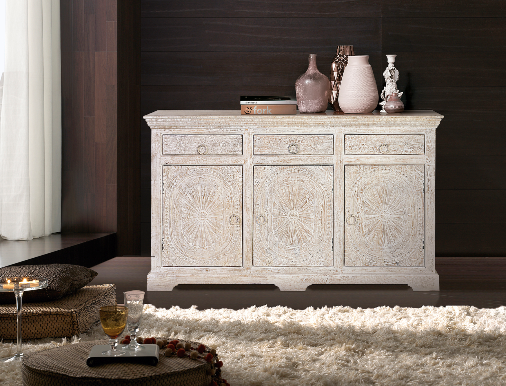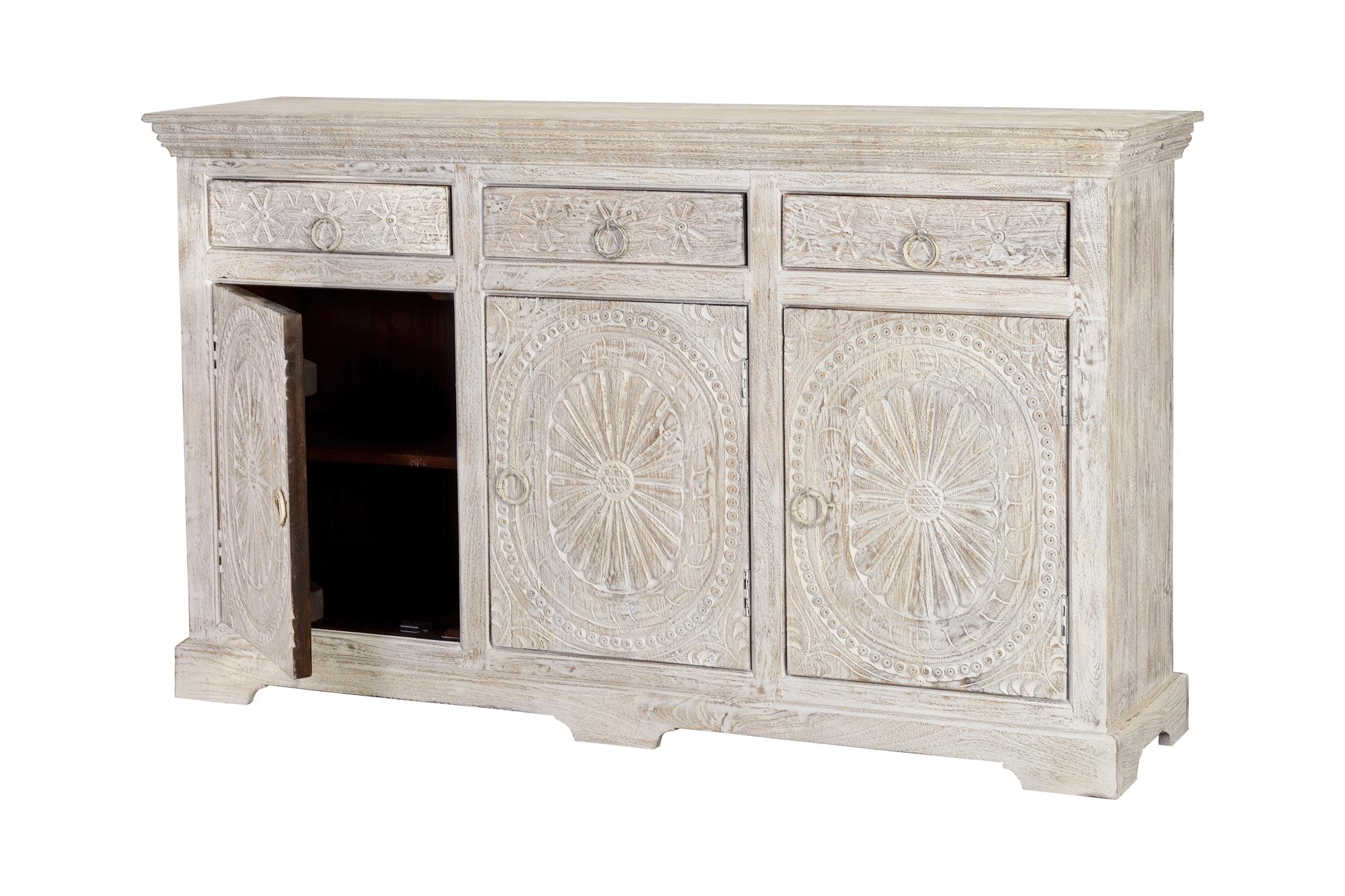 Kolmiovinen ja -laatikkoinen senkki käsin veistettyä mangopuuta. Sisällä hyllyt. Viimeistelty valkoiseksi kalkitulla antiikkiviimeistelyllä. Oven mitat: 52 x 40 cm. Laatikon etuosan mitat: 10 x 40 cm. Laatikon sisämitat: 8 x 36 x 28 cm. Sisähyllyn korkeus: 25 cm. Kokonaismitat: 90 cm korkea x 150 cm leveä x 40 cm syvä. Paino: 72 kg. Koska kyseessä on luonnonpuusta ja käsintehty kappale, siinä voi olla alkuperäiset oksankohdat ja syykuviot, ja siksi siinä voi olla pieniä värivaihteluita.