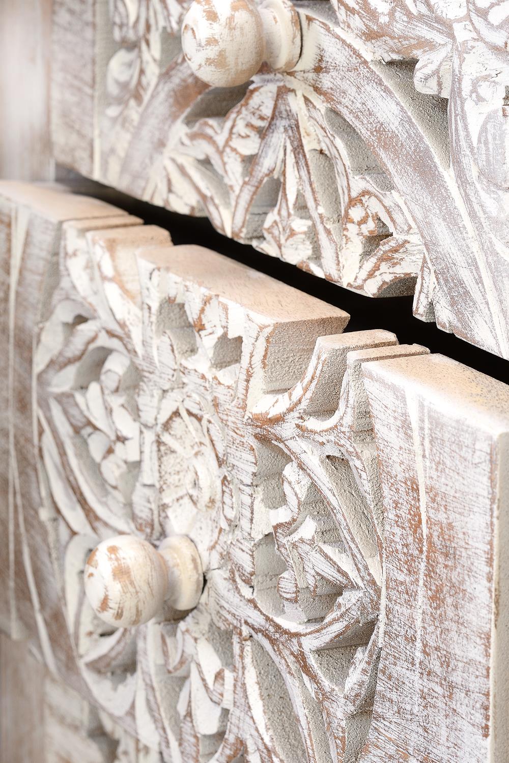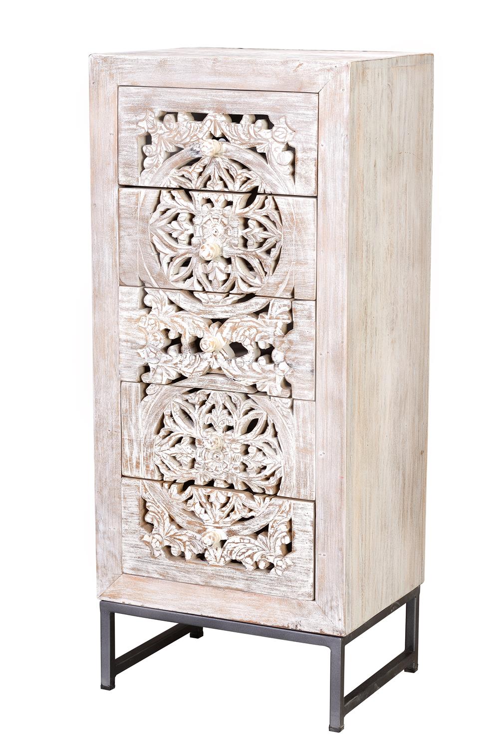 Viisilaatikkoinen mangopuusta valmistettu lipasto, jossa rautajalusta. Väri: vanhanaikainen valkoinen, harmaa jalusta. Ominaisuudet: käsin veistetyt ovet. Mitat: korkeus 105 cm x leveys 45 cm x syvyys 35 cm. Paino: 27 kg. Pakkauksen mitat: 109 x 51 x 42 cm. Koska kyseessä on luonnonpuusta ja käsintehty kappale, siinä saattaa säilyä alkuperäiset oksankohdat ja syykuviot, ja siksi siinä voi olla pieniä värivaihteluita.