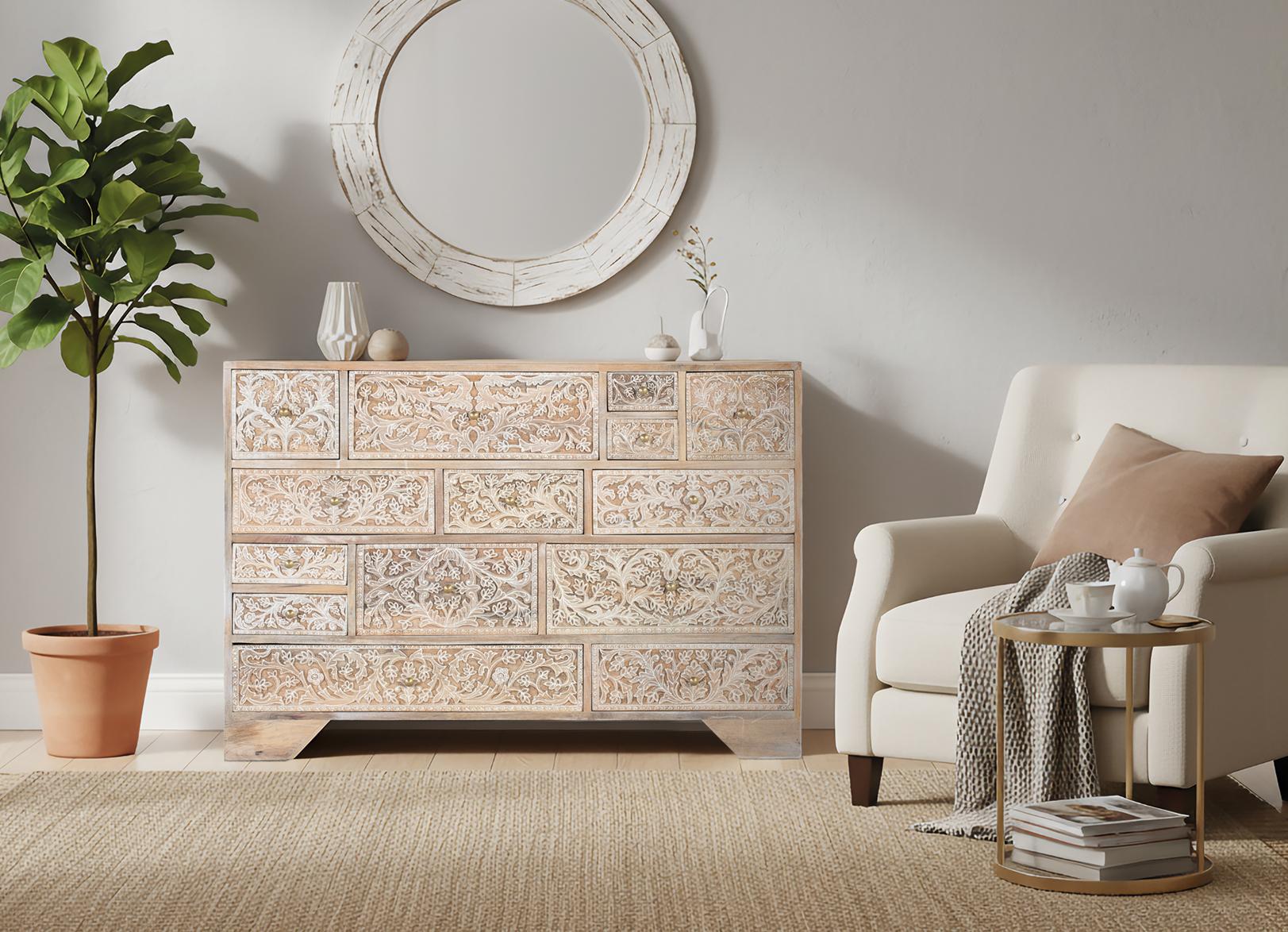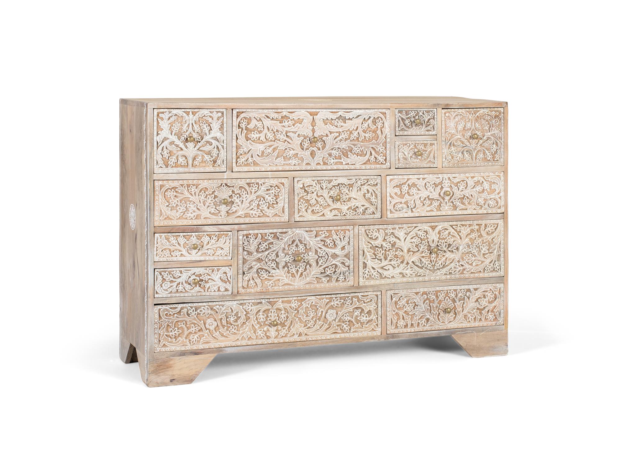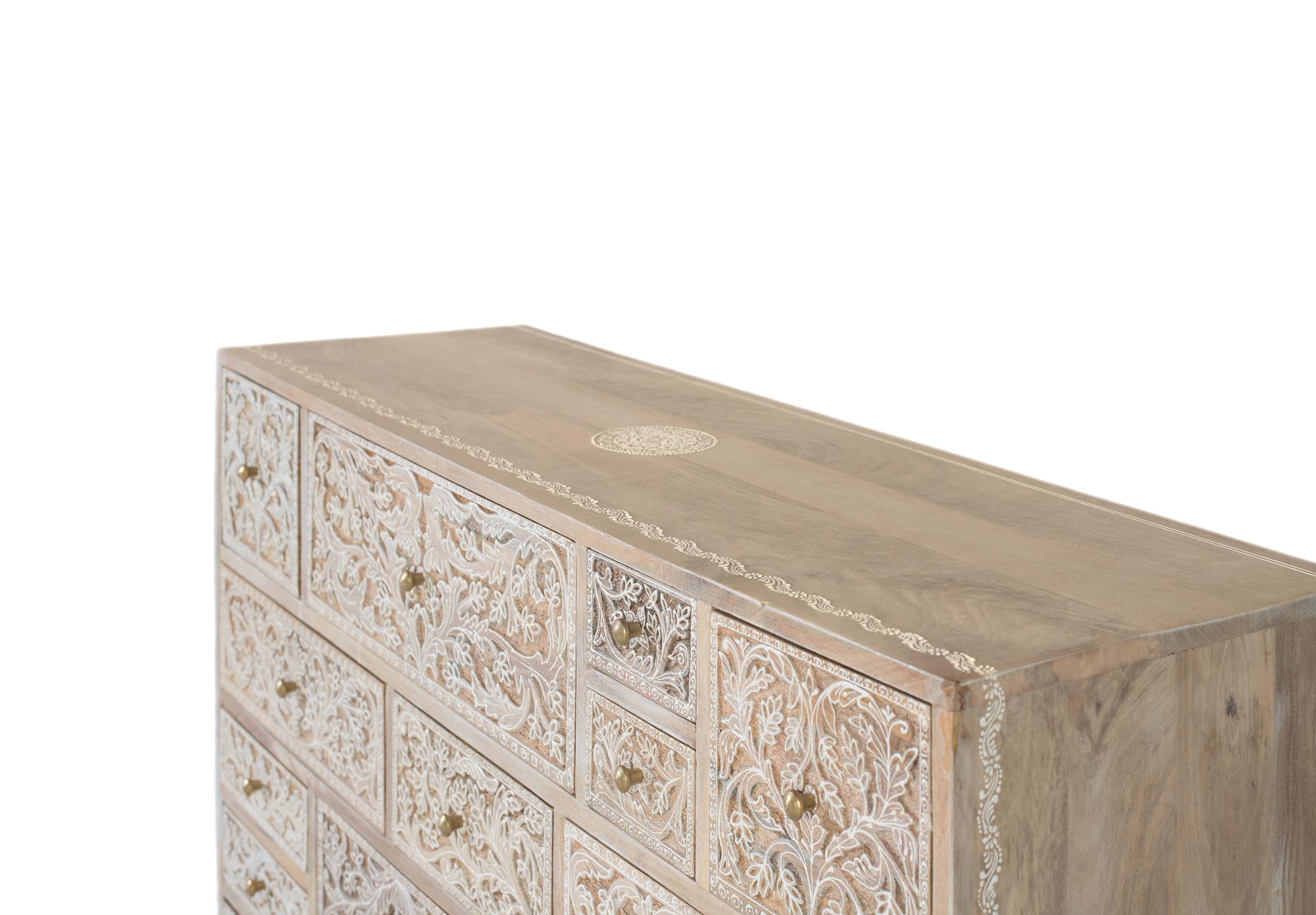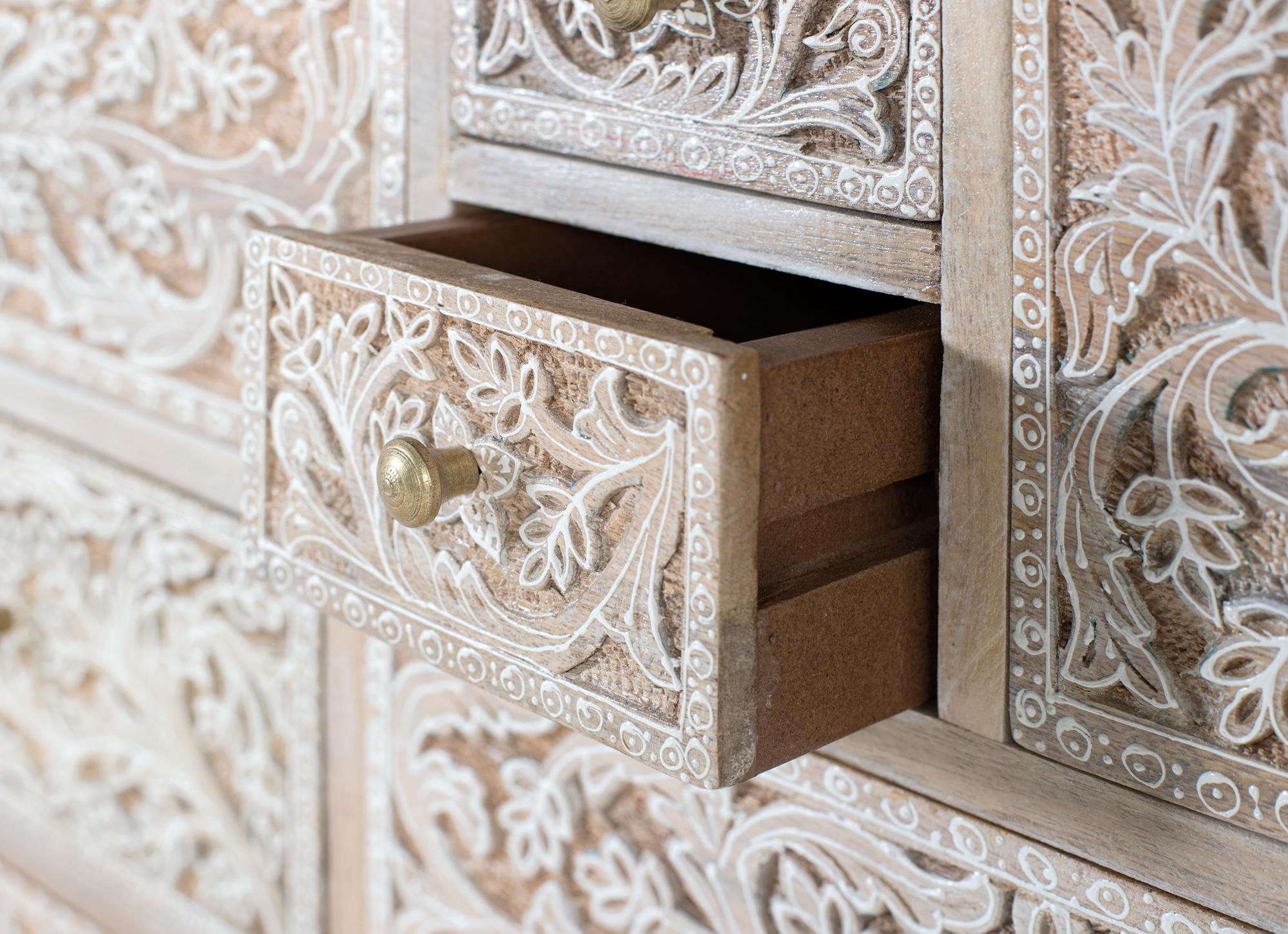 Käsintehty lipasto, joka on valmistettu massiivipuusta ja jossa on viehättävä laatikoiden järjestely eri kokoisina. Jokaisessa laatikossa on käsin veistetty etuosa, jossa on monimutkaisia kukka-aiheita. Laatikosto on tukevan suorakaiteen muotoinen ja siinä on kohotettu pohja, jota tukevat lyhyet, kulmikkaat jalat, jotka tarjoavat sekä vakautta että visuaalista keveyttä. Huomaamattomat metallikahvat on integroitu kaiverrukseen säilyttäen yleisen koristeellisen estetiikan. Jalan korkeus: 8 cm; Kannen paksuus: 1,8 cm.
