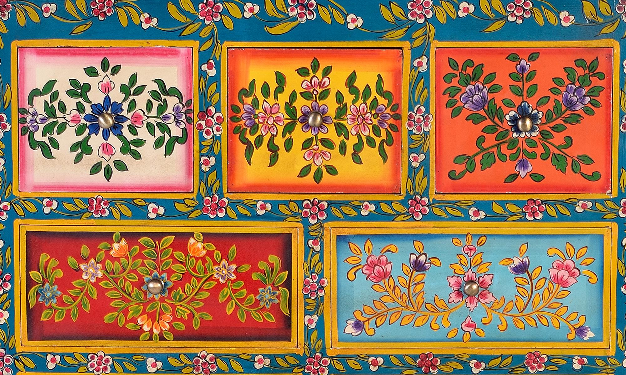 Mangopuusta valmistettu lipasto, jossa on monivärisiä käsinmaalattuja yksityiskohtia