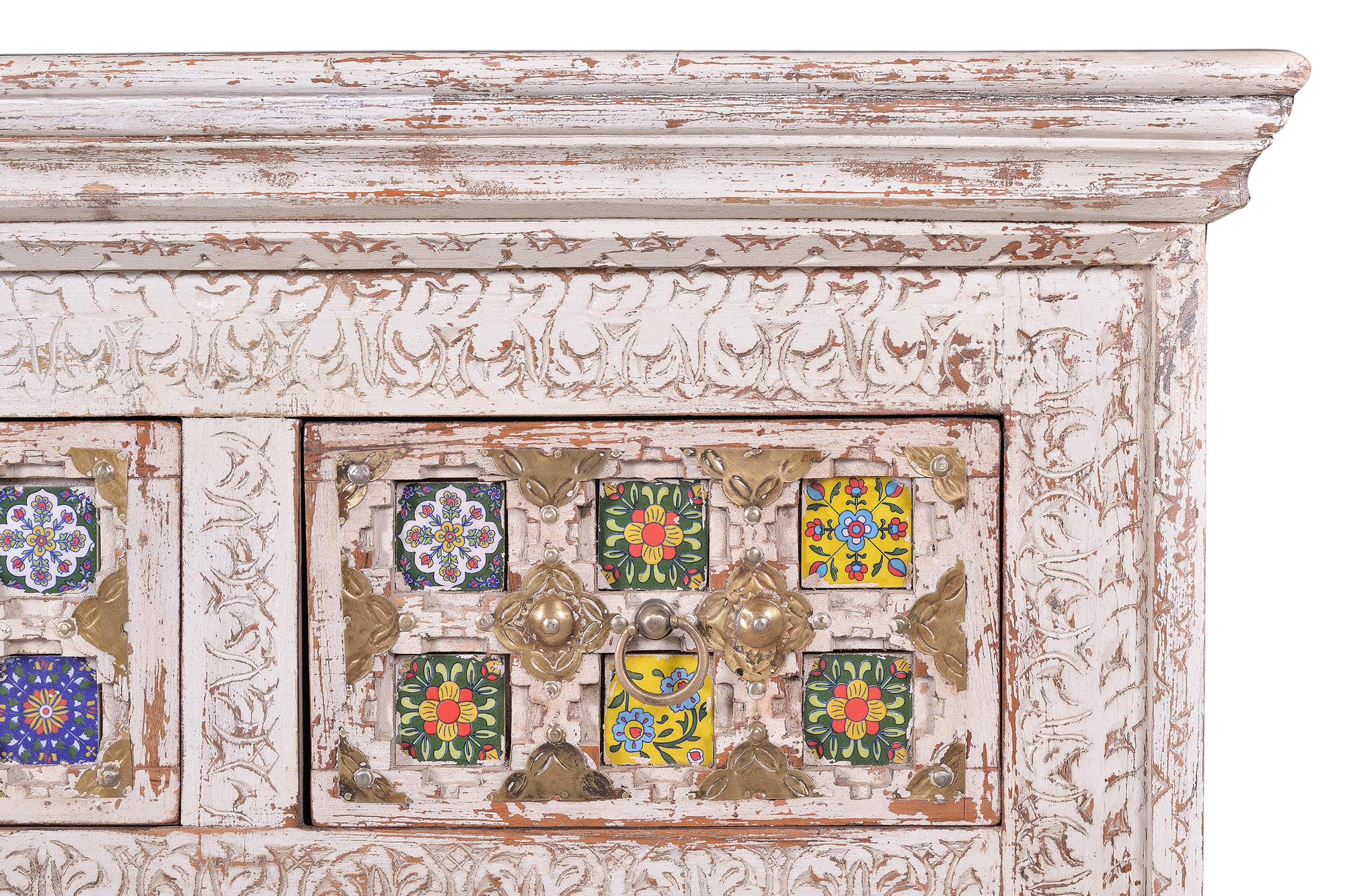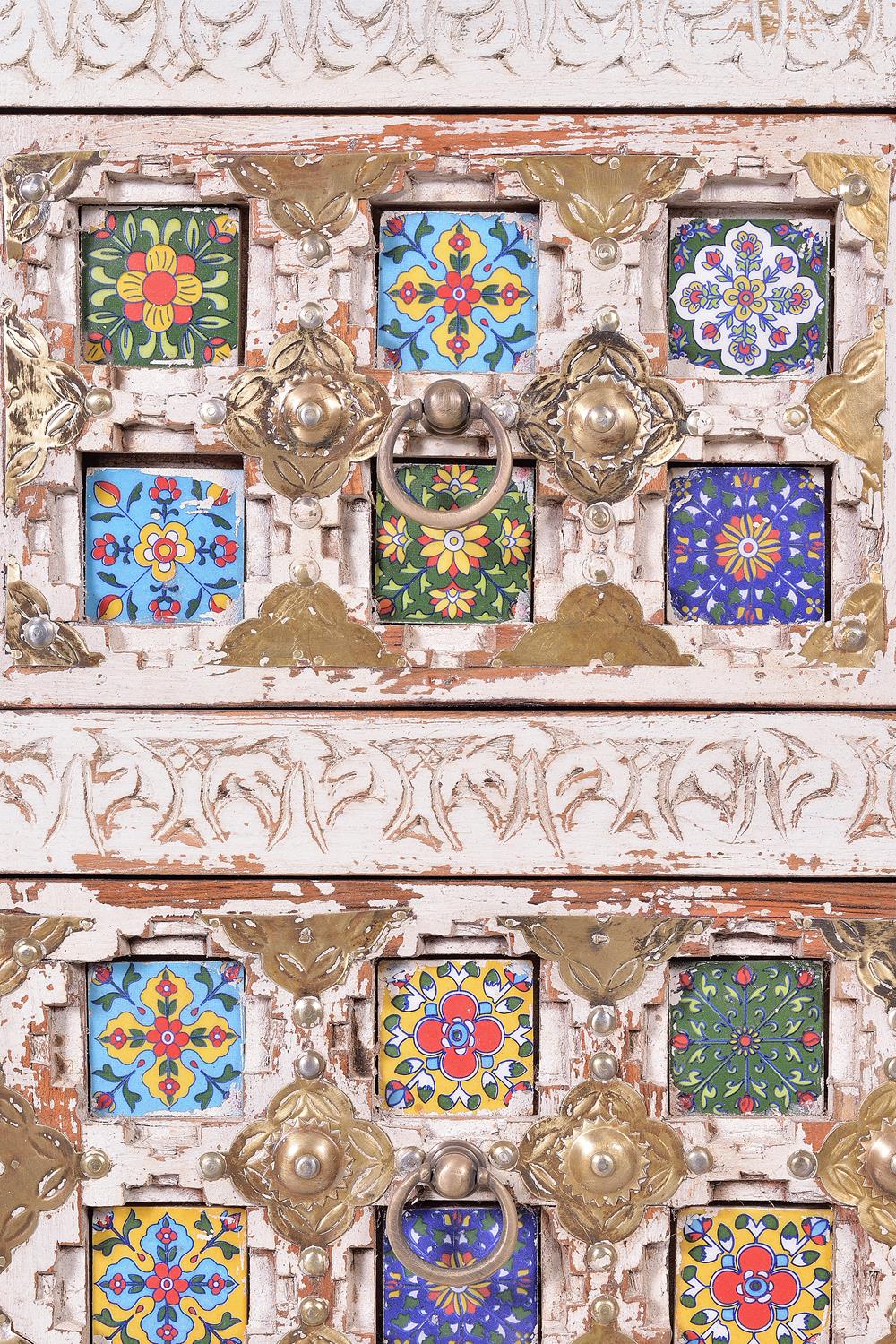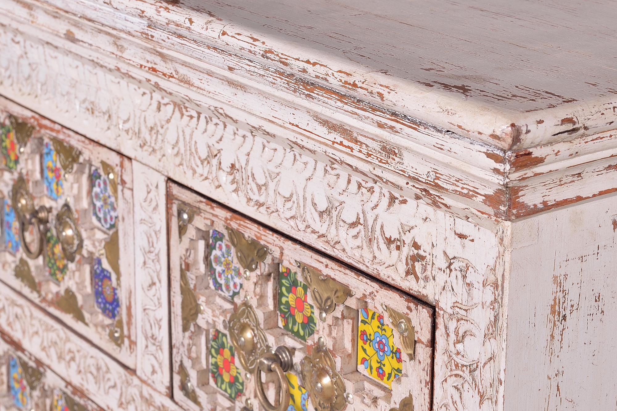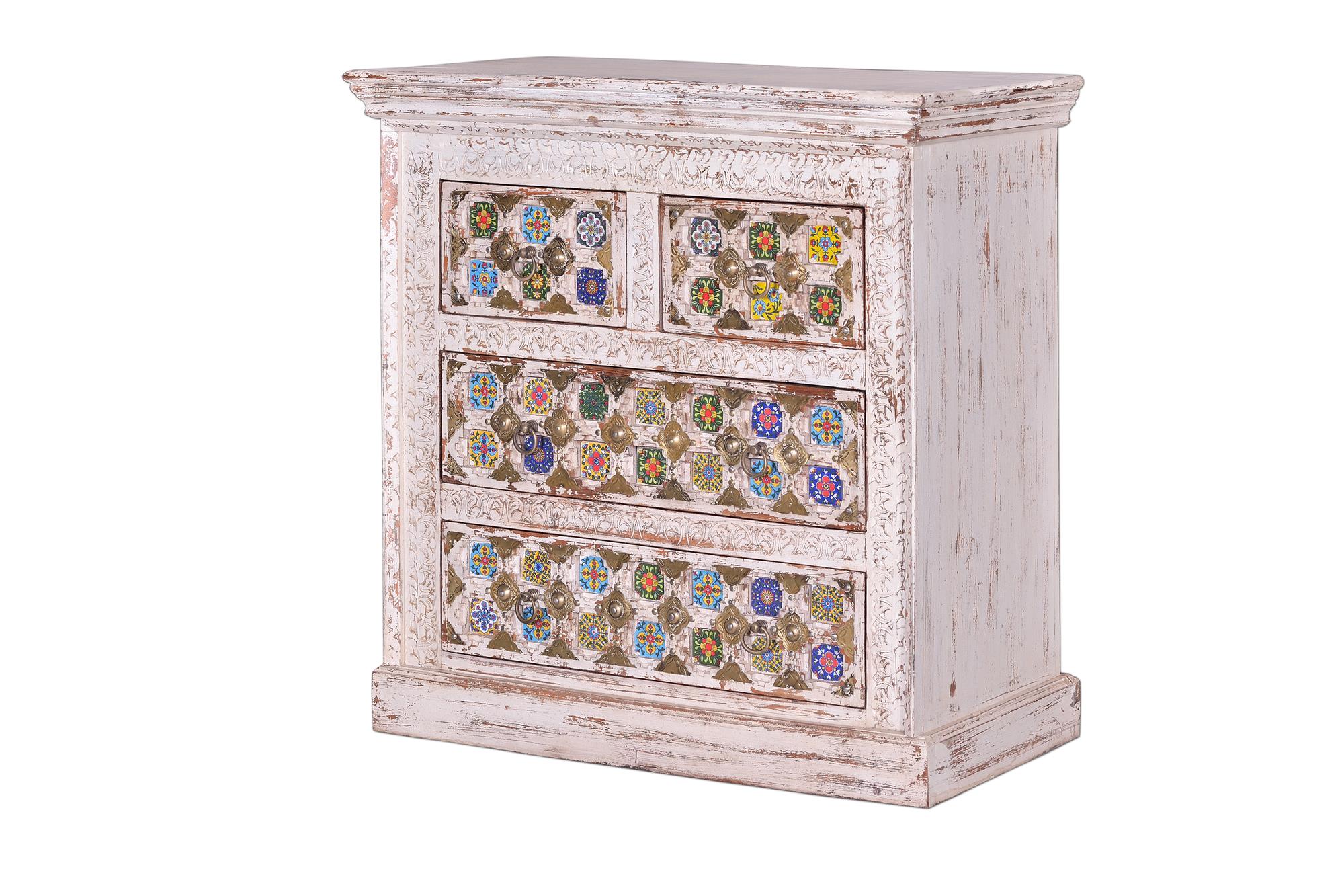 Bakhra-malliston neljän laatikon lipasto, valmistettu mangopuusta, keraamisilla ja pronssisilla yksityiskohdilla. Väri: vanhanaikainen valkoinen monivärisillä yksityiskohdilla. Mitat: korkeus 90 cm x leveys 90 cm x syvyys 40 cm. Paino: 56 kg. Pakkauksen mitat: 94 x 94 x 44 cm. Koska tämä on käsintehty luonnonpuusta valmistettu kappale, siinä saattaa säilyä alkuperäiset oksankohdat ja syykuviot, mikä johtaa pieniin värivaihteluihin.