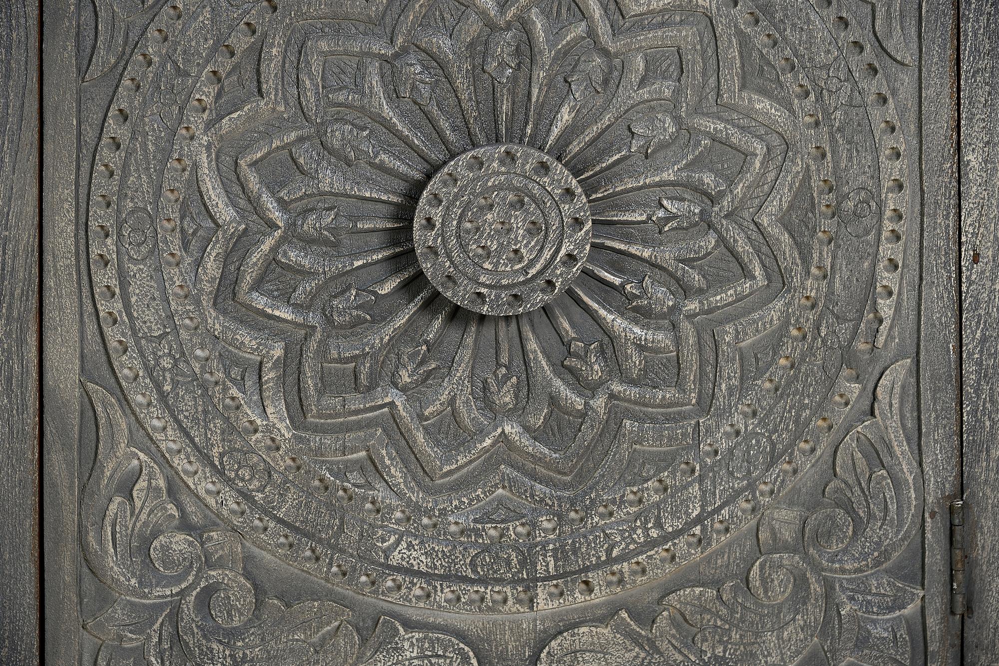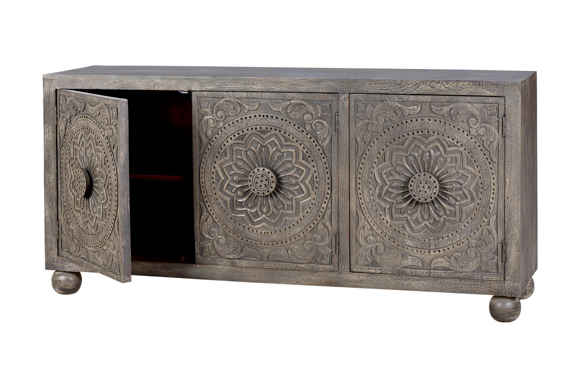 Kolmiovinen senkki mangopuusta, käsintehdyillä oviyksityiskohdilla. Sisällä hyllyt. Jalan korkeus: 10 cm. Oven mitat: 62 x 53 cm. Sisähyllyn korkeus: 29 cm. Pesty harmaa viimeistely. Mitat: korkeus 82 cm x leveys 172 cm x syvyys 43 cm. Paino: 46 kg. Koska tämä on luonnonpuusta ja käsintehty kappale, siinä voi olla alkuperäiset oksankohdat ja syyt, ja siksi siinä voi olla pieniä värivaihteluita.