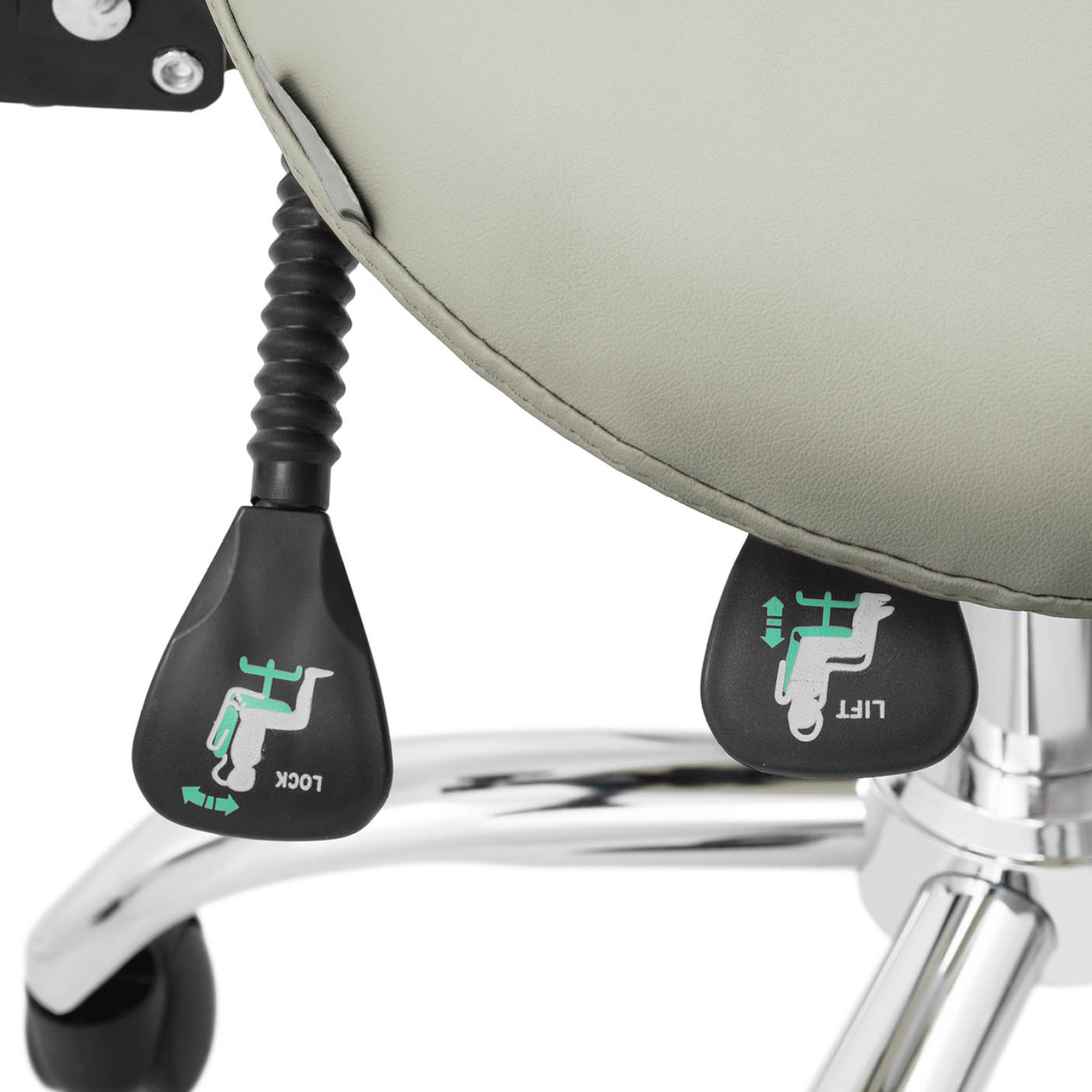 Satulatuolissa on kallistuva selkänoja 0 - 22° säädetään vivulla. Selkänojan korkeutta voidaan myös säätää välillä 89 - 103 cm . Istuintyyny on täytetty 5 cm paksulla vaahtomuovilla ja päällystetty PVC-nahalla . Tuoli on varustettu viidellä 360° kääntyvällä pyörällä . Myös istuin on kääntyvä, ja sen korkeutta voidaan säätää vivulla 55–69 cm:n välillä . Istuin liukuu tasaisesti ylös/alas kaasujousen ansiosta. Jakkara kestää jopa 150 kg:n kuormituksen. PVC-nahkaverhoilu on helppohoitoinen eikä ime nesteitä tai pölyä. Kromattu teräs ja tyylikäs verhoilu antavat tuolille houkuttelevan ulkonäön. Tuotteen ominaisuudet: