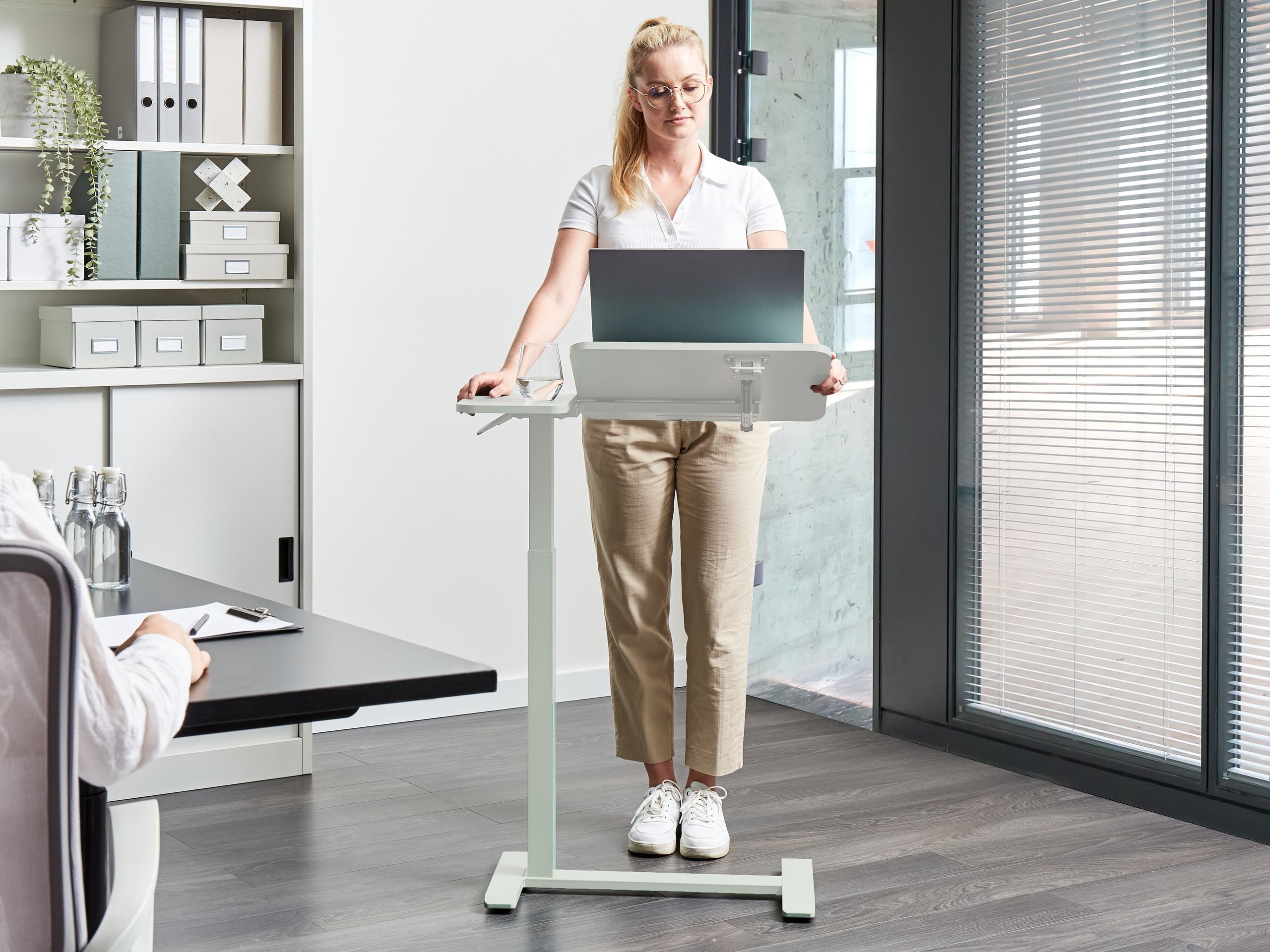 Korkeussäädettävä työpöytä kannettavalle tietokoneelle. Nauti joustavuudesta ja tyylistä tällä modernilla tietokonepöydällä, joka sopii erinomaisesti kannettavalle tietokoneelle. Seisomapöytä on suunniteltu sekä työhön että hyvinvointiin, ja säädettävän korkeuden ansiosta se on helppo mukauttaa työtilaan sopivaksi. Laadukkaat materiaalit, viilutettu lastulevy ja jauhemaalattu teräs varmistavat vankkuuden ja kestävyyden. Minimalistinen muotoilu saa pöydän sopimaan mihin tahansa sisustukseen, samalla kun kompakti koko varmistaa helpon liikuteltavuuden. Se on täydellinen dynaamisen ja mukavan työympäristön luomiseen tilassa kuin tilassa.