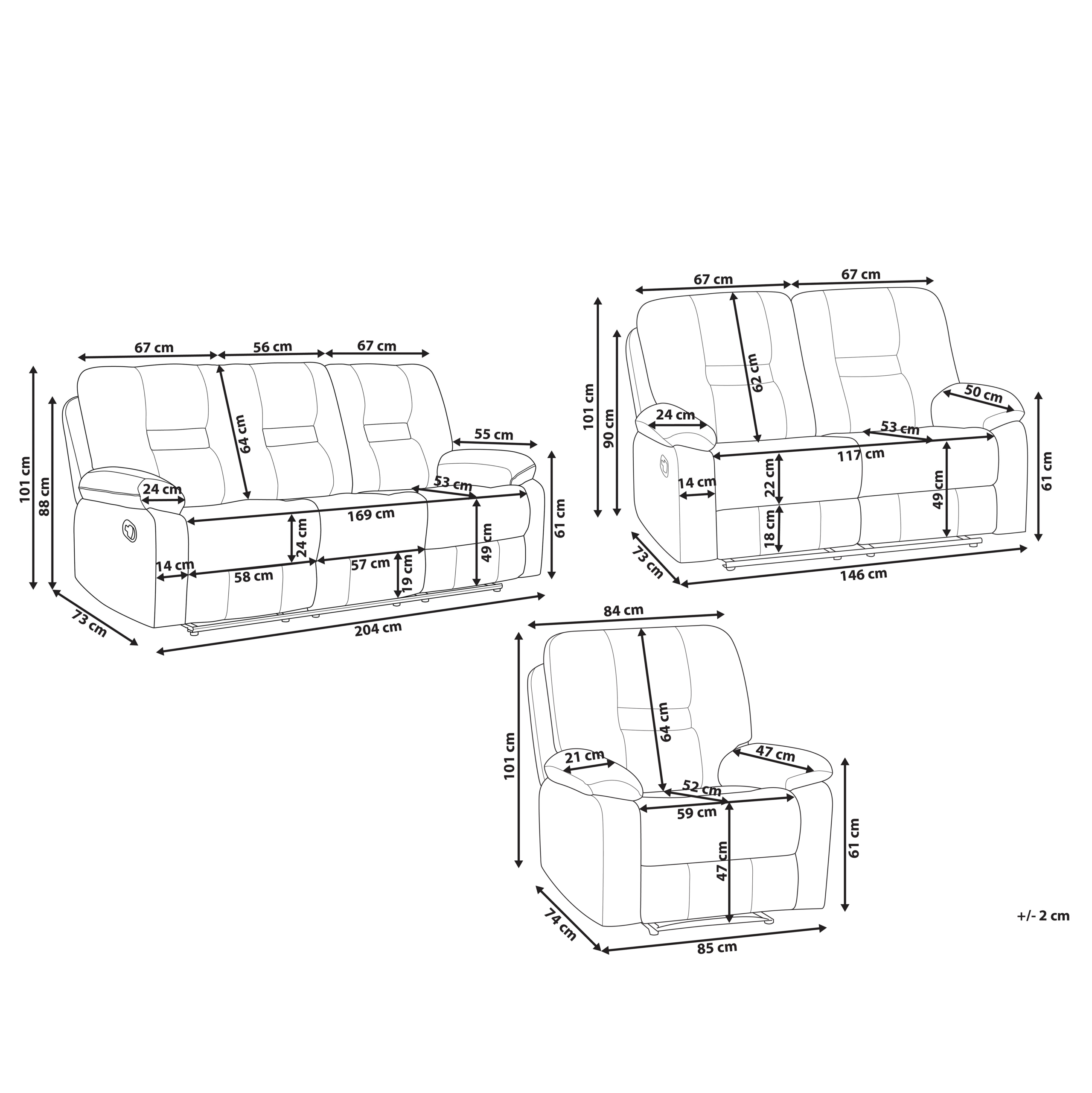 Säädettävä kangasverhoiltu sohvaryhmä. Täydellinen leposetti kuudelle, jonka kanssa ei rentoutumisen asteesta tarvitse riidellä. Erillisten mekanismien ansiosta viisi istujaa voi määrittää asentonsa sohvilla ja nojatuolissa, vain kolmen istuttavan sohvan keskimmäinen istuin ei ole säädettävissä. Vanttera rakenne ja metallinen runko pitävät huolen sohvan kestävyydestä. Setti on päällystetty paksusti, jotta siinä olisi mahdollisimman mukava olla. Siisti ja klassinen muotoilu takaa sen, että setti toimii osana erilaisia sisustustyylejä.