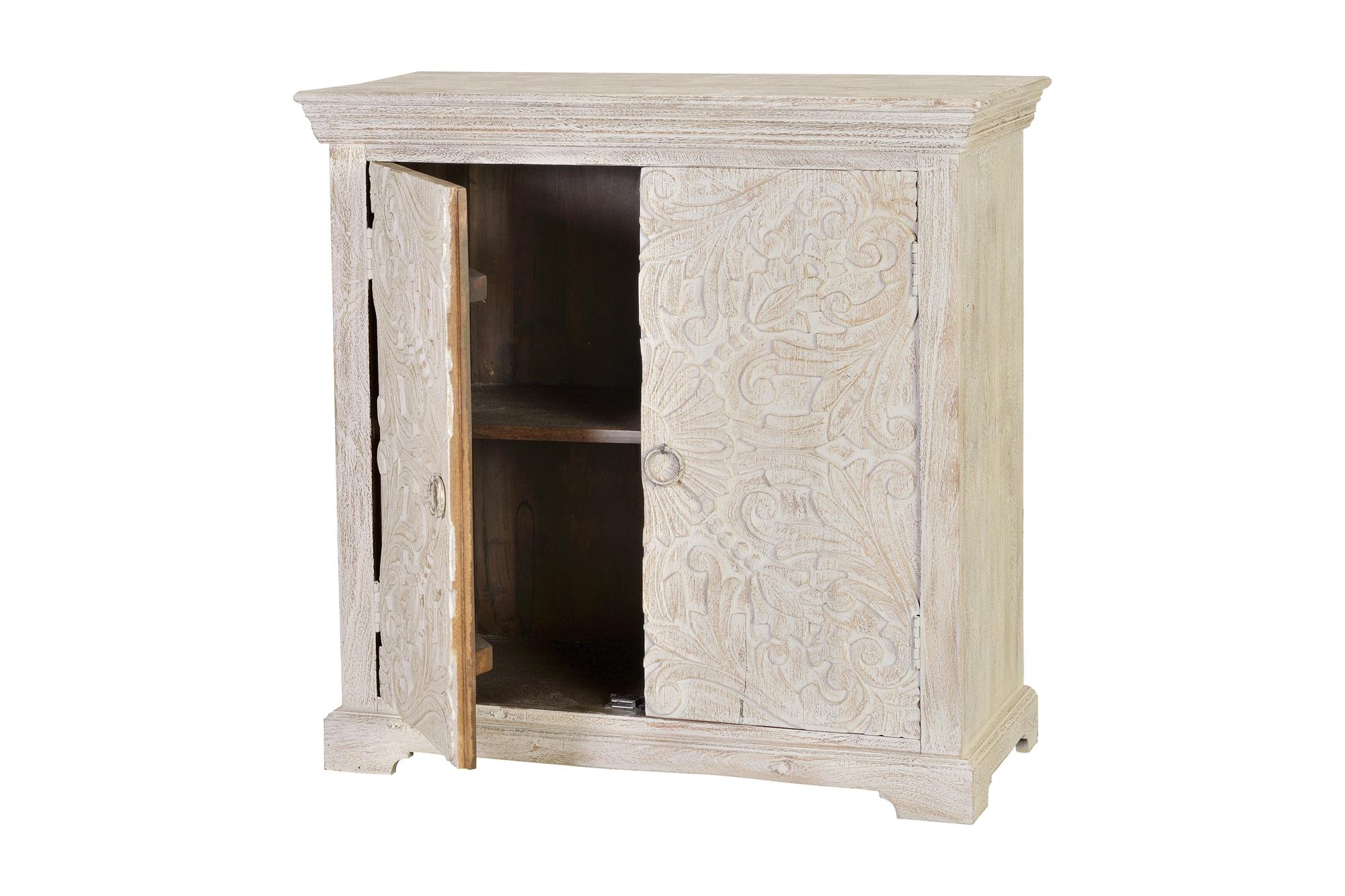 Lipasto, jossa kaksi ovea ja yksi sisähylly. Valmistettu massiivimangopuusta, ovissa on kaiverruksia. Valkoiseksi kalkittu viimeistely. Mitat: korkeus 90 cm x leveys 90 cm x syvyys 40 cm. Tilavuus: 0,32 m³. Paino: 33 kg. Koska kyseessä on luonnonpuusta valmistettu ja käsintehty kappale, siinä voi olla alkuperäiset oksankohdat ja syyt, ja siksi siinä voi olla pieniä värivaihteluita.