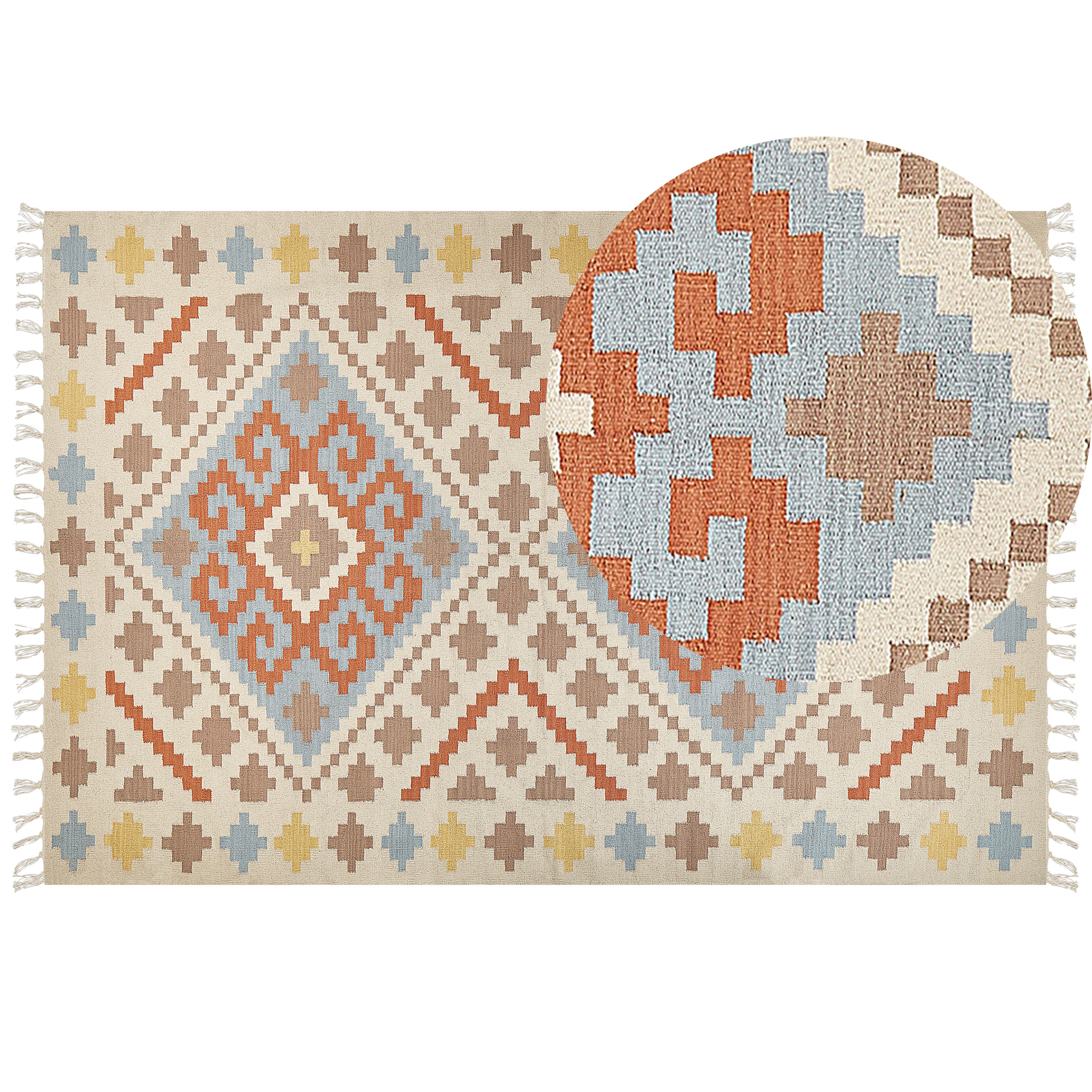 Värikäs puuvillamatto hapsuilla. Paranna olohuoneen tai makuuhuoneen tunnelmaa tällä viehättävällä Kelim-matolla. Se on kudottu käsin miellyttävän tuntuisesta puuvillasta, ja lyhyen nukkansa ansiosta se on sekä kestävä että helppo imuroida puhtaaksi. Ihastuttava värikäs geometrinen kuviointi tuo sisustukseen kuin sisustukseen lämpöä, luonnetta ja perinteistä eleganssia.