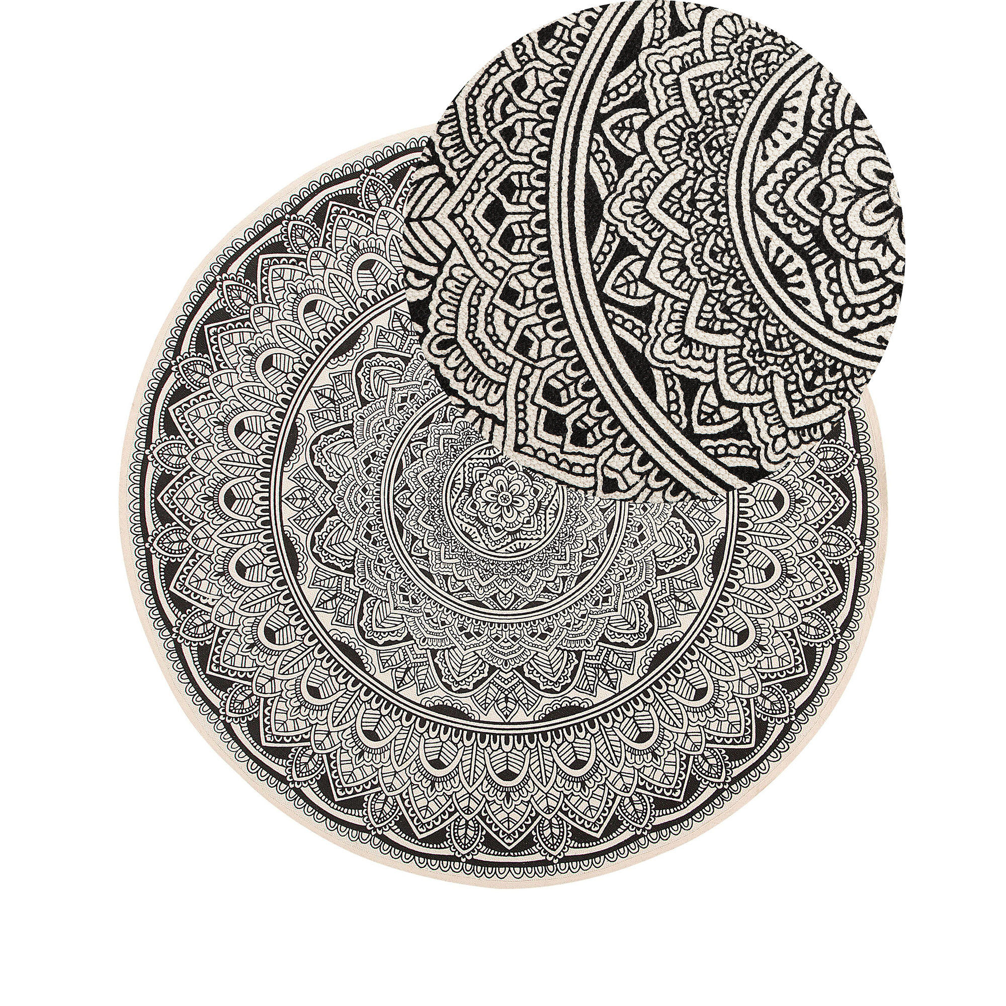 Pyöreä puuvillamatto mandala-kuviolla. Ihaile tämän maton yksityiskohtaista kuviointia, jonka kauneus sopii mihin tahansa sisustukseen. Hypnoottinen musta kuvio kermanvaalealla taustalla on upea yhdistelmä joka kerää katseita. Valmistuksessa käytetty luonnollinen puuvilla takaa laadun ja kestävyyden. Matto ja sen kuviointi on tehty kestämään käyttöä.