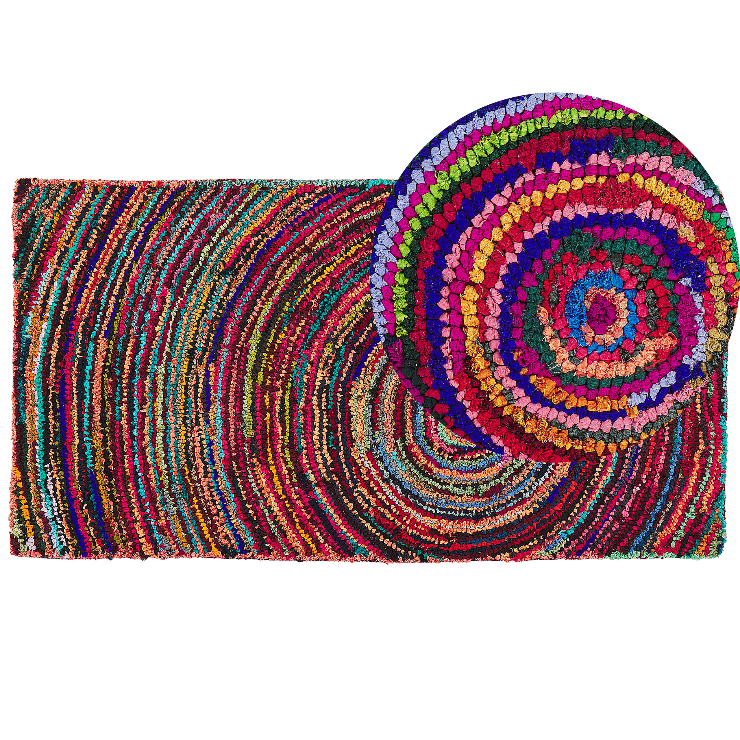 Värikäs matto abstraktilla kuviolla. Värikäs boheemi matto on täydellinen osa lisättäväksi olohuoneeseen tai makuuhuoneeseen. Käsinkudottu käyttämällä paksuja takkuisia lettejä, jotka ovat erityisen pehmeitä koskettaa, mutta kestäviä pitkäaikaiseen käyttöön. Rohkeat värit pyöreässä matossa kohottavat huoneen uusiin ulottuvuuksiin.