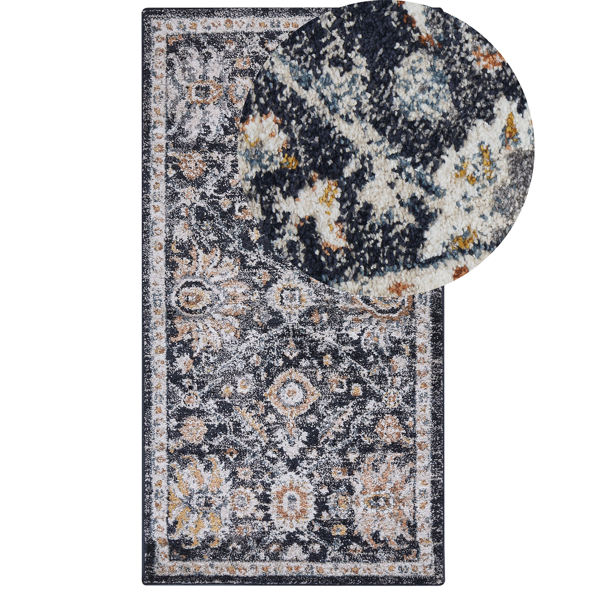 Vintage-tyylinen matto itämaisella kuvioinnilla. Tee mistä tahansa kodin tilasta viihtyisä ja lämmin tällä kauniilla orientaalisella matolla. Tumman sinisen sävyt ja beiget rohkeat kuviot sopivat erityisen hyvin perinteiseen tai vintage-tyyliseen makuuhuoneeseen, olohuoneeseen tai eteiseen. Matto tuntuu lämpimältä jalkojen alla kylmien lattioiden päälle asetettuna.