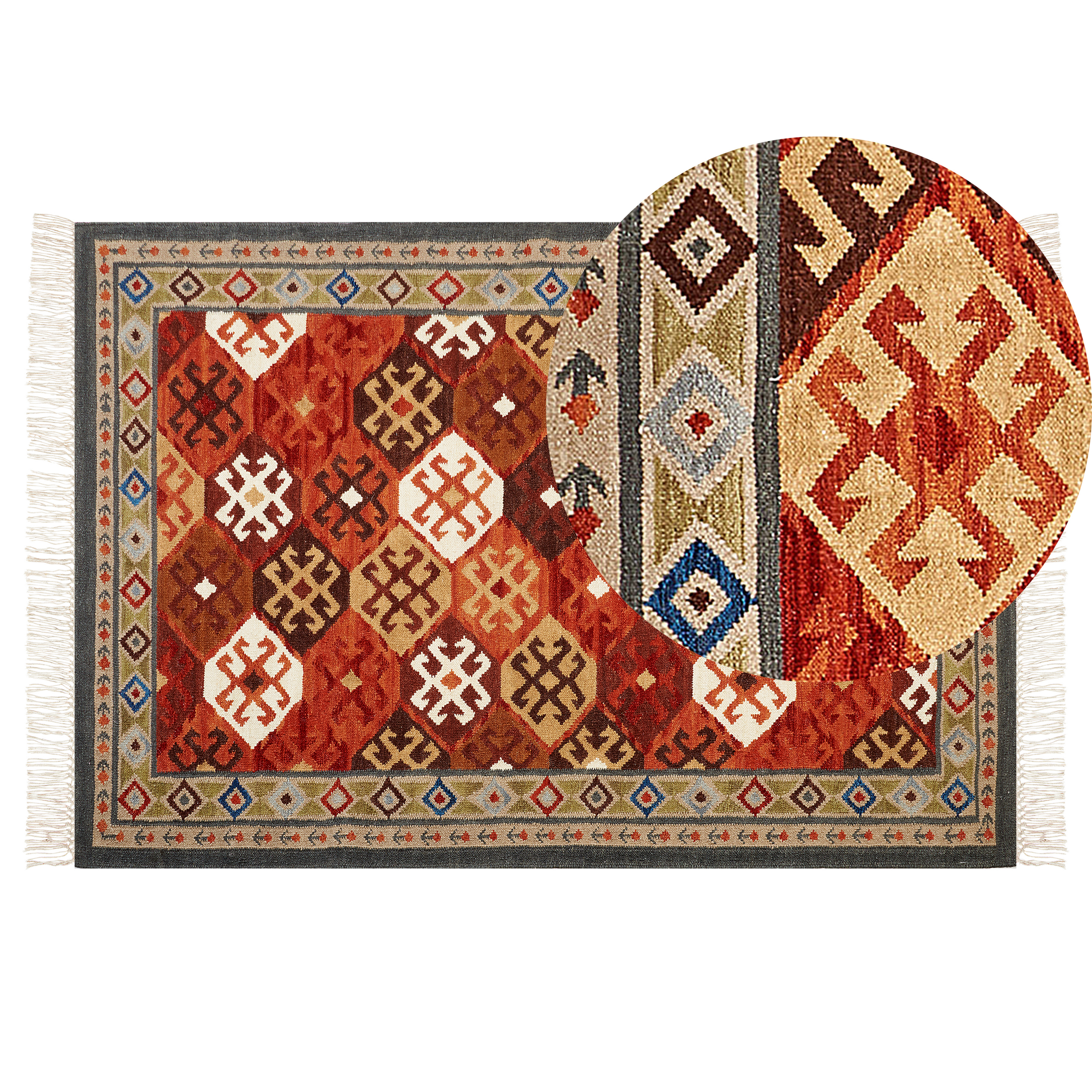 Itämainen suorakulmainen Kelim-matto. Lähi-idän kulttuurista ja perinteistä inspiraationsa saanut Kelim-matto tuo eksoottista tunnelmaa huoneeseen kuin huoneeseen. Sen monivärinen, etnisillä symboleilla viimeistelty kuviointi kerää katseita, kun taas syvän oranssit ja punaiset sävyt piristävät sisustusta. Se on valmistettu kokonaan käsin villasta, joka tekee matosta kestävän sekä pehmeän. Aseta matto koristamaan olohuoneen tai makuuhuoneen lattiaa.