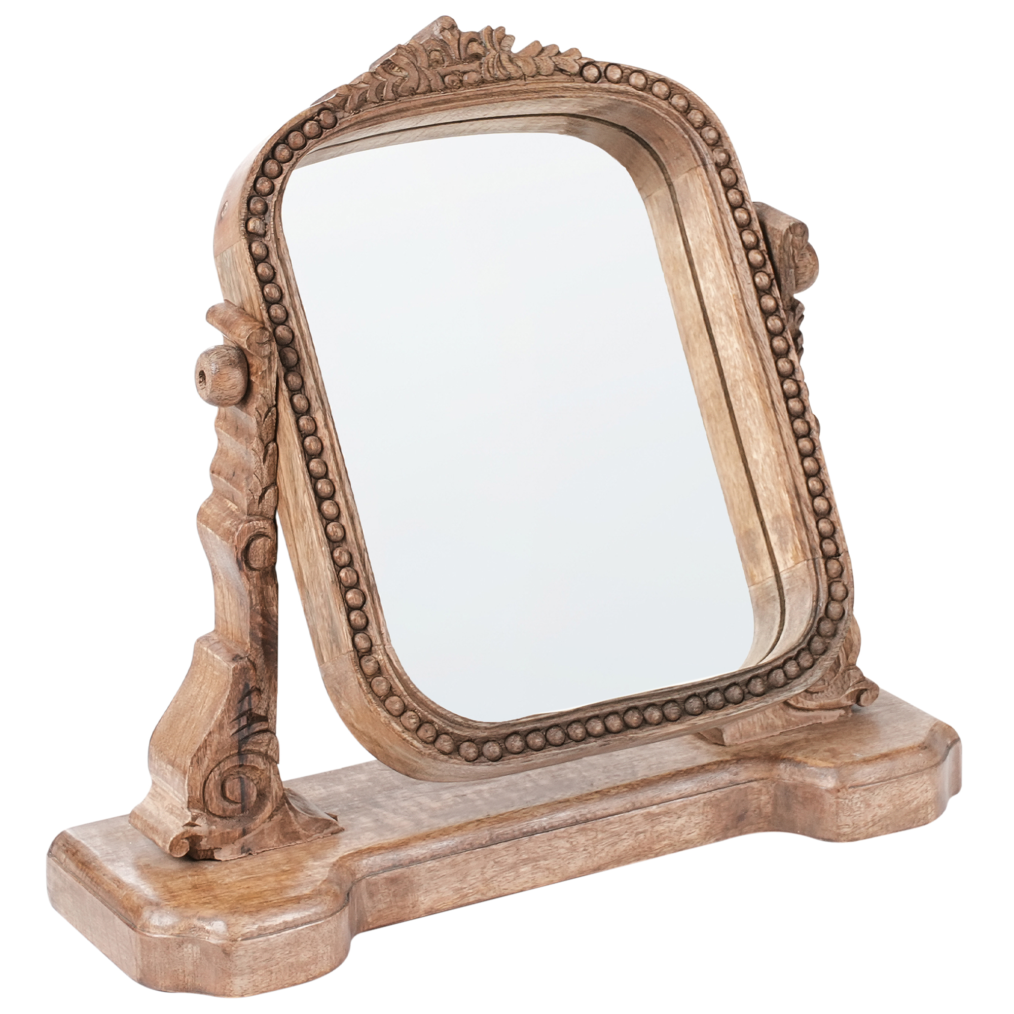Vintage-tyylinen peili kampauspöydälle. Tämä vintage-tyylinen meikkipeili on valmistettu kestävästä mangopuusta, ja se tarjoaa täydellisen yhdistelmän toiminnallisuutta ja eleganssia. Viehättävien ja yksityiskohtaisten kaiverrusten ansiosta se lisää antiikkista viehätystä kampauspöydälle. Peiliä on mahdollista kallistaa, mikä helpottaa meikki- ja ihonhoitorutiineja. Se tuo tilaan sekä tyyliä että käytännöllisyyttä, käytettiinpä sitä päivittäin tai vain koriste-esineenä.