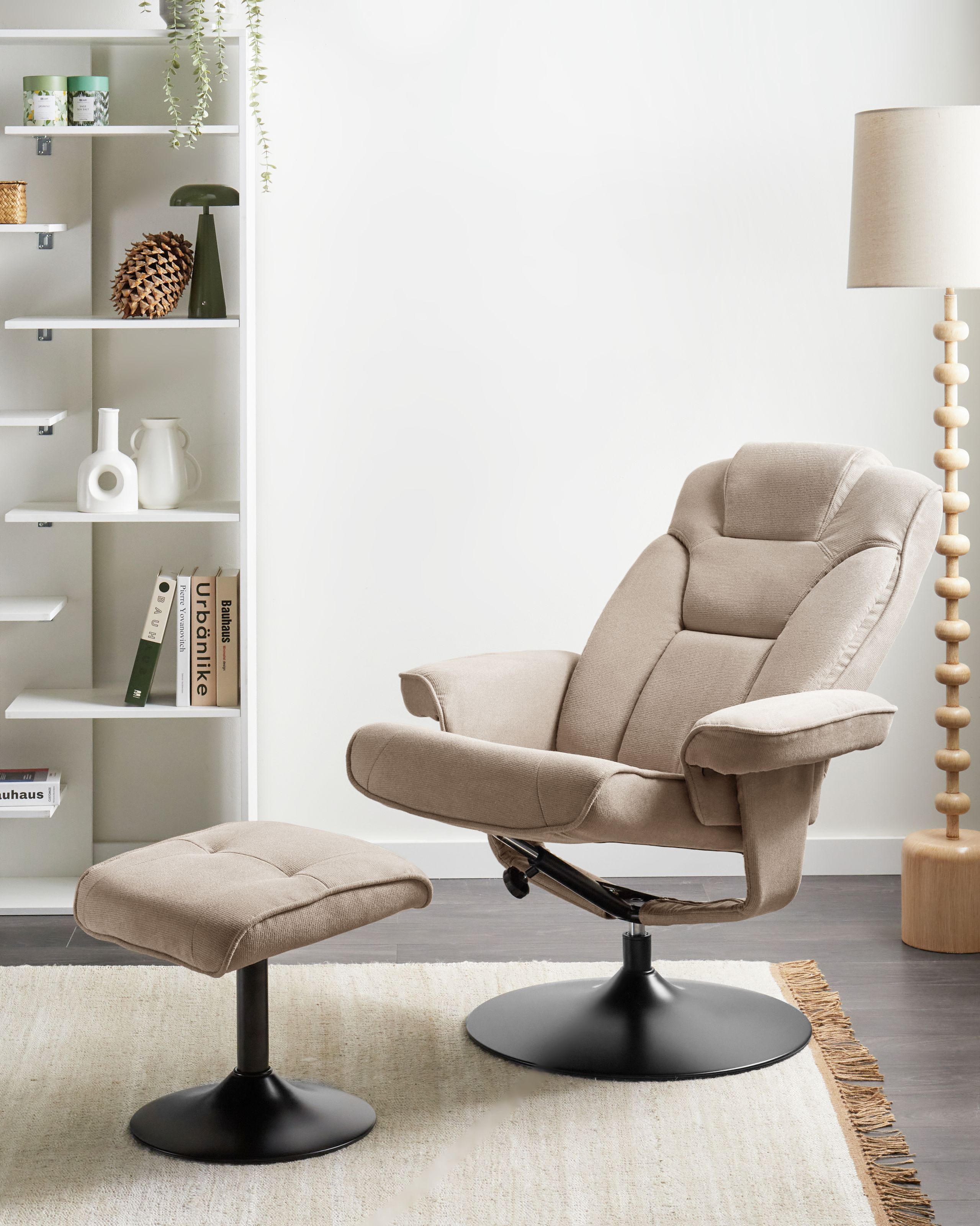 Manuaalisesti säädettävä nojatuoli ja jakkara. Tämä tyylikäs mekanismituoli ja yhteensopiva jakkara on verhoiltu pehmeällä polyesterikankaalla, mikä tekee niistä erinomaiset pitkiin rentoutumishetkiin. Ergonominen selkänoja ja käsinojat tarjoavat erinomaista tukea, ja tukeva rautajalka takaa vakauden. Nojatuoli kääntyy 360 astetta, ja sen selkänoja on mahdollista kallistaa rentoutumiskokemuksen kohottamiseksi. Verhoilu on vettä hylkivää, mikä pitää roiskeet pinnalla ja tekee puhdistamisesta vaivatonta. Nojatuoli sopii täydellisesti olohuoneeseen, työhuoneeseen tai viihtyisään lukunurkkaukseen.