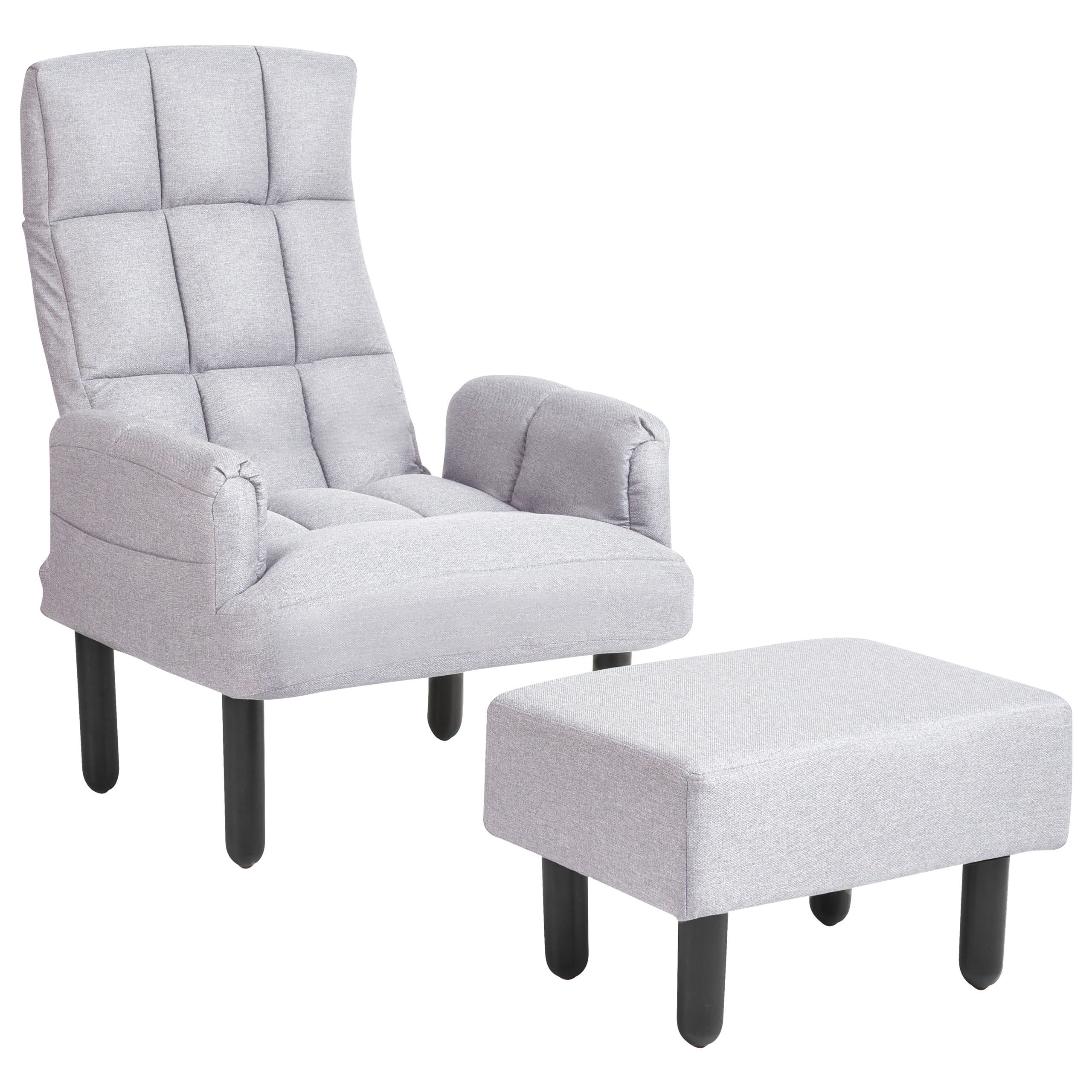 Tikattu nojatuoli säädettävällä selkänojalla. Tämä nojatuoli yhdistää täydellisesti tyylin ja mukavuuden. Istuimen, selkänojan ja käsinojien runsaat pehmusteet pehmeän istumapaikan, kun taas kestävä tikattu verhoilu antaa sille retrohenkisen ilmeen. Tuolin selkänoja on säädettävissä vaivattomasti viiteen eri asentoon. Käsinojien sivuissa sijaitsevien taskujen ansiosta television kaukosäädin, kirja tai aikakauslehti on aina käden ulottuvilla. Settiä täydentää yhteensopiva rahi, joka tarjoaa paikan lepopaikan jaloille.