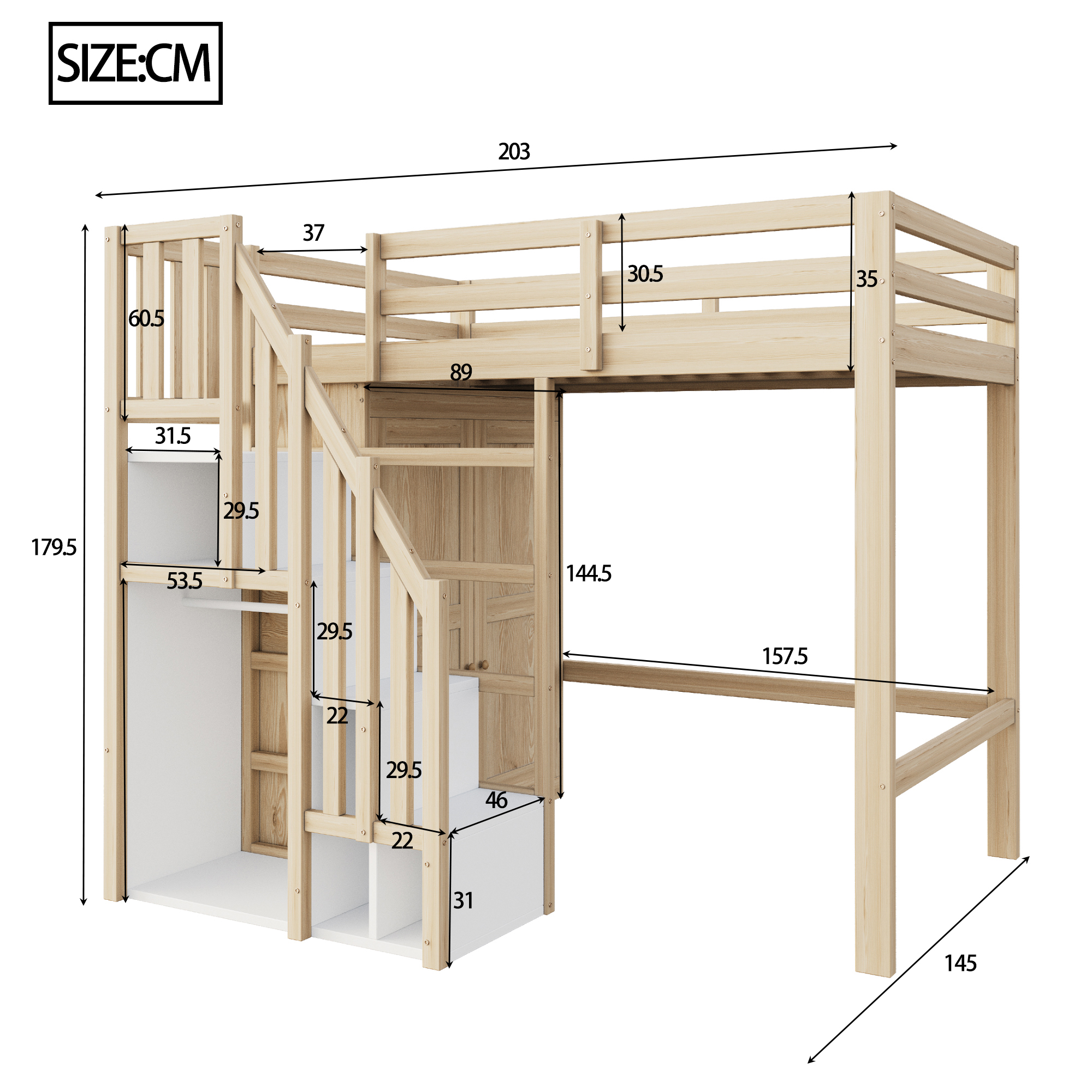 Portaat, joissa on säilytystilaa – Nämä portaat loft-vuoteelle tarjoavat säilytystilaa jokaisen askelman alle ja on suunniteltu turvalliseksi ja mukavaksi kiipeämiseksi, joten voit käyttää niitä mielenrauhalla. Lisäksi viimeisen askelman alla on avoin säilytystila, jossa on vaatekaide arkivaatteillesi.
