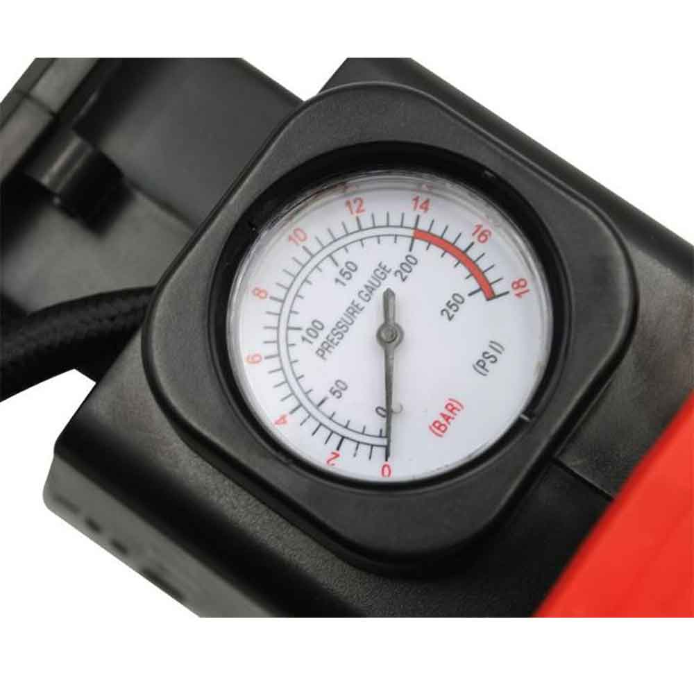 - Kompressorissa on sisäänrakennettu painemittari tarkkoja painemittauksia varten, ja sen alue on 0–200 PSI.