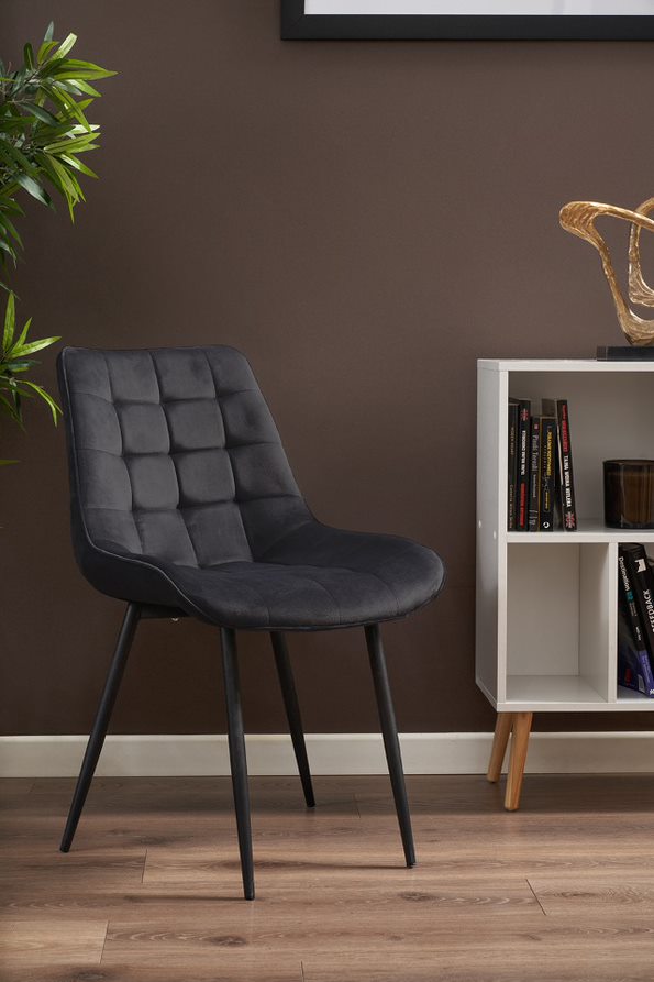MISTY-tuoli on pieni nojatuoli, jonka pehmeä ja tikattu istuin myötäilee vartaloa tarjoten mukavuutta. Samettiverhoilu, valmistettu velour-kankaasta, näyttää erittäin herkältä. Korkeat ja hoikat mustat jalat luovat tyylikkään ulkonäön ja takaavat täydellisen vakauden.