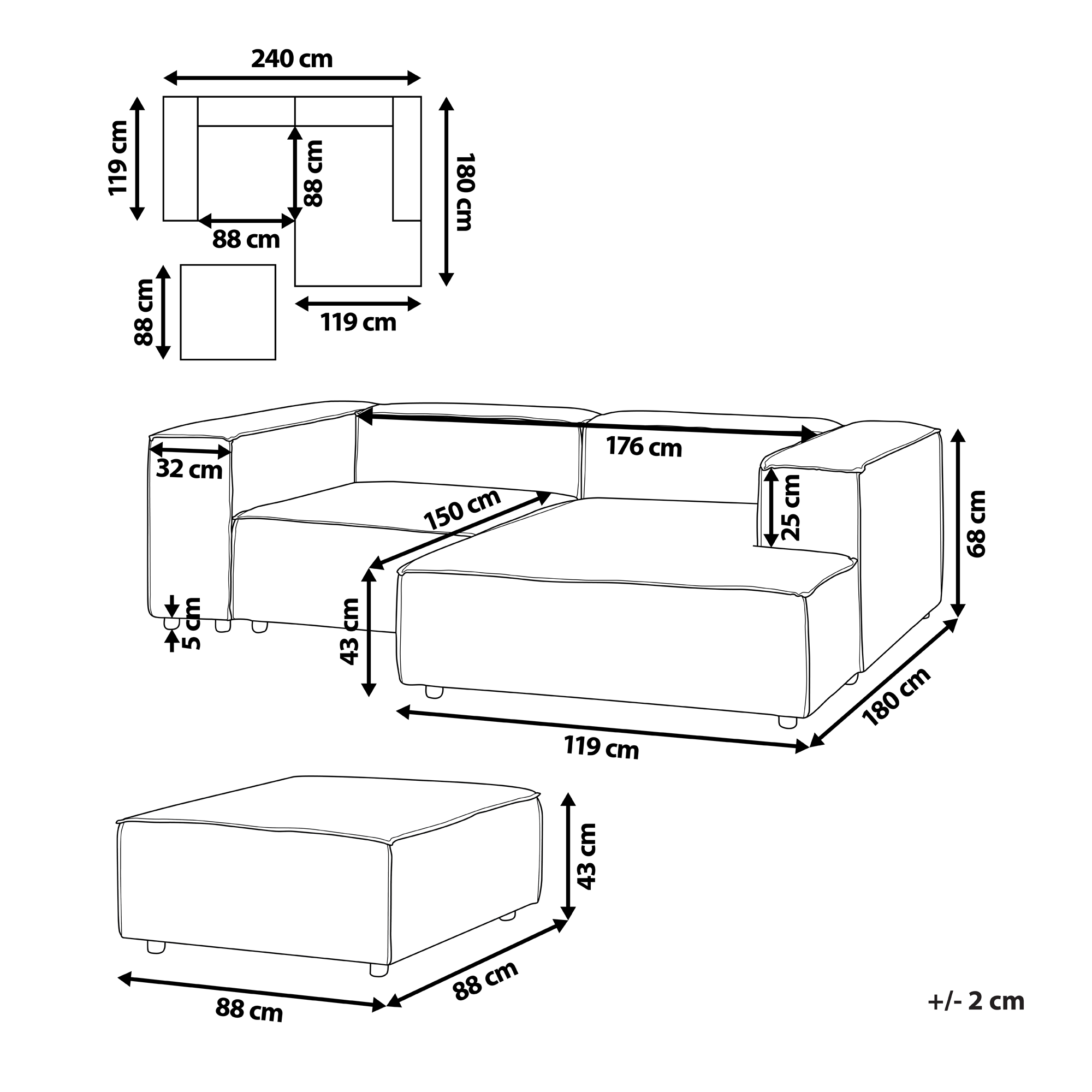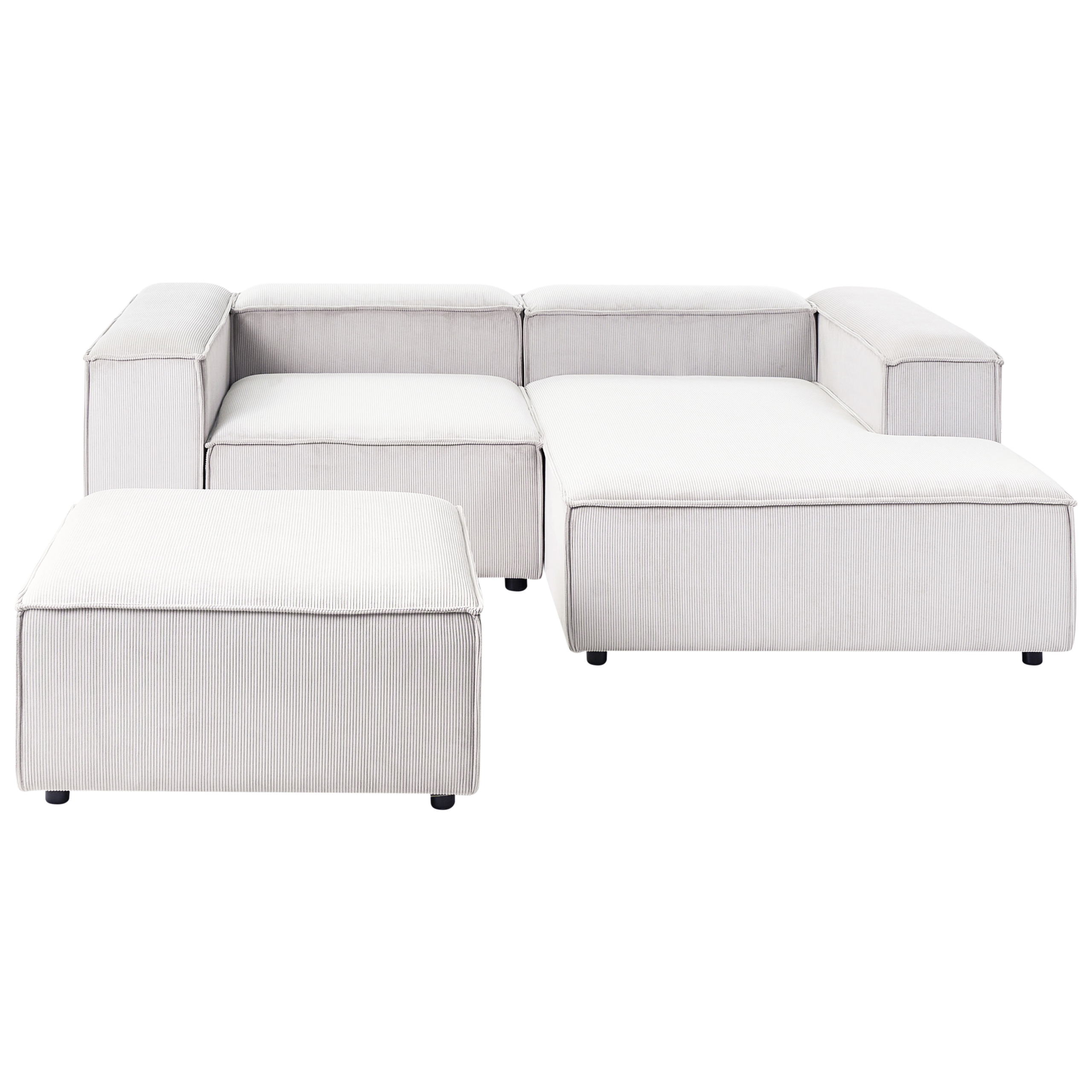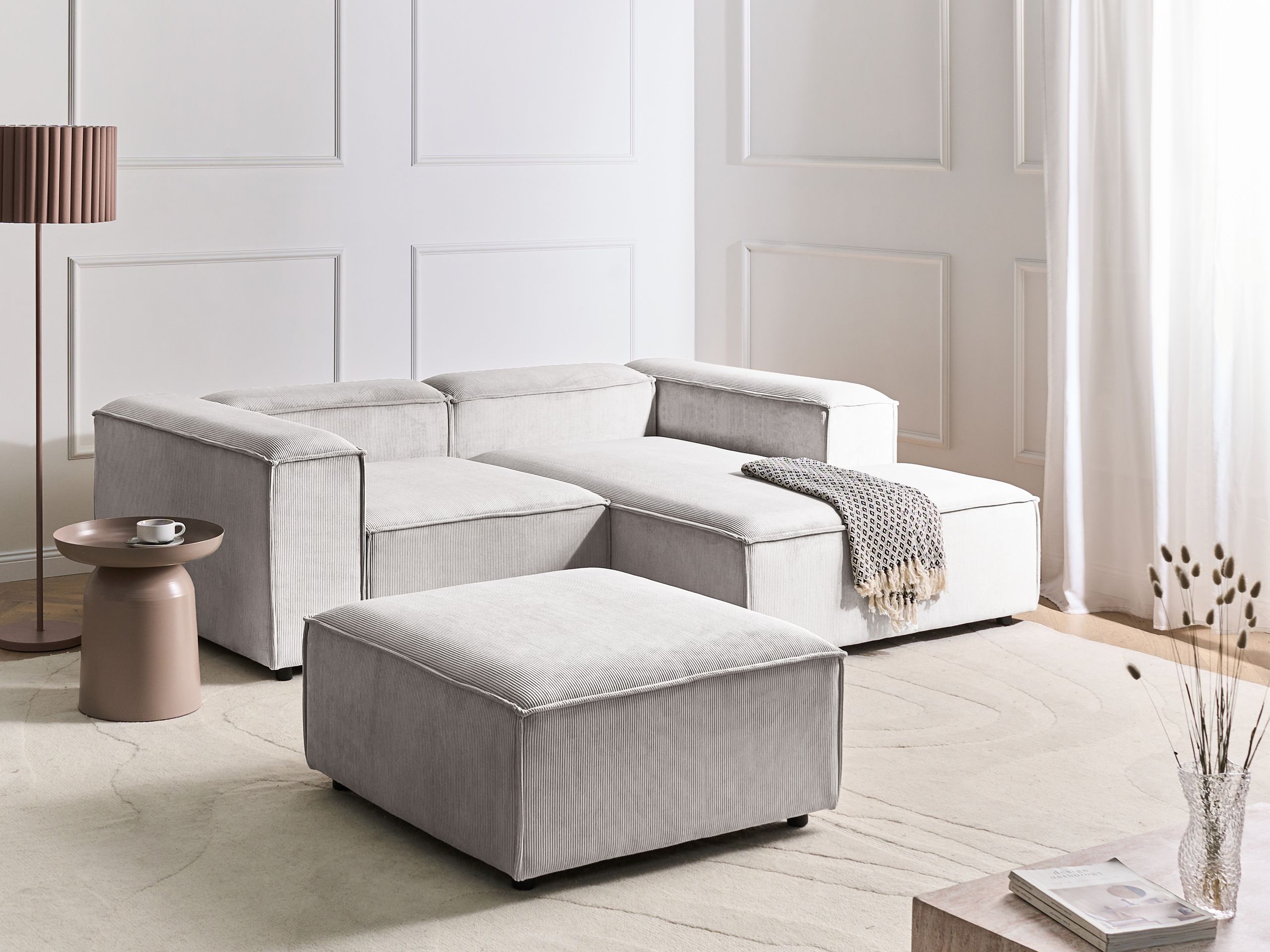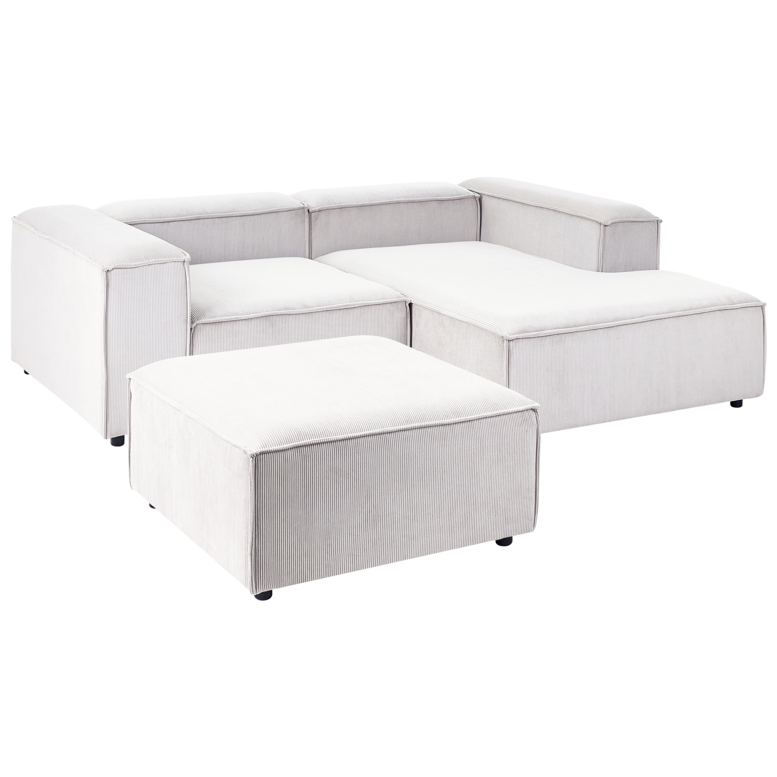 Moderni modulaarinen kulmasohva rahilla. Päivitä olohuoneen sisustusta ja tee sitä kodin tyylikkäin oleskelupaikka tällä moduulikulmasohvalla, jonka mukana tulee yhteensopiva rahi. Pehmeällä ja laadukkaalla vakosametilla verhoillussa kulmasohvassa on kestävä puurakenne ja tukevat mustat synteettiset jalat. Herttainen luonnonvalkoinen sävy saa sen sulautumaan täydellisesti mihin tahansa moderniin tai perinteiseen sisustukseen. Moduulisohva koostuu kahdesta moduulielementistä ja rahista, jotka voidaan asettaa yhteen tai erikseen ainutlaatuisten kokonaisuuksien luomiseksi.