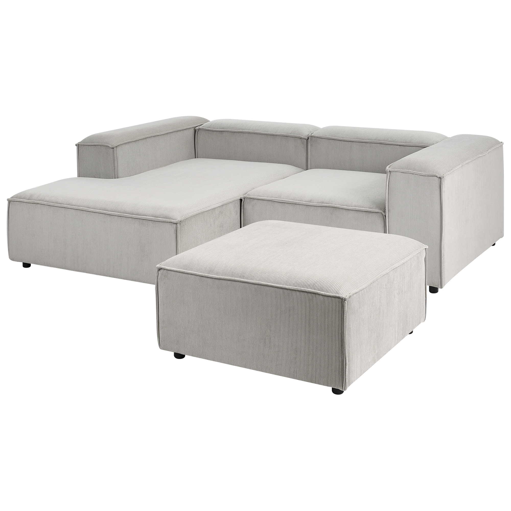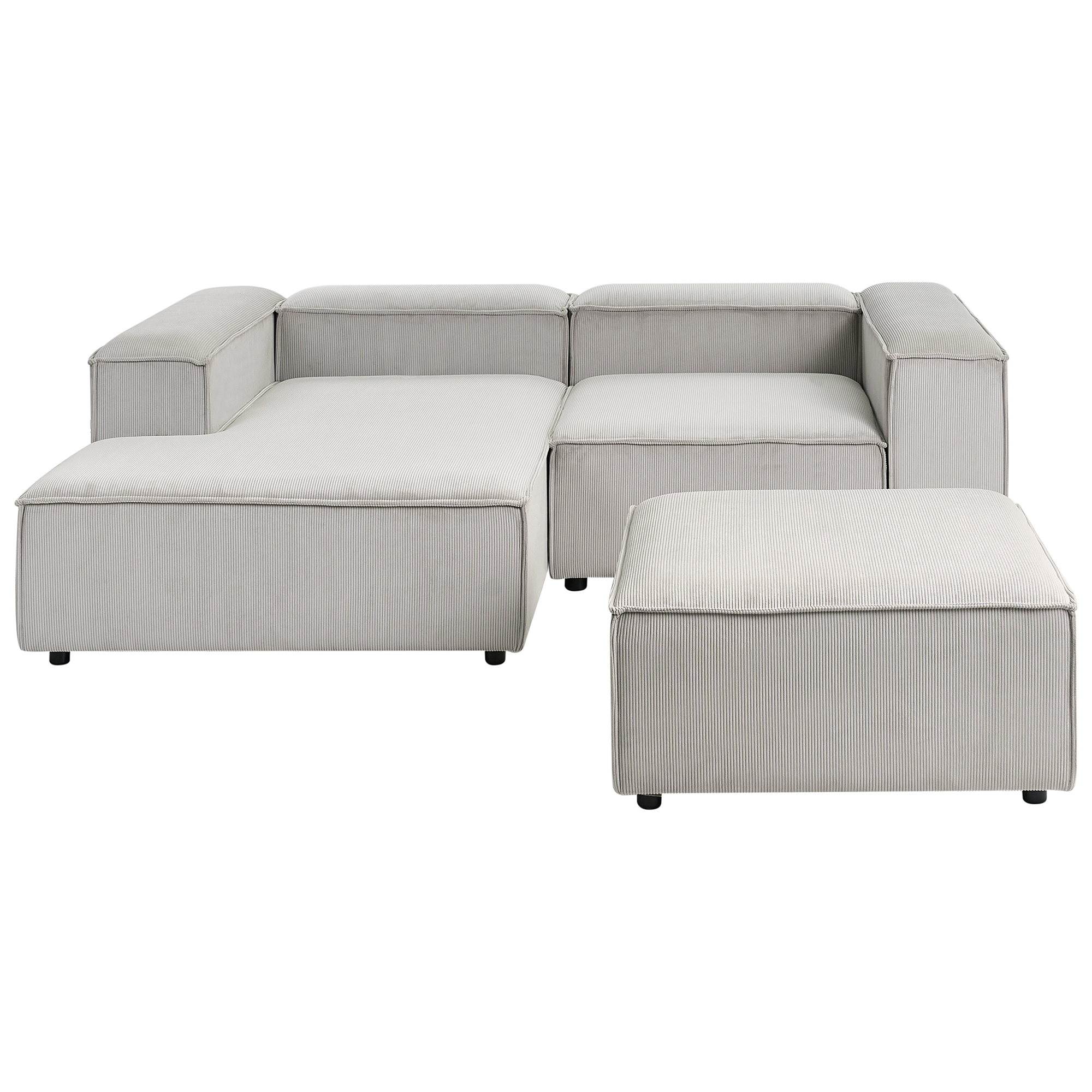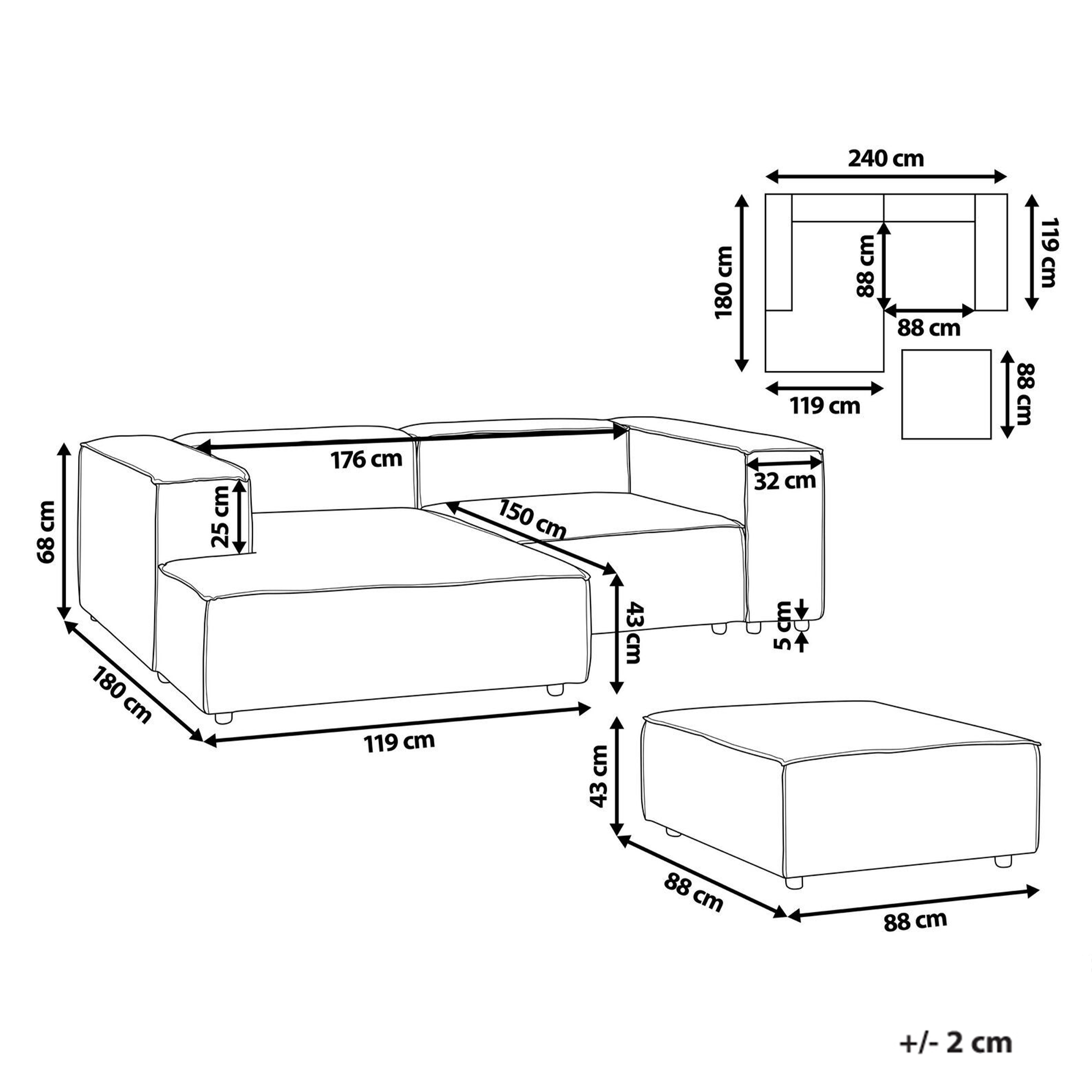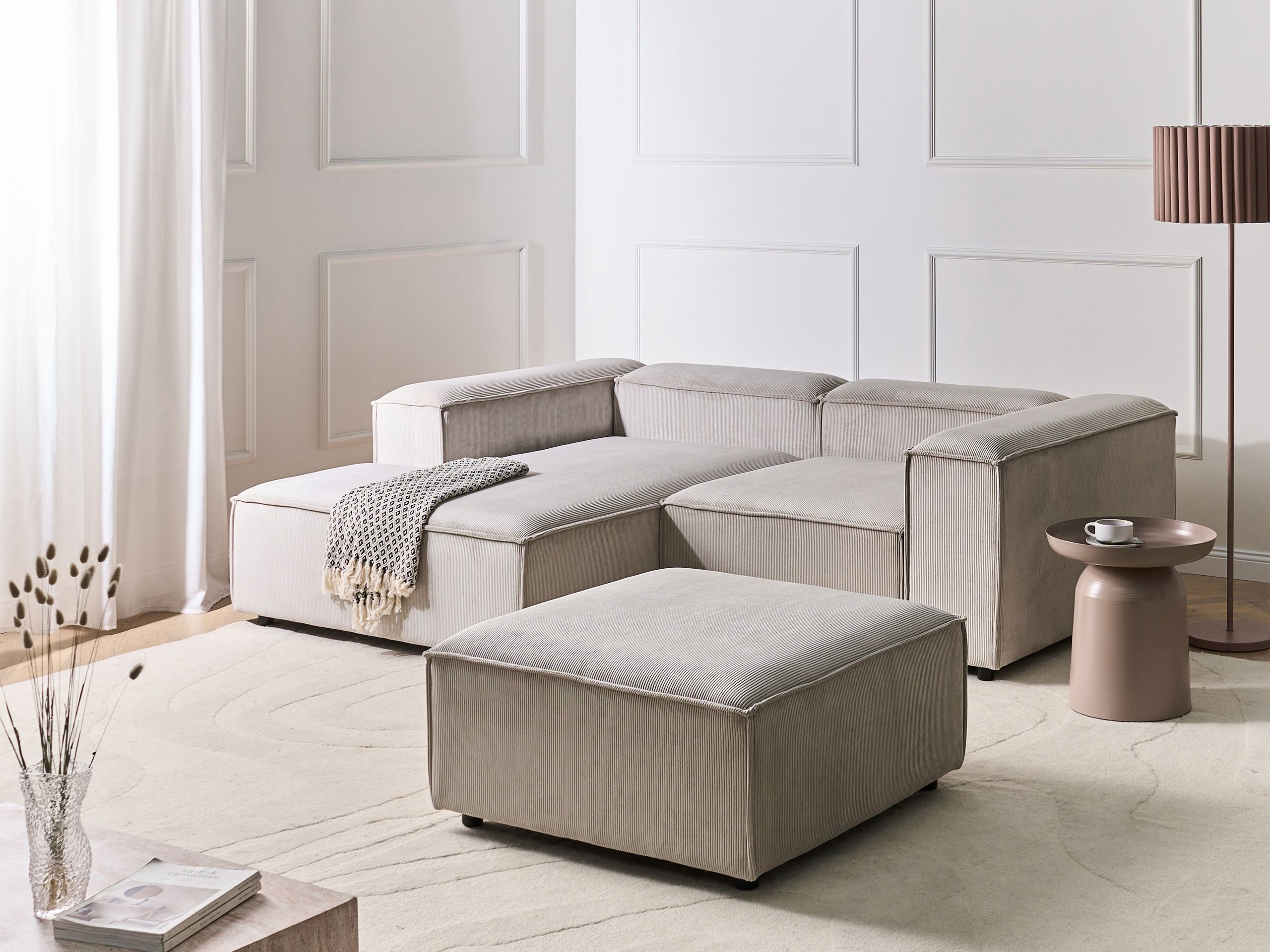 Moderni modulaarinen kulmasohva rahilla. Päivitä olohuoneen sisustusta ja tee sitä kodin tyylikkäin oleskelupaikka tällä moduulikulmasohvalla, jonka mukana tulee yhteensopiva rahi. Pehmeällä ja laadukkaalla vakosametilla verhoillussa kulmasohvassa on kestävä puurakenne ja tukevat mustat synteettiset jalat. Herttainen ruskeanharmaa sävy saa sen sulautumaan täydellisesti mihin tahansa moderniin tai perinteiseen sisustukseen. Moduulisohva koostuu kahdesta moduulielementistä ja rahista, jotka voidaan asettaa yhteen tai erikseen ainutlaatuisten kokonaisuuksien luomiseksi.