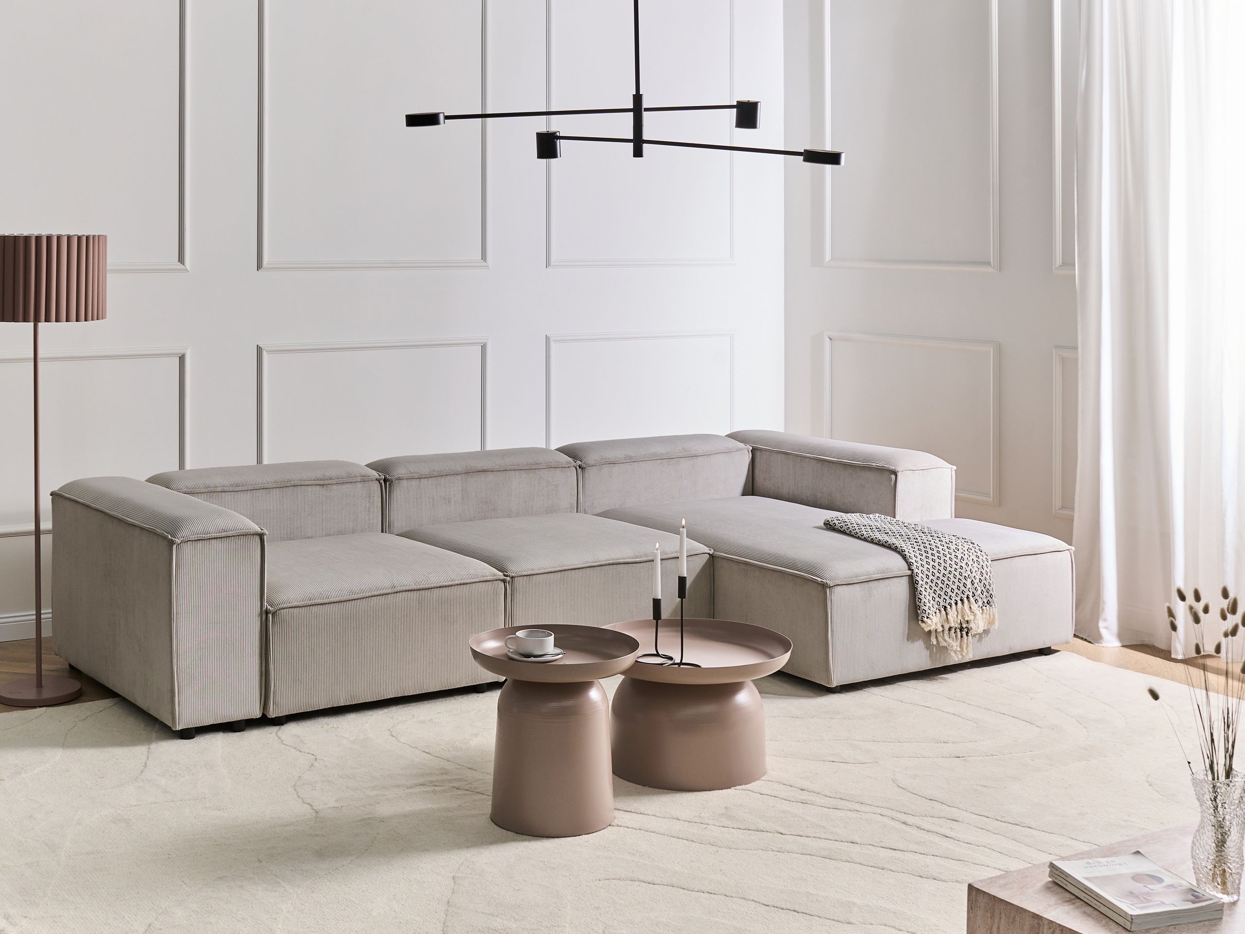 Moderni modulaarinen kulmasohva. Päivitä olohuoneen sisustusta ja tee sitä kodin tyylikkäin oleskelupaikka tällä moduulikulmasohvalla. Pehmeällä ja laadukkaalla vakosametilla verhoillussa kulmasohvassa on kestävä puurakenne ja tukevat mustat synteettiset jalat. Herttainen ruskeanharmaa sävy saa sen sulautumaan täydellisesti mihin tahansa moderniin tai perinteiseen sisustukseen. Moduulisohva koostuu kolmesta moduulielementistä, jotka voidaan asettaa yhteen tai erikseen ainutlaatuisten kokonaisuuksien luomiseksi.