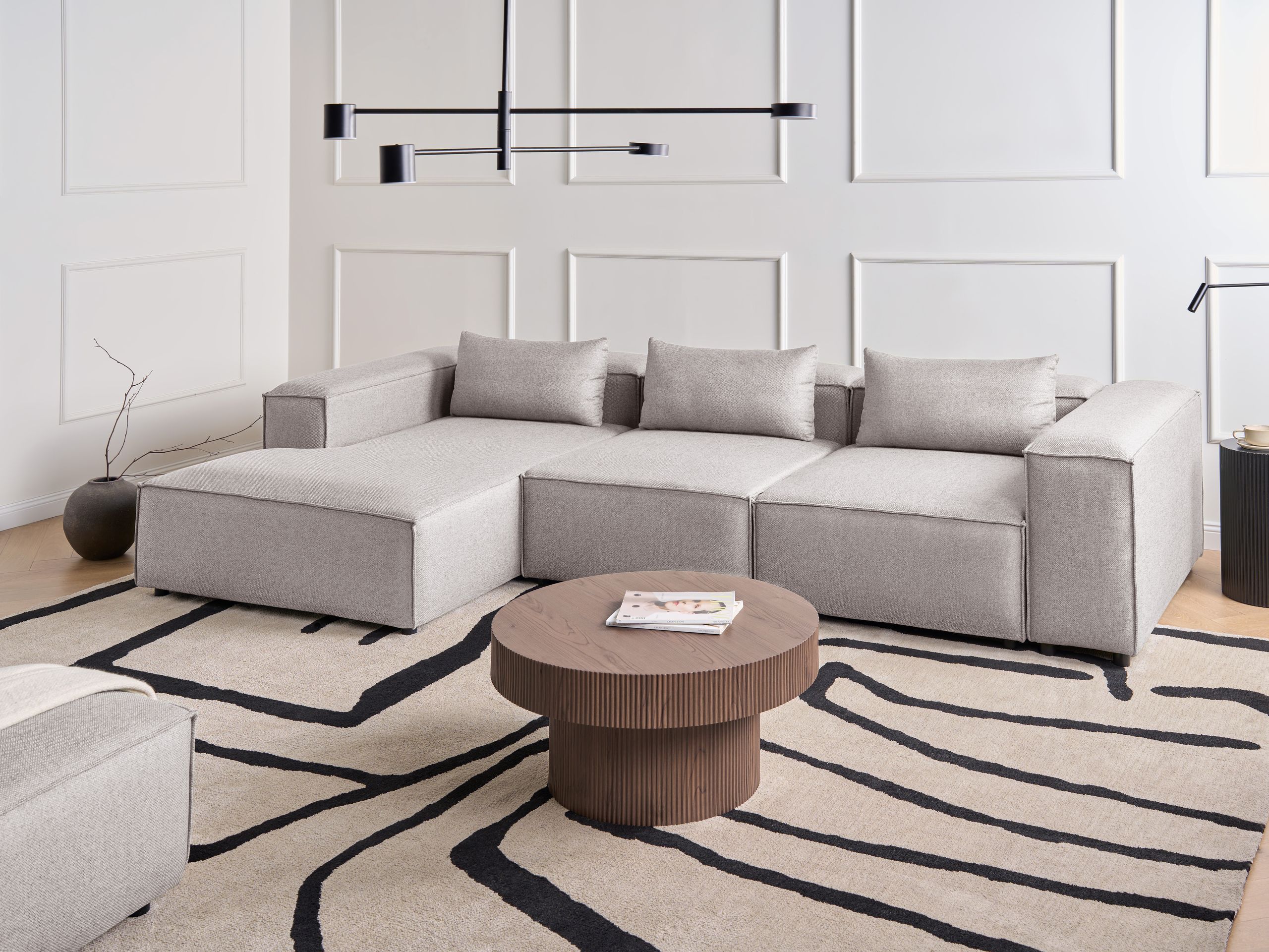 Moderni muunneltava divaanisohva koristetyynyillä. Tämä päivittäiseen rentoutumiseen suunniteltu 4-istuttava moduulikulmasohva tarjoaa runsaasti tilaa istumiseen, oleskeluun ja jopa loikoiluun. Leveä istuinalue, jota täydentävät kolme pehmeää koristetyynyä, takaa optimaalisen mukavuuden pitkiin iltoihin ja rentoihin kokoontumisiin. Kulmasohva on verhoiltu laadukkaalla, vettä hylkivällä polyesterikankaalla, joka on helppohoitoinen ja kulutusta kestävä. Se koostuu kolmesta moduuliosasta, jotka voidaan järjestää joustavasti eri kokoonpanoihin – yhdessä tai erikseen. Sohva on tyylikäs ja toimiva keskipiste moderniin olohuoneeseen, käytettiinpä sitä sitten lukemiseen, television katseluun tai vieraiden viihdyttämiseen.