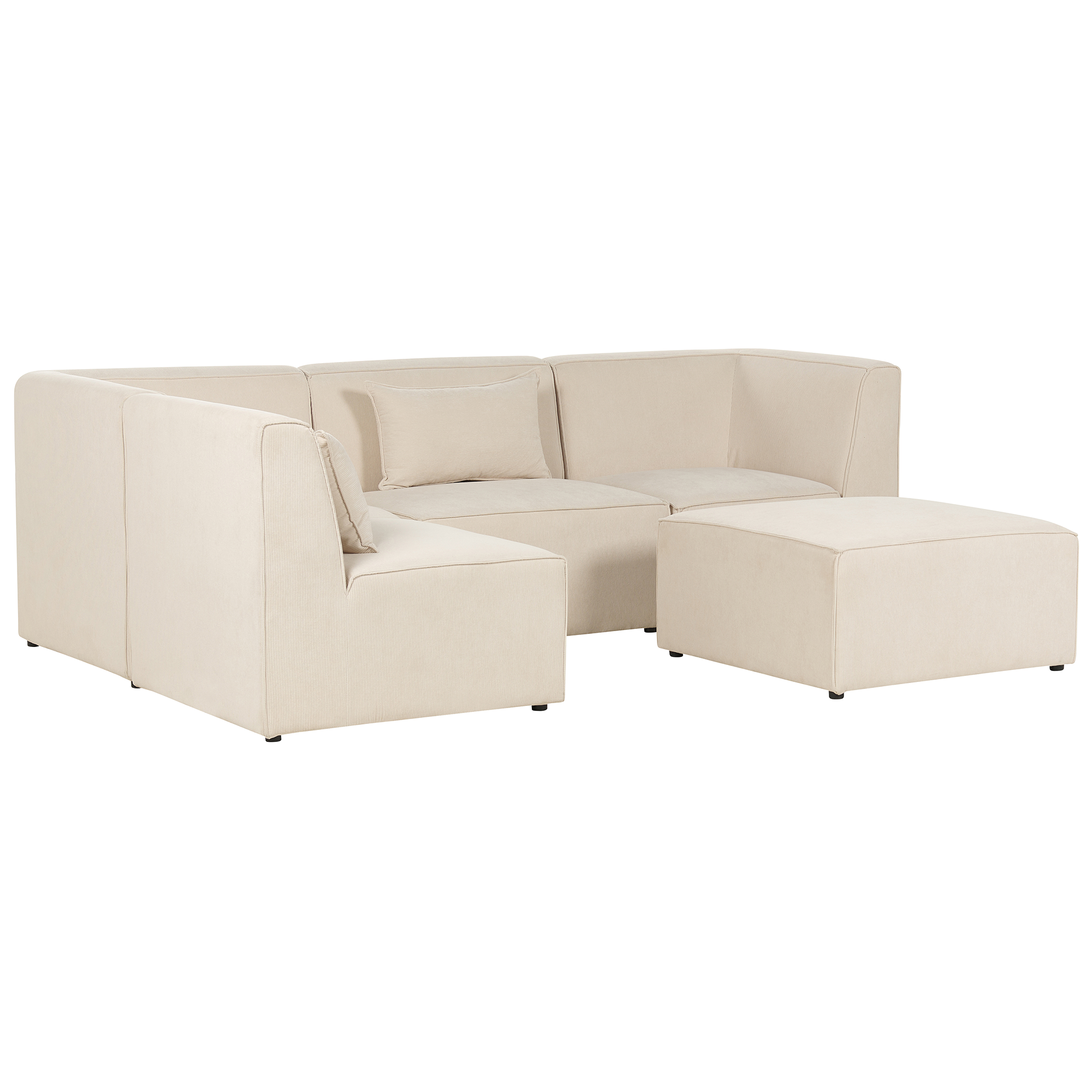 Tyylikäs ja mukava moduulisohva rahilla. Tee olohuoneesta tyylikäs ja huoliteltu tällä minimalistisen modernilla moduulikulmasohvalla. Sen pehmeän tuntuisen vakosamettiverhoilun uurteet antavat sohvalle kauniin ulkonäön, kun taas muovijalat takaavat vakauden ja tukevuuden. Se koostuu neljästä moduuliosasta, jotka voidaan asettaa yhteen tai erikseen erilaisten kokonaisuuksien muodostamiseksi. Mukana tulee monikäyttöinen rahi, jota voidaan käyttää niin lisäistuimena, jalkatukena kuin pöytänäkin. Koristetyynyissä on irrotettavat päälliset, jotka mahdollistavat helpon puhdistuksen ilman huolta tahroista.