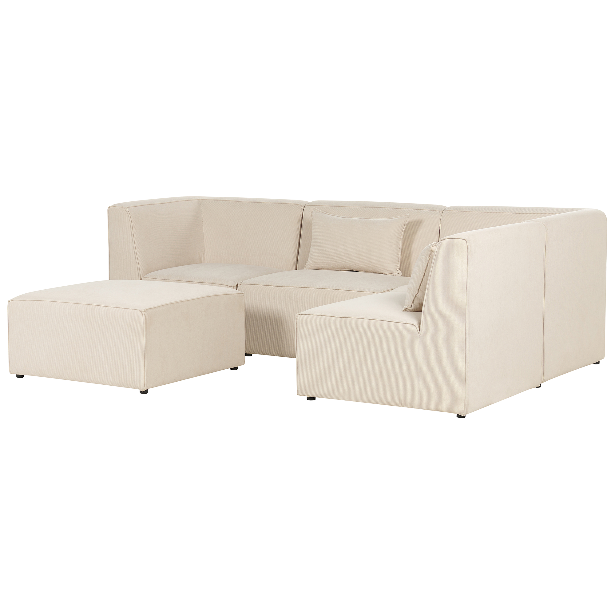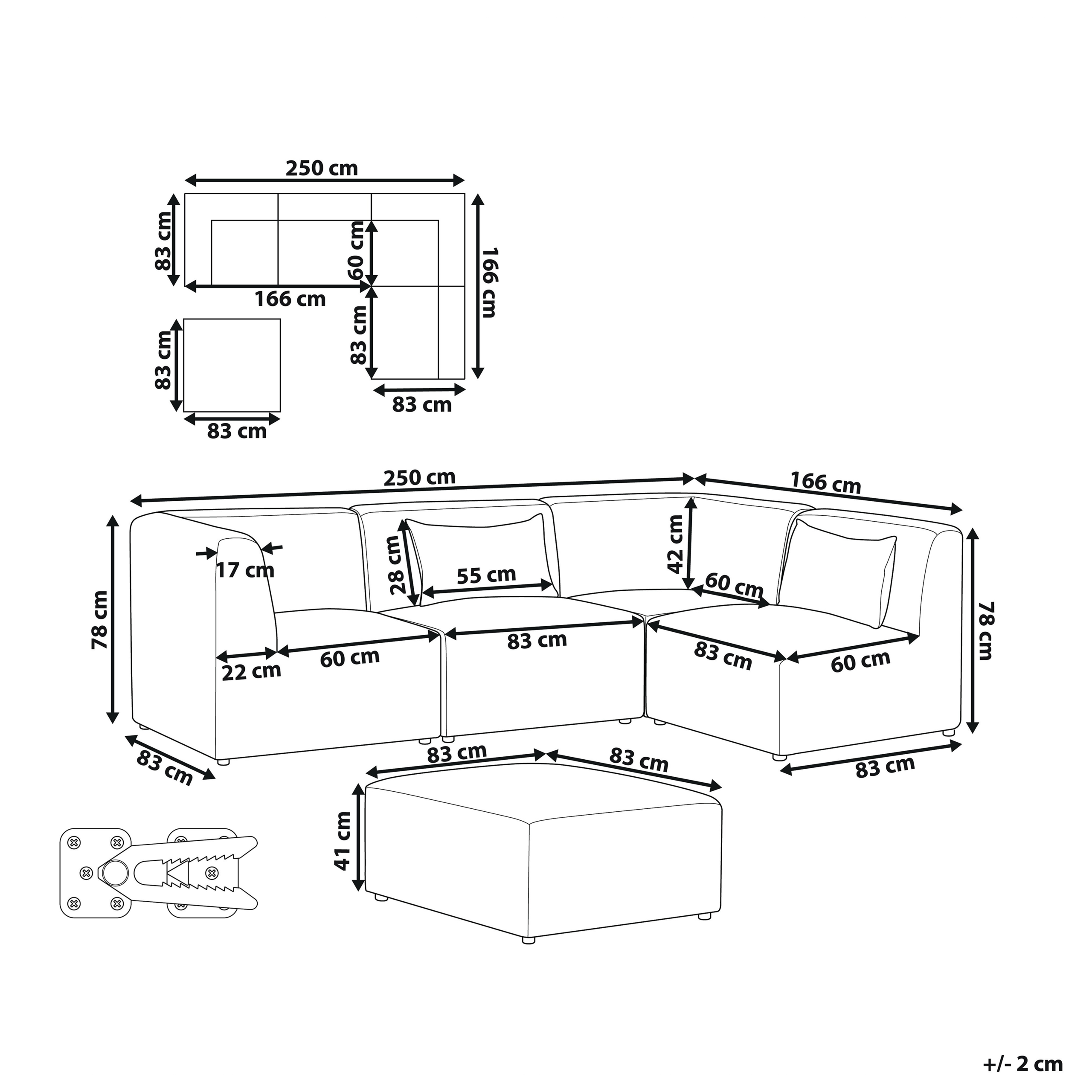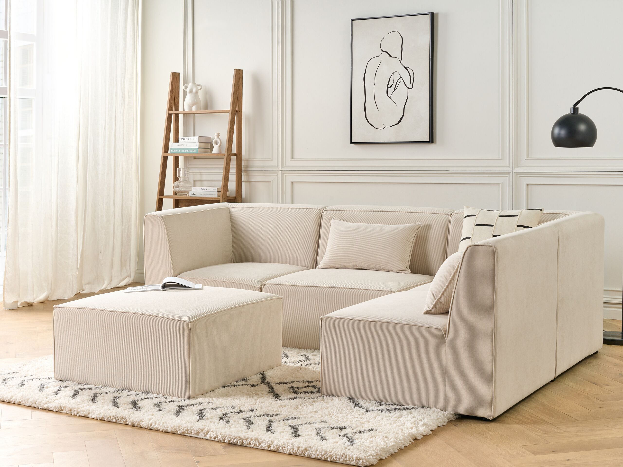 Tyylikäs ja mukava moduulisohva rahilla. Tee olohuoneesta tyylikäs ja huoliteltu tällä minimalistisen modernilla moduulikulmasohvalla. Sen pehmeän tuntuisen vakosamettiverhoilun uurteet antavat sohvalle kauniin ulkonäön, kun taas muovijalat takaavat vakauden ja tukevuuden. Se koostuu neljästä moduuliosasta, jotka voidaan asettaa yhteen tai erikseen erilaisten kokonaisuuksien muodostamiseksi. Mukana tulee monikäyttöinen rahi, jota voidaan käyttää niin lisäistuimena, jalkatukena kuin pöytänäkin. Koristetyynyissä on irrotettavat päälliset, jotka mahdollistavat helpon puhdistuksen ilman huolta tahroista.
