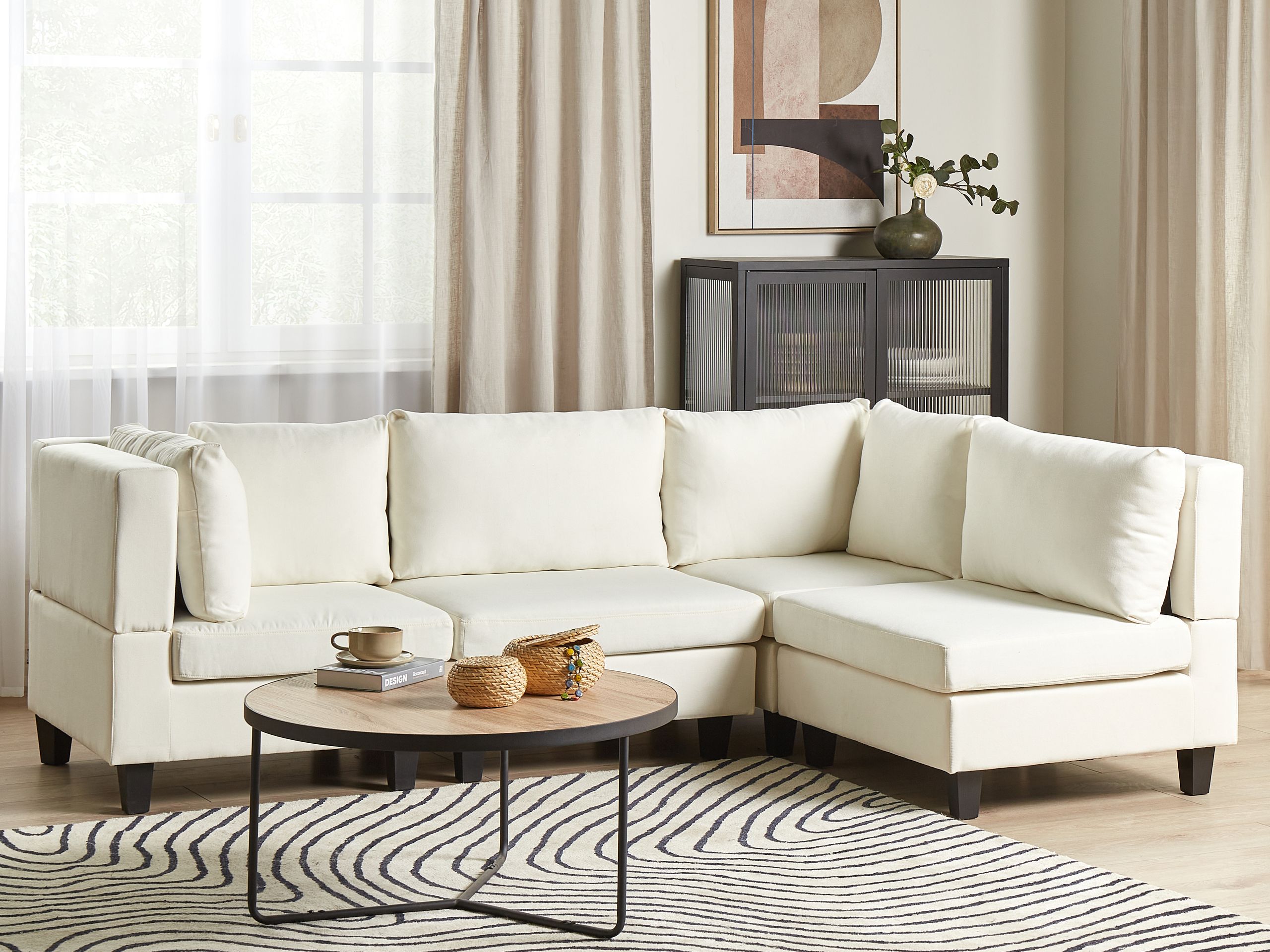 Skandinaavinen modulaarinen kulmasohva. Tämä moduulikulmasohva on upea, monikäyttöinen lisä jokaiseen olohuoneeseen. Se koostuu neljästä moduuliosasta, jotka voidaan yhdistää toisiinsa klassiseksi 4-istuttavaksi kulmasohvaksi tai käyttää erillisinä istuimina. Miellyttävän tuntuisella polyesterikankaalla verhoiltu sohva on erittäin kestävä. Paksusti pehmustetut istuinosat ja selkänojat tarjoavat erinomaisen istumamukavuuden. Koko rakenne on myös vakaa leveiden mustien jalkojen ansiosta.