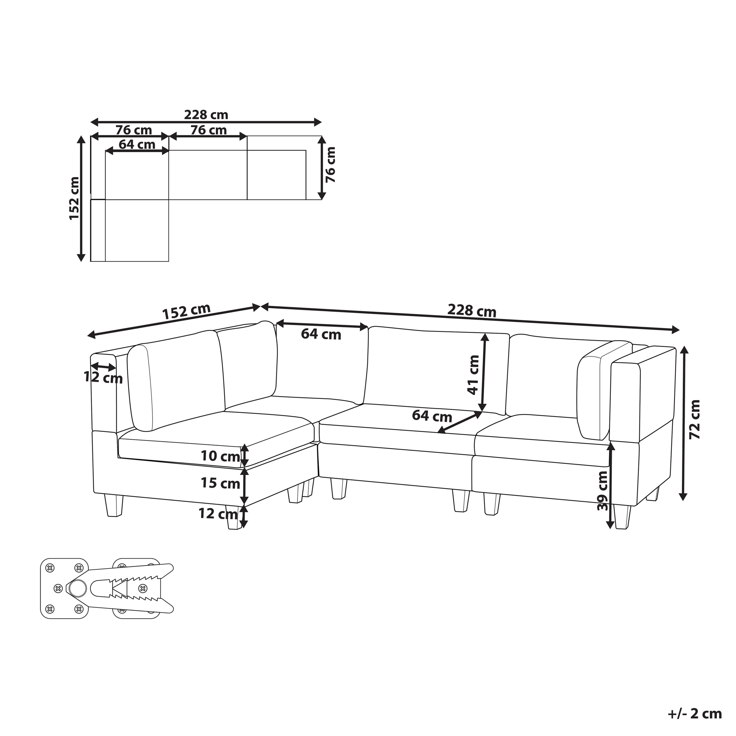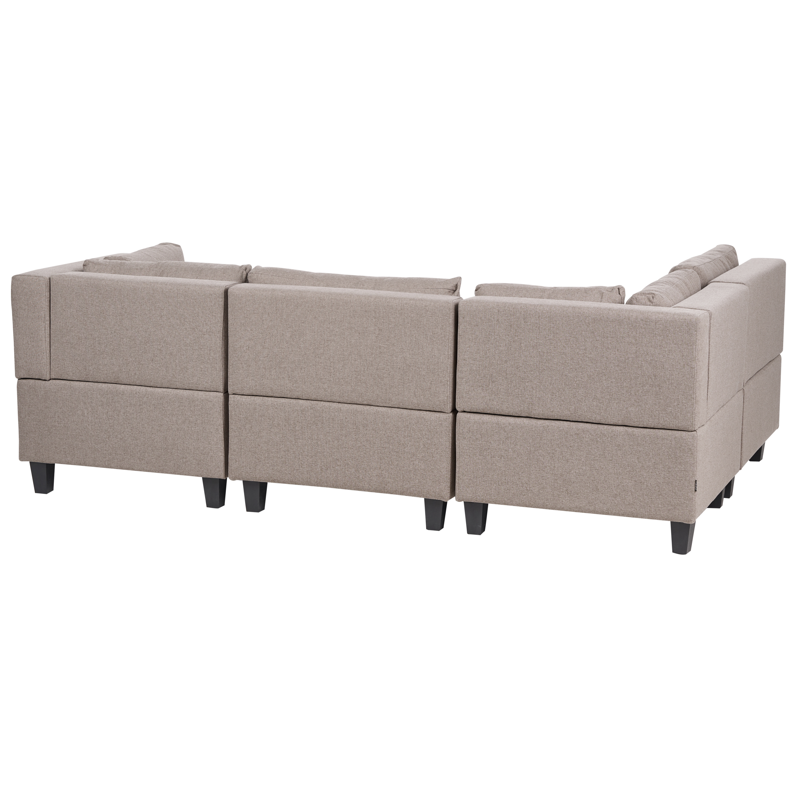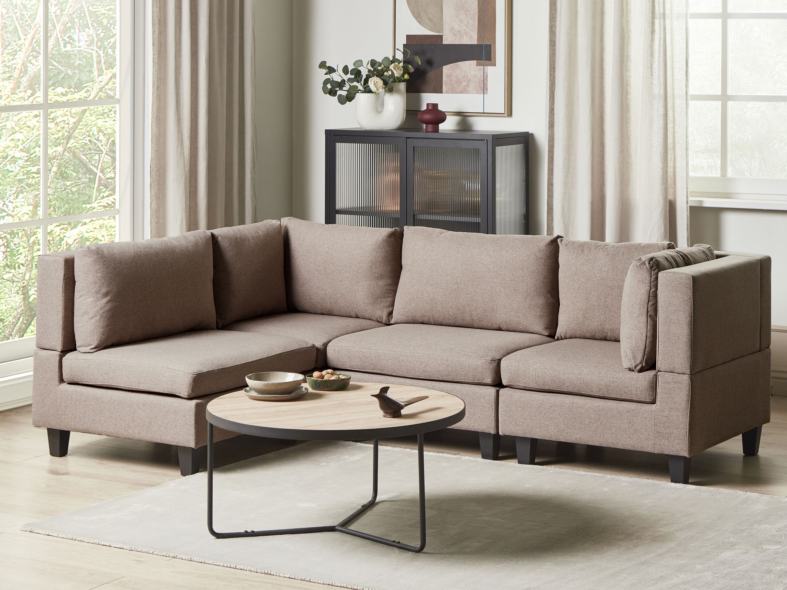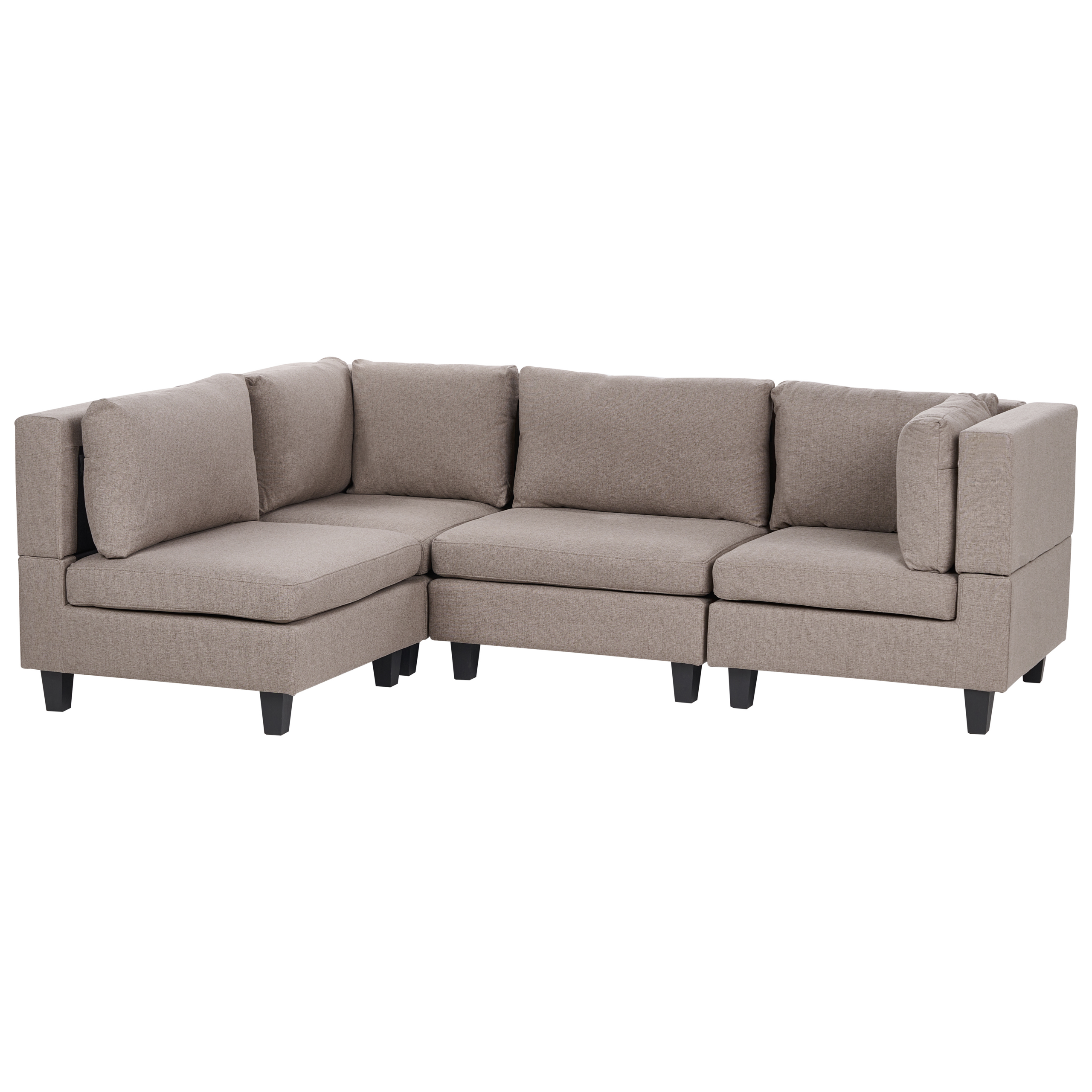Skandinaavinen modulaarinen kulmasohva. Tämä moduulikulmasohva on upea, monikäyttöinen lisä jokaiseen olohuoneeseen. Se koostuu neljästä moduuliosasta, jotka voidaan yhdistää toisiinsa klassiseksi 4-istuttavaksi kulmasohvaksi tai käyttää erillisinä istuimina. Miellyttävän tuntuisella polyesterikankaalla verhoiltu sohva on erittäin kestävä. Paksusti pehmustetut istuinosat ja selkänojat tarjoavat erinomaisen istumamukavuuden. Koko rakenne on myös vakaa leveiden mustien jalkojen ansiosta.