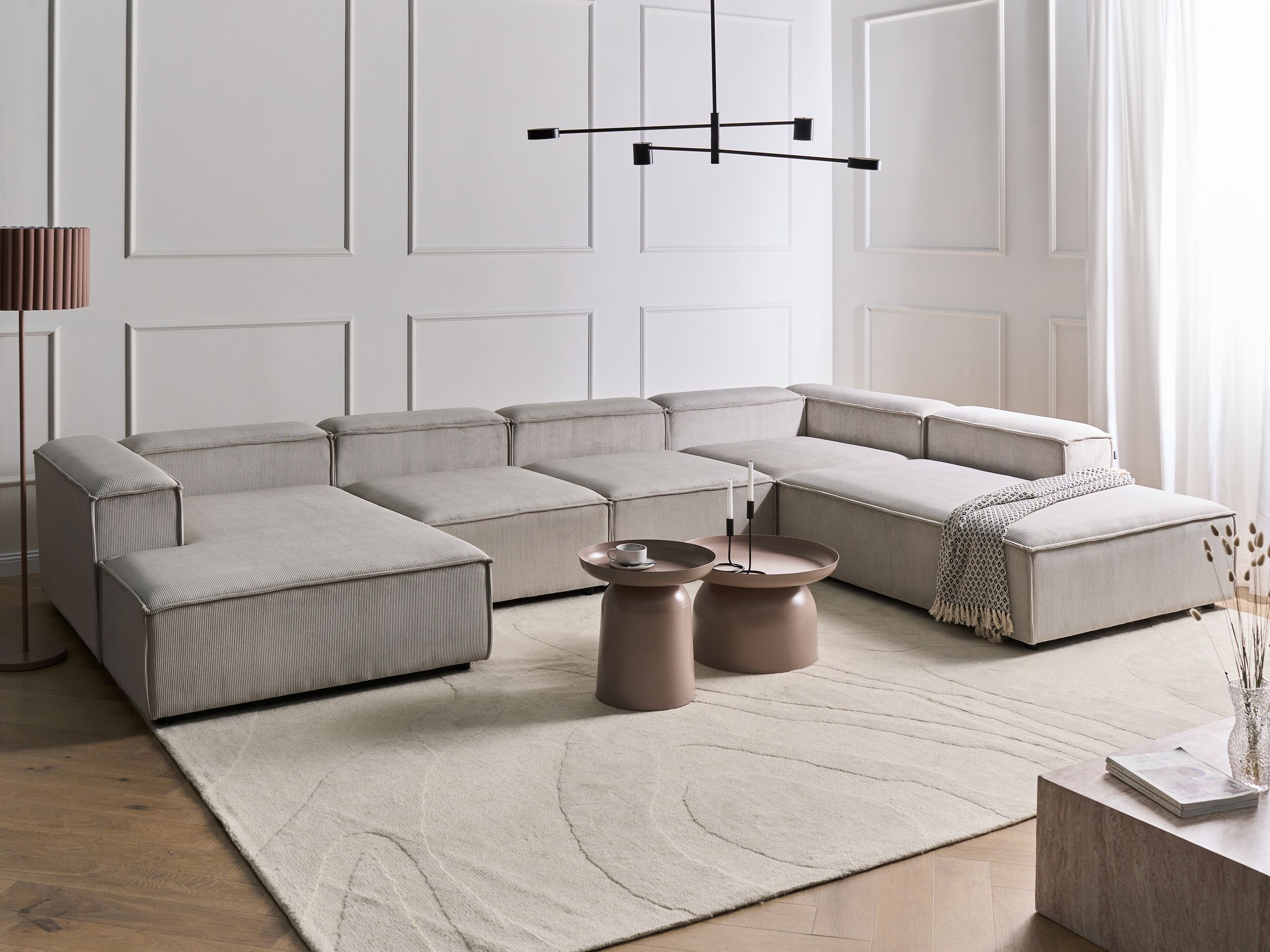 Moderni modulaarinen kulmasohva. Päivitä olohuoneen sisustusta ja tee sitä kodin tyylikkäin oleskelupaikka tällä moduulikulmasohvalla. Pehmeällä ja laadukkaalla vakosametilla verhoillussa kulmasohvassa on kestävä puurakenne ja tukevat mustat synteettiset jalat. Herttainen ruskeanharmaa sävy saa sen sulautumaan täydellisesti mihin tahansa moderniin tai perinteiseen sisustukseen. Moduulisohva koostuu viidestä moduulielementistä, jotka voidaan asettaa yhteen tai erikseen ainutlaatuisten kokonaisuuksien luomiseksi.