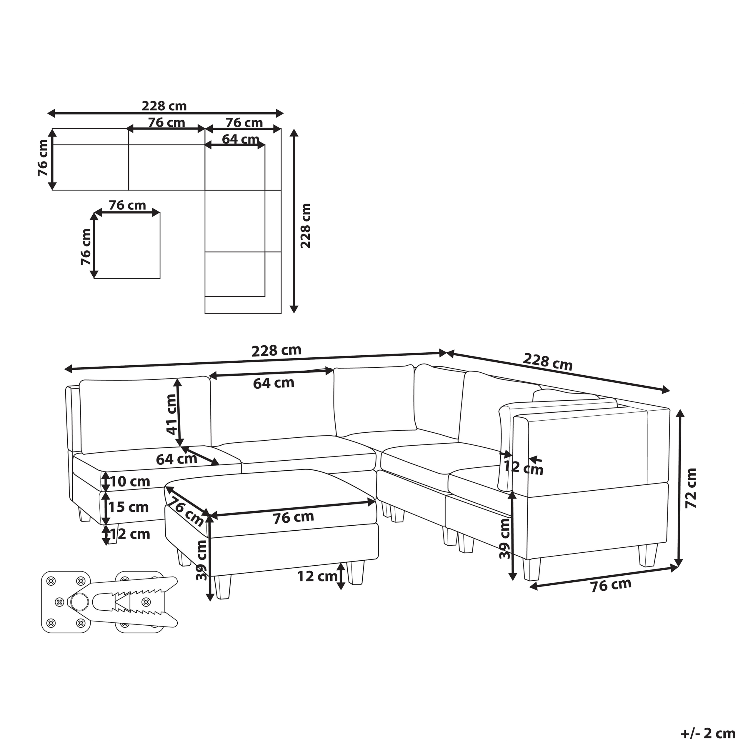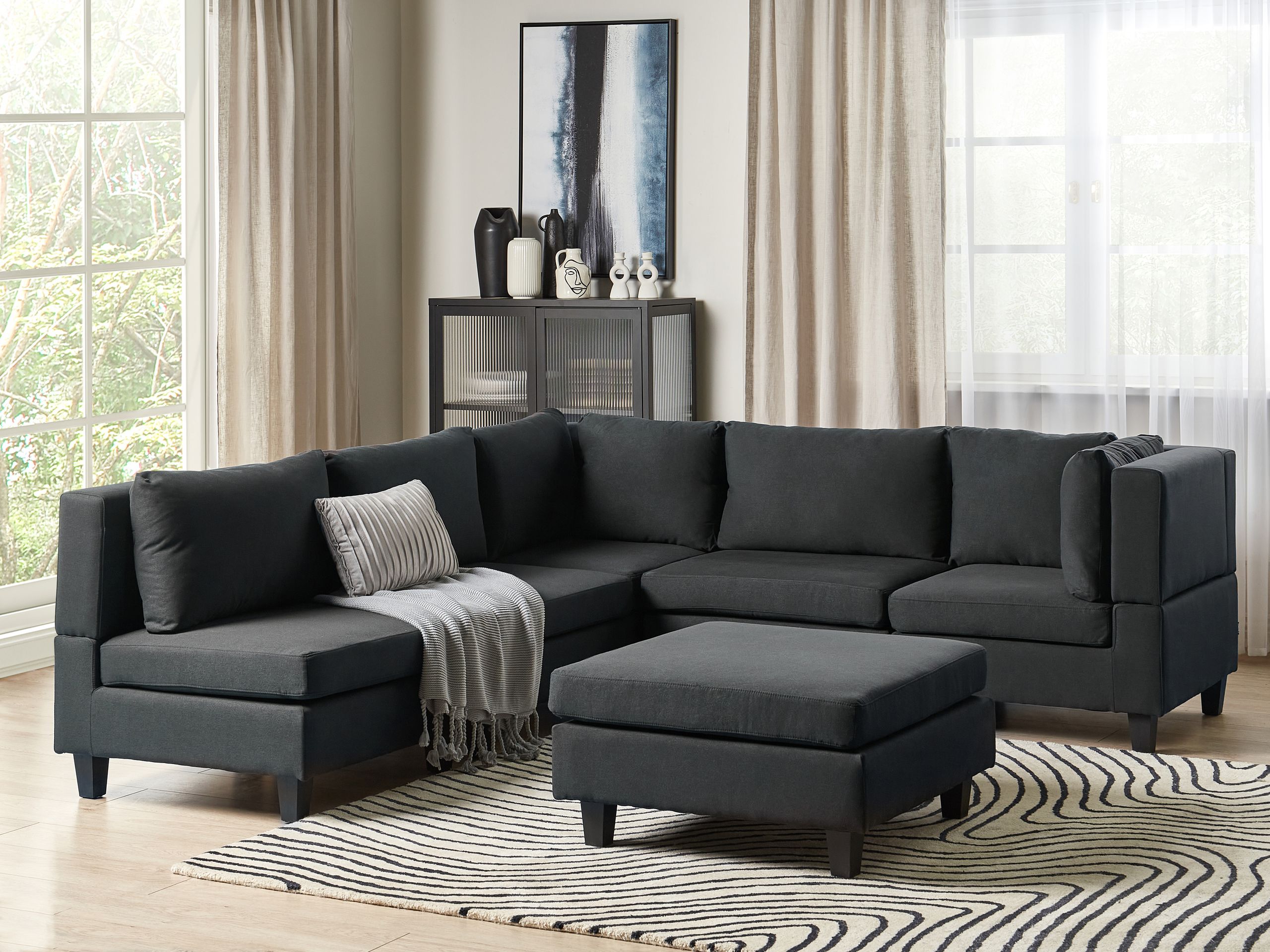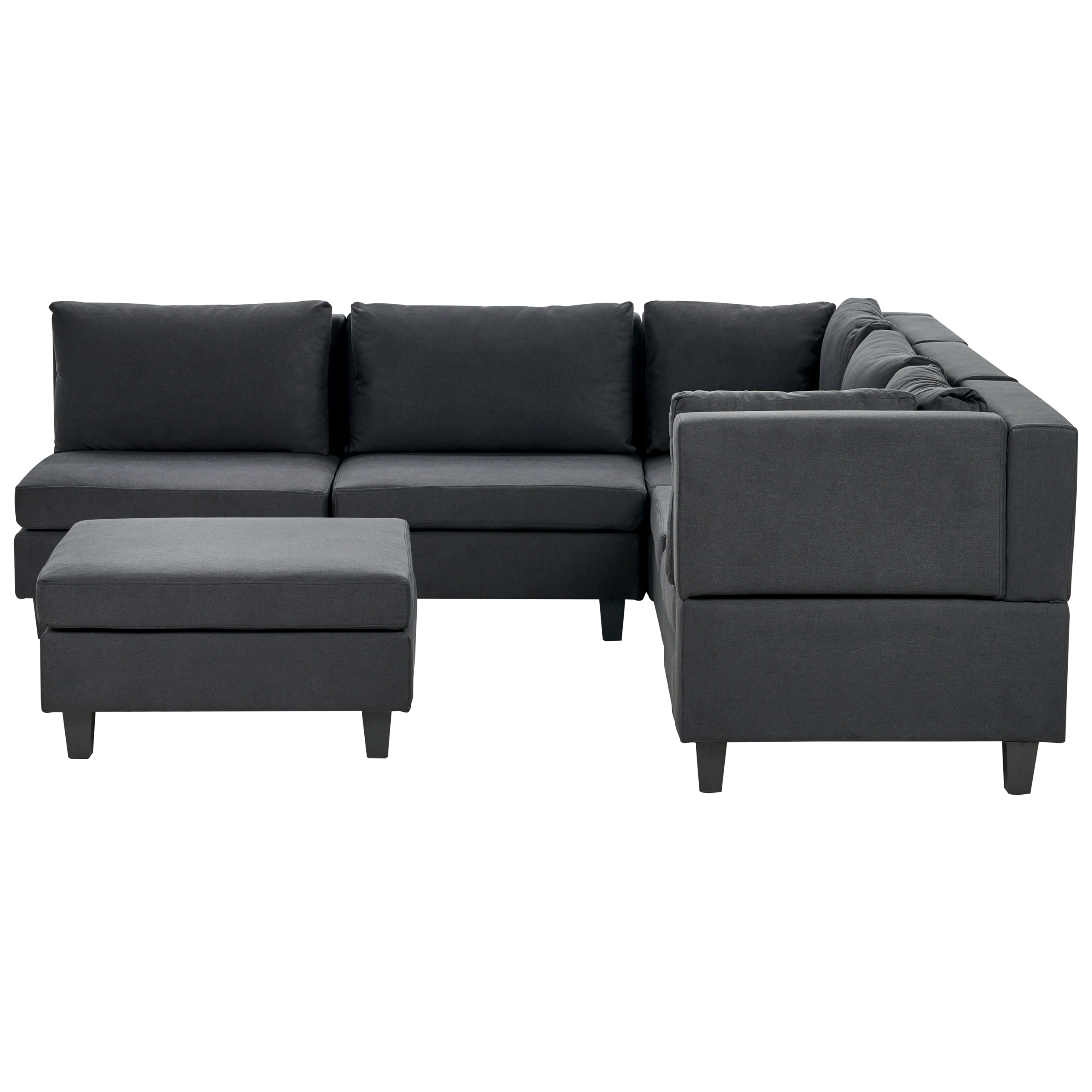 Skandinaavinen modulaarinen kulmasohva rahilla. Tämä moduulikulmasohva on upea, monikäyttöinen lisä jokaiseen olohuoneeseen. Se koostuu viidestä moduuliosasta, jotka voidaan yhdistää toisiinsa klassiseksi 5-istuttavaksi kulmasohvaksi tai käyttää erillisinä istuimina. Miellyttävän tuntuisella polyesterikankaalla verhoiltu sohva on erittäin kestävä. Paksusti pehmustetut istuinosat ja selkänojat tarjoavat erinomaisen istumamukavuuden. Koko rakenne on myös vakaa leveiden mustien jalkojen ansiosta. Lisäksi sohvan mukana toimitetaan suuri rahi, jota voidaan käyttää sekä lisäistuimena että jalkatukena.