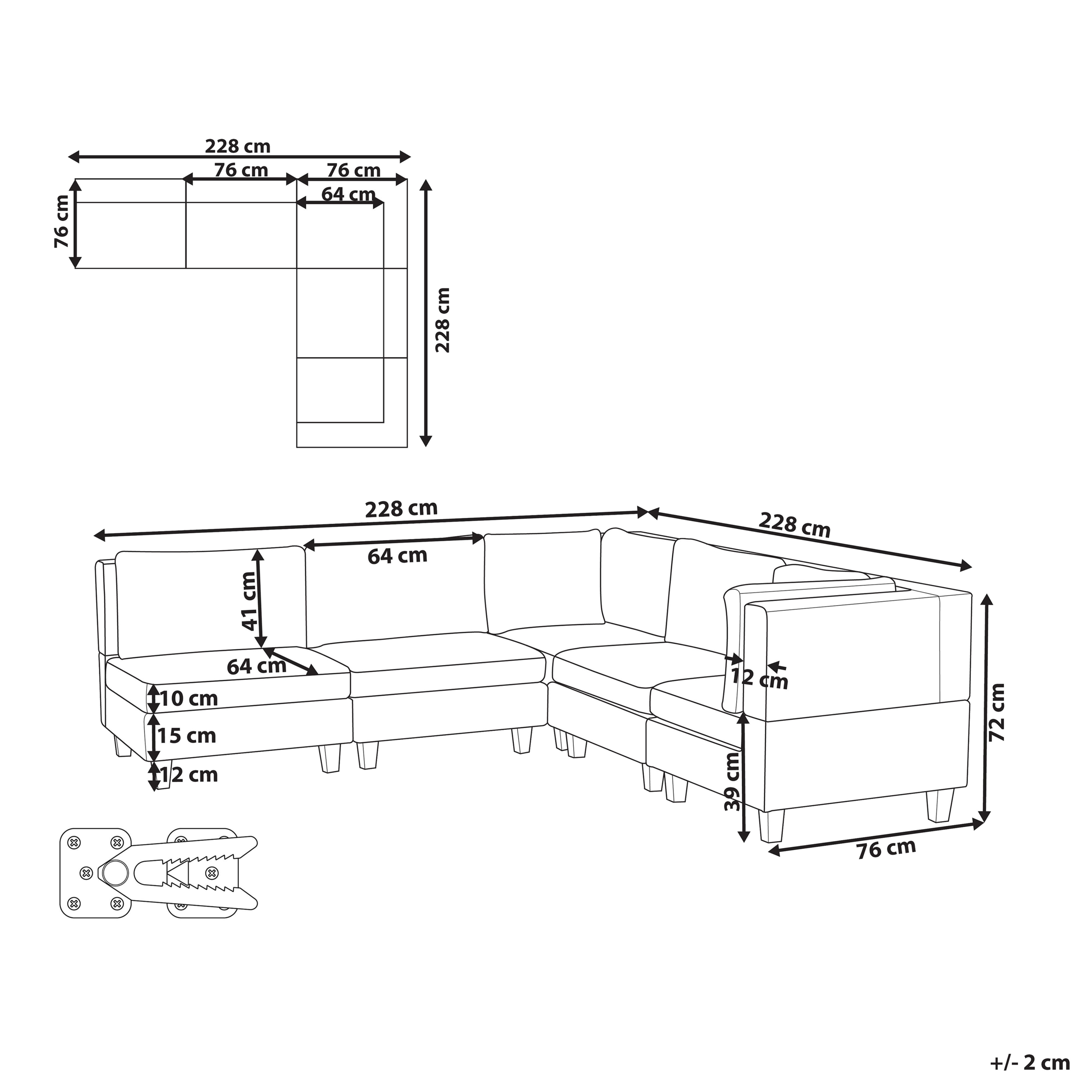 Skandinaavinen modulaarinen kulmasohva. Tämä moduulikulmasohva on upea, monikäyttöinen lisä jokaiseen olohuoneeseen. Se koostuu viidestä moduuliosasta, jotka voidaan yhdistää toisiinsa klassiseksi 5-istuttavaksi kulmasohvaksi tai käyttää erillisinä istuimina. Miellyttävän tuntuisella polyesterikankaalla verhoiltu sohva on erittäin kestävä. Paksusti pehmustetut istuinosat ja selkänojat tarjoavat erinomaisen istumamukavuuden. Koko rakenne on myös vakaa leveiden mustien jalkojen ansiosta.
