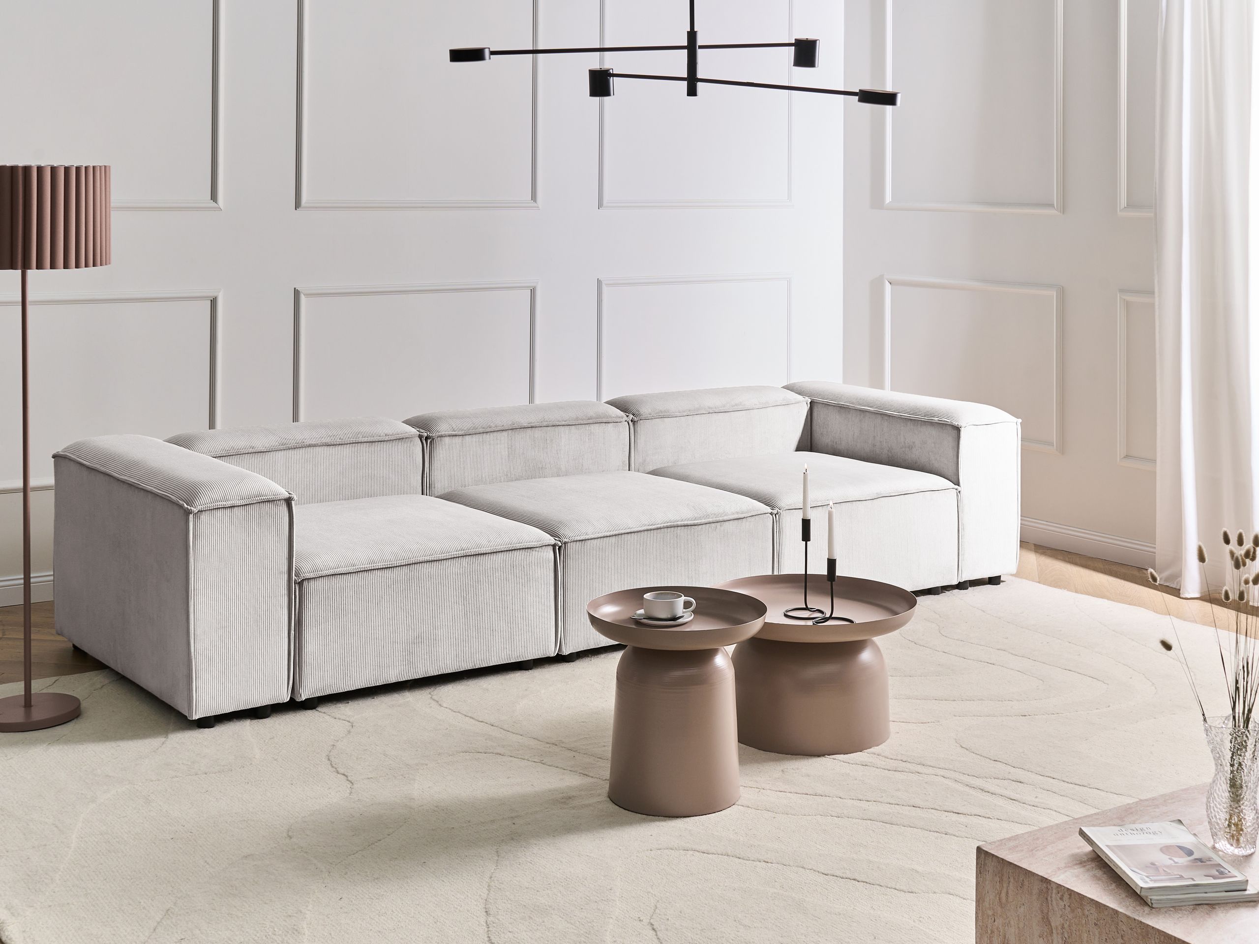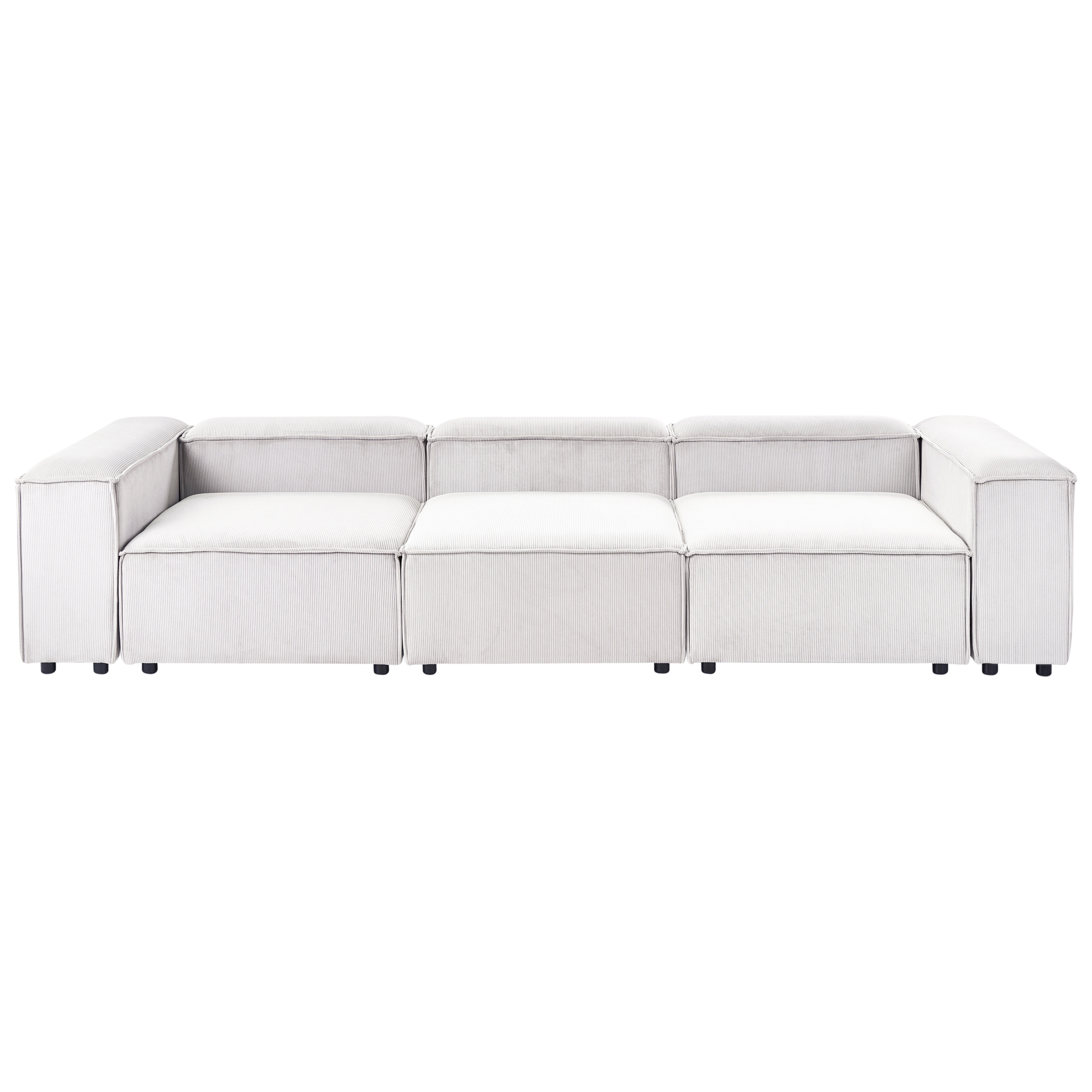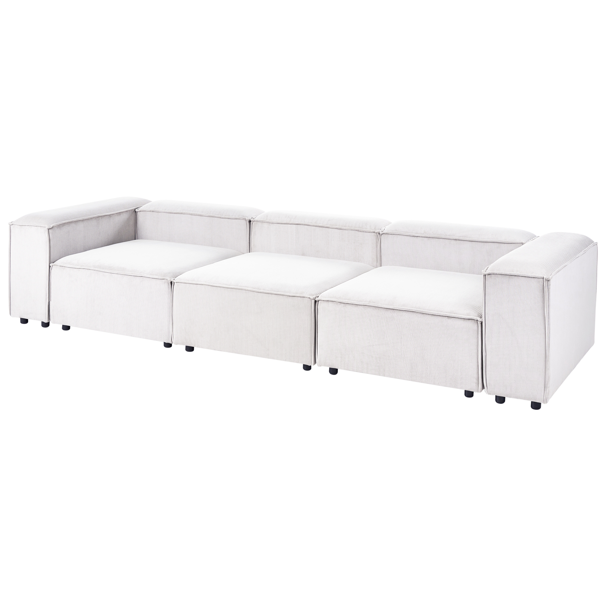 Moderni kolmiosainen sohva. Päivitä olohuoneen sisustusta ja tee sitä kodin tyylikkäin oleskelupaikka tällä moduulisohvalla. Pehmeällä ja laadukkaalla vakosametilla verhoillussa sohvassa on kestävä puurakenne ja tukevat mustat synteettiset jalat. Herttainen luonnonvalkoinen sävy saa sen sulautumaan täydellisesti mihin tahansa moderniin tai perinteiseen sisustukseen. Moduulisohva koostuu kolmesta moduulielementistä, jotka voidaan asettaa yhteen tai erikseen ainutlaatuisten kokonaisuuksien luomiseksi.