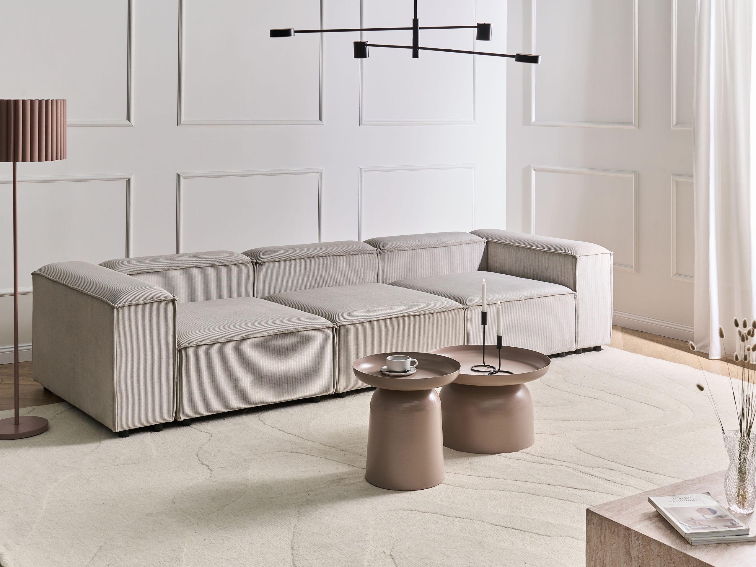 Moderni kolmiosainen sohva. Päivitä olohuoneen sisustusta ja tee sitä kodin tyylikkäin oleskelupaikka tällä moduulisohvalla. Pehmeällä ja laadukkaalla vakosametilla verhoillussa sohvassa on kestävä puurakenne ja tukevat mustat synteettiset jalat. Herttainen ruskeanharmaa sävy saa moduulisohvan sulautumaan täydellisesti mihin tahansa moderniin tai perinteiseen sisustukseen. Moduulisohva koostuu kolmesta moduulielementistä, jotka voidaan asettaa yhteen tai erikseen ainutlaatuisten kokonaisuuksien luomiseksi.