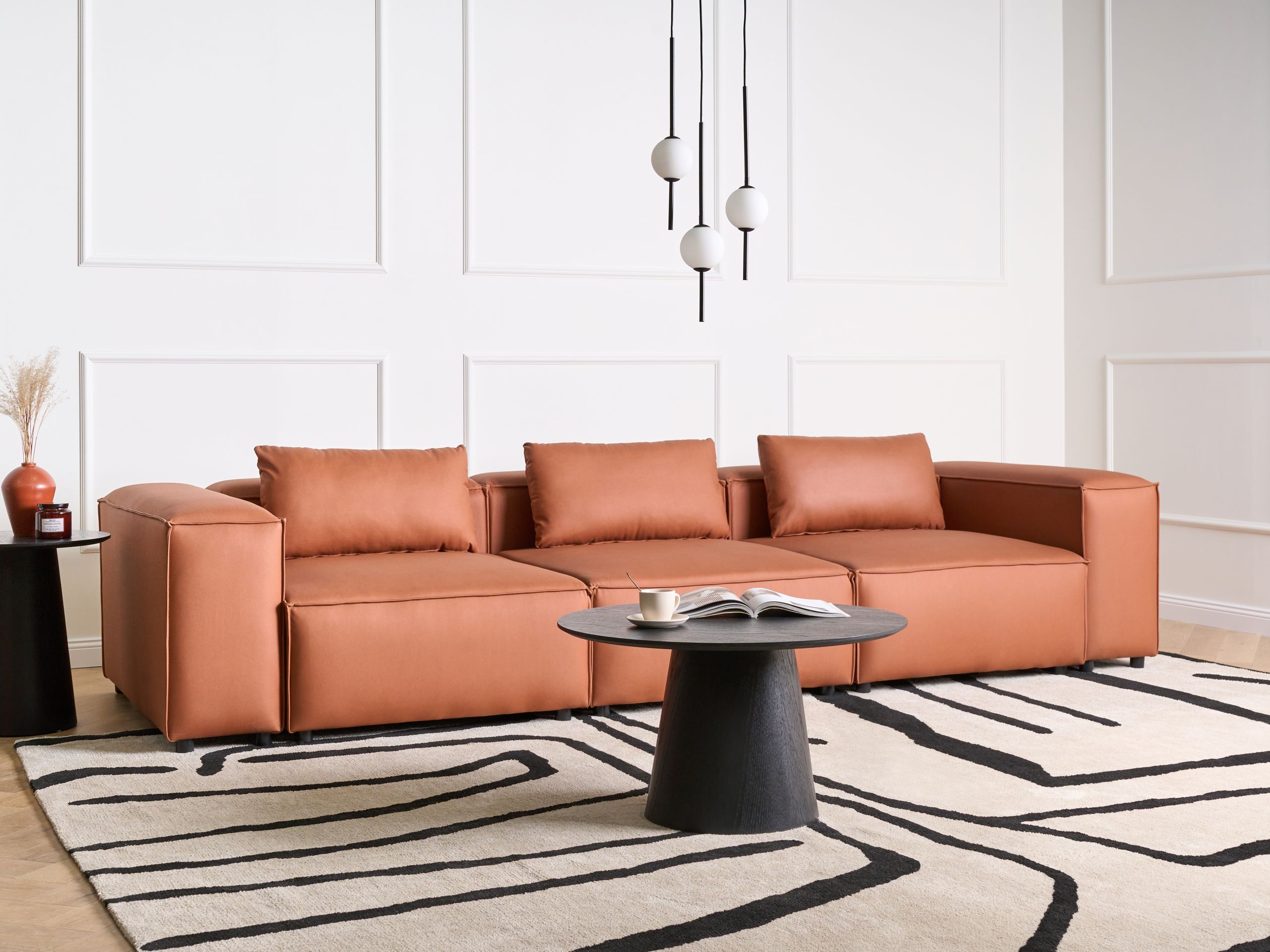 Moderni modulaarinen sohva koristetyynyillä. Tämä päivittäiseen rentoutumiseen suunniteltu 3-istuttava moduulisohva tarjoaa runsaasti tilaa istumiseen, oleskeluun ja jopa loikoiluun. Leveä istuinalue, jota täydentävät kolme pehmeää koristetyynyä, takaa optimaalisen mukavuuden pitkiin iltoihin ja rentoihin kokoontumisiin. Sohva on verhoiltu laadukkaalla vegaanisella ekonahalla, joka on helppohoitoinen ja kulutusta kestävä. Se koostuu kolmesta modulaarisesta osasta, jotka voidaan järjestää joustavasti eri kokoonpanoihin – yhdessä tai erikseen. Sohva on tyylikäs ja toimiva keskipiste moderniin olohuoneeseen, käytettiinpä sitä sitten lukemiseen, television katseluun tai vieraiden viihdyttämiseen.