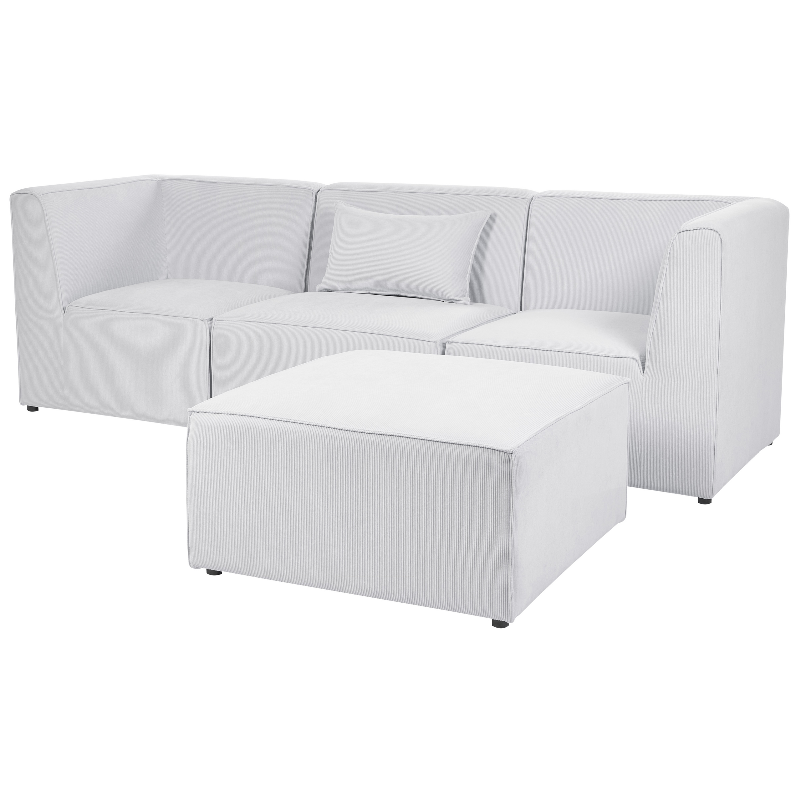 Tyylikäs ja mukava moduulisohva rahilla. Tee olohuoneesta tyylikäs ja huoliteltu tällä minimalistisen modernilla moduulisohvalla. Sen pehmeän tuntuisen vakosamettiverhoilun uurteet antavat sohvalle kauniin ulkonäön, kun taas muovijalat takaavat vakauden ja tukevuuden. Se koostuu kolmesta moduuliosasta, jotka voidaan asettaa yhteen tai erikseen erilaisten kokonaisuuksien muodostamiseksi. Mukana tulee monikäyttöinen rahi, jota voidaan käyttää niin lisäistuimena, jalkatukena kuin pöytänäkin. Koristetyynyssä on irrotettava päällinen, joka mahdollistaa helpon puhdistuksen ilman huolta tahroista.
