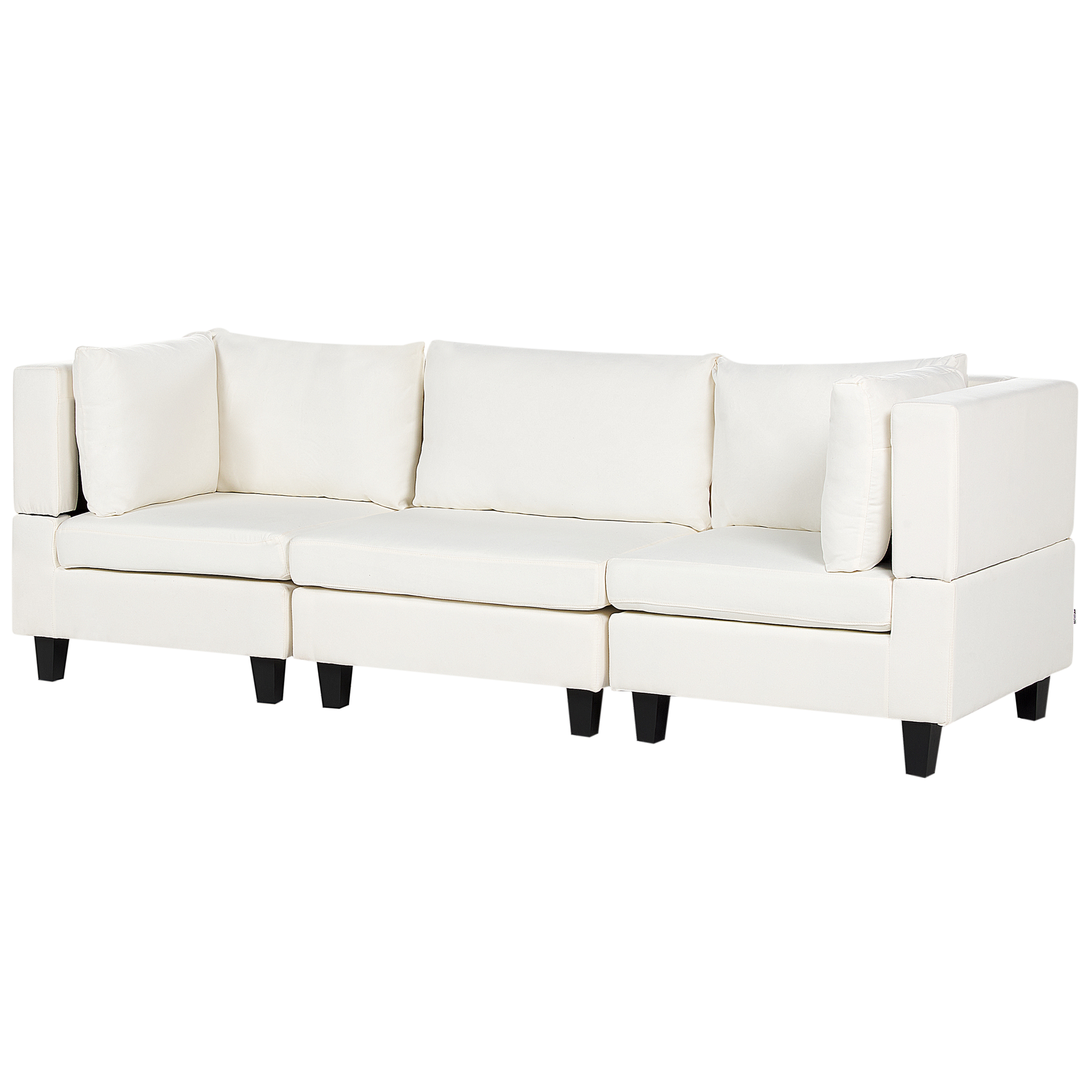 Skandinaavinen modulaarinen sohva. Tämä moduulisohva on upea, monikäyttöinen lisä jokaiseen olohuoneeseen. Se koostuu kolmesta moduuliosasta, jotka voidaan yhdistää toisiinsa klassiseksi 3-istuttavaksi sohvaksi tai käyttää erillisinä istuimina. Miellyttävän tuntuisella polyesterikankaalla verhoiltu sohva on erittäin kestävä. Paksusti pehmustetut istuinosat ja selkänojat tarjoavat erinomaisen istumamukavuuden. Koko rakenne on myös vakaa leveiden mustien jalkojen ansiosta.