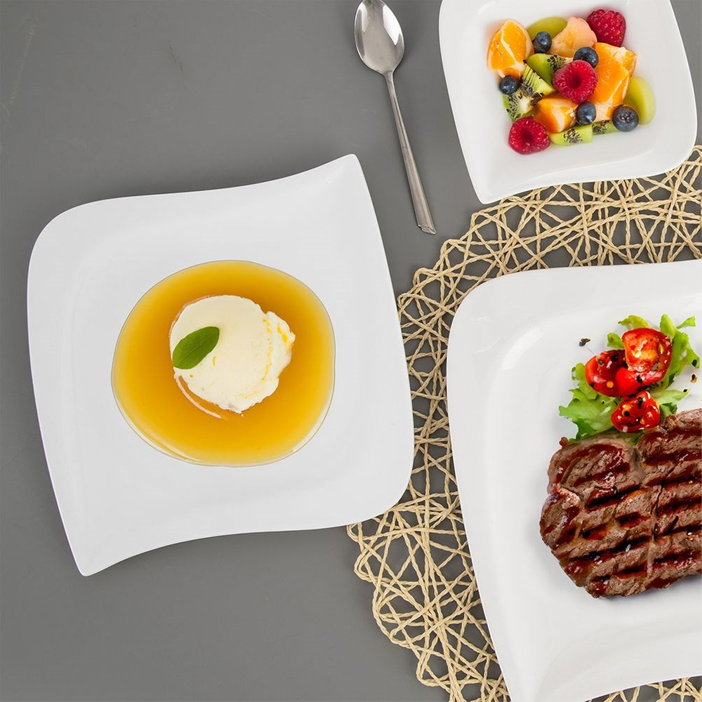 MODERNI MUOTOILU - Suunniteltu muodikkaassa valkoisessa värimaailmassa. Lautanen on elegantti, epäsäännöllinen neliön muotoinen ja siinä on kevyesti pyöristetyt reunat. Se näyttää kauniilta pöydällä muiden astioiden rinnalla.